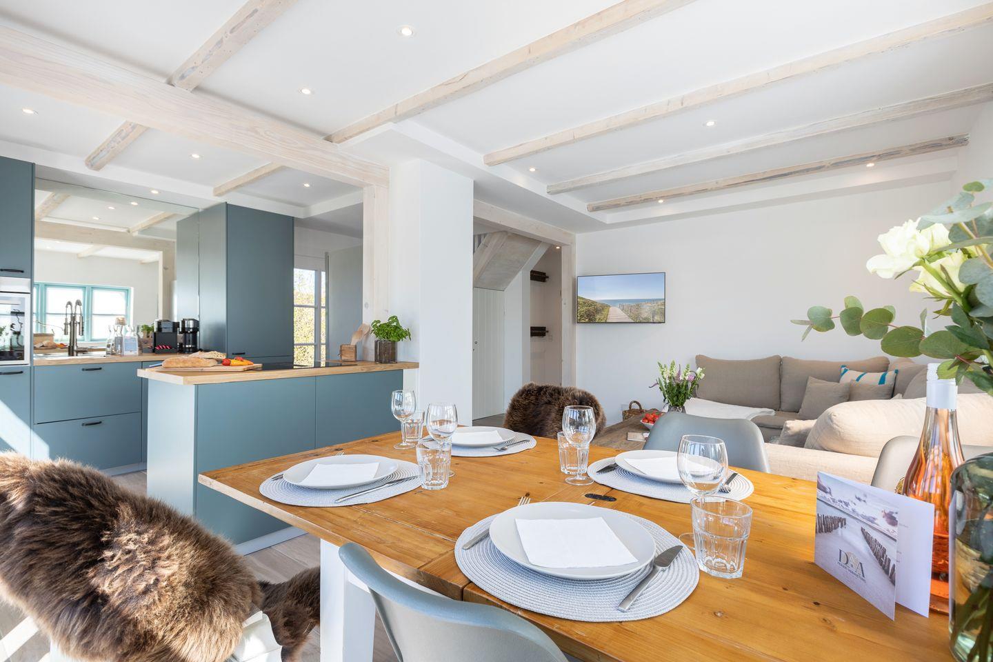 Der lichtdurchflutete Wohn- und Essbereich bildet das Herzstück des Hauses. Die offene Küche, hochwertig ausgestattet inklusive Nespresso-Maschine, macht das gemeinsame Kochen zum Vergnügen. Warme Naturtöne, rustikale Holzelemente und harmonisch abgestimmte Farben verleihen dem gesamten Haus eine einladende Atmosphäre. Dank dimmbarer Beleuchtung können Sie jederzeit die perfekte Stimmung schaffen.