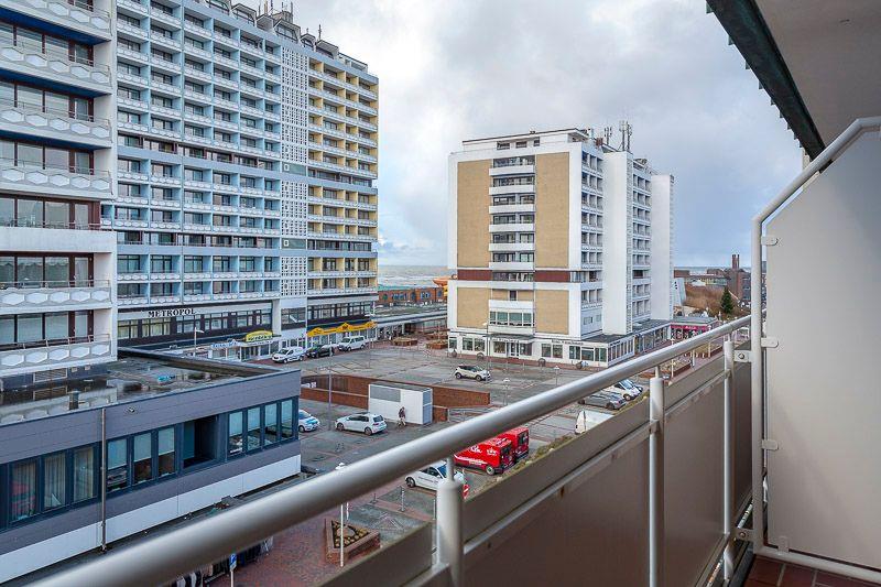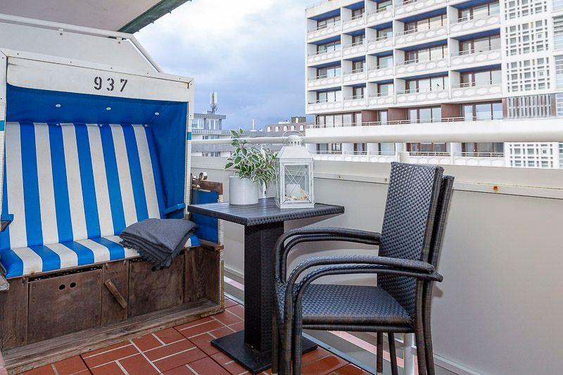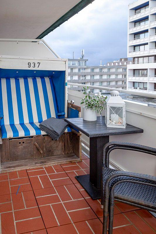 Direkte Strandlage, sonniger großer Balkon, mit kleinem Meerblick.