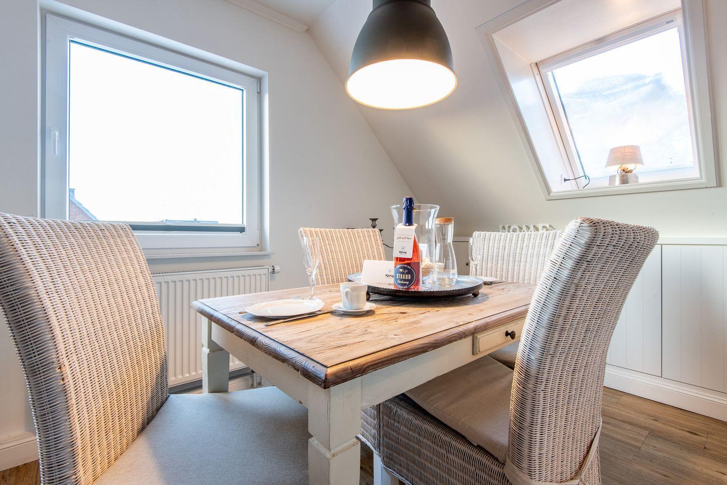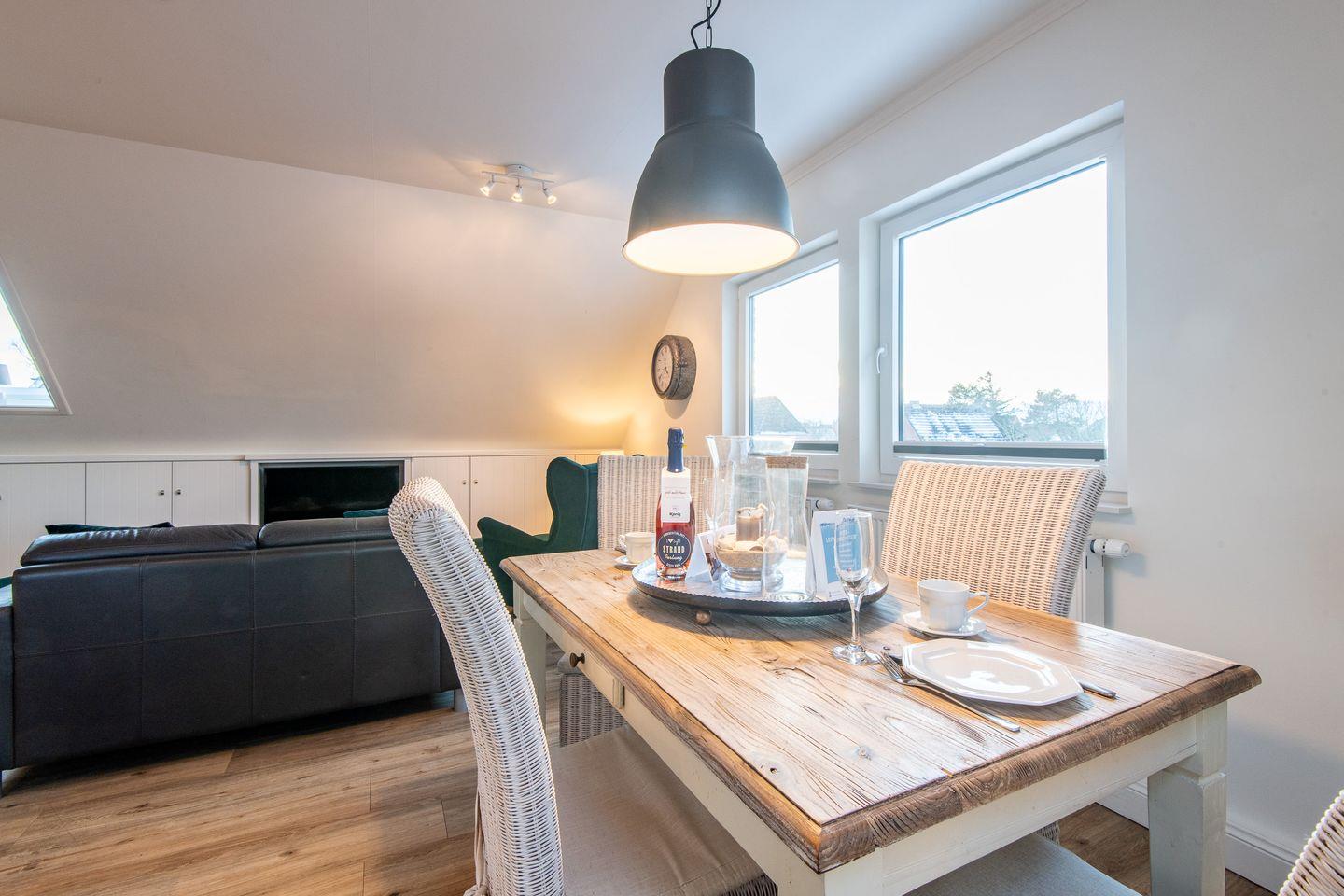 Der großzügige Wohnbereich ist mit einem modernen Sofa und einem TV ausgestattet, ideal für gemütliche Abende nach einem Tag am Strand. Der angrenzende Essbereich bietet ausreichend Platz für zwei Personen. Ein besonderes Highlight der Wohnung ist die sonnige Terrasse mit einem Strandkorb, auf der Sie die frische Nordseeluft genießen können.