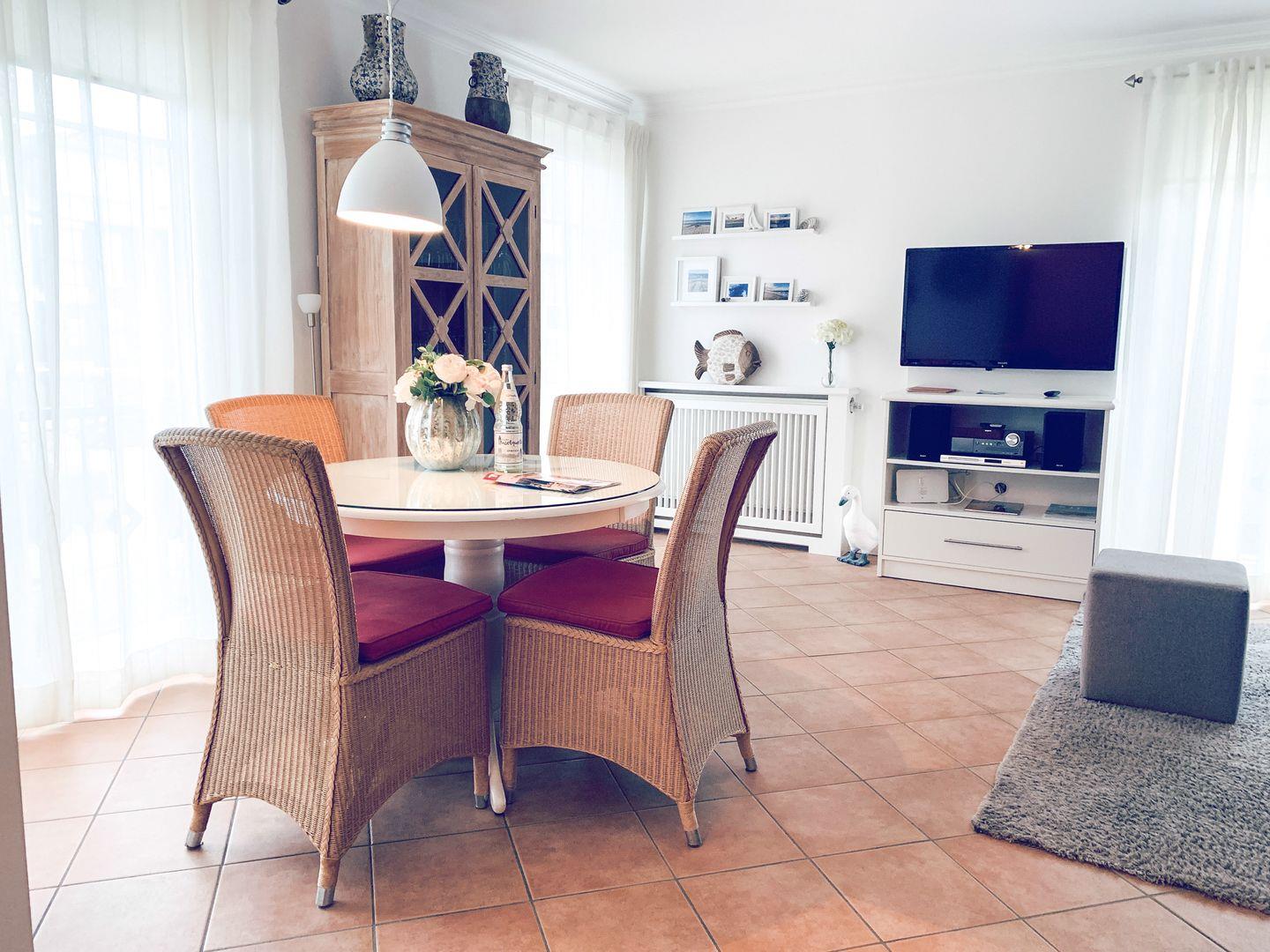 Vom Vorflur gelangen Sie in das Wohnzimmer, mit Sofa und Sessel, Esstisch mit Stühle und eine offennen gut ausgestatteten Küche.