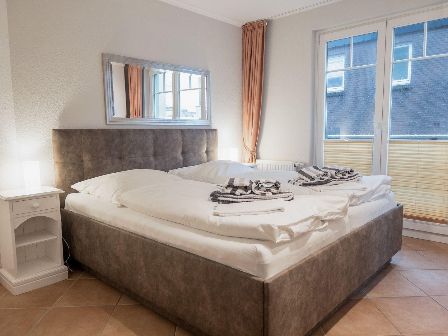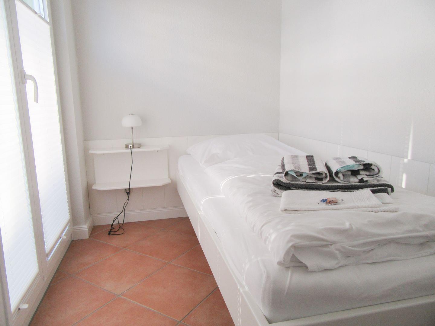 und das kleine Schlafzimmer. Ein Strandkorb findet sich dort ganzjährig.