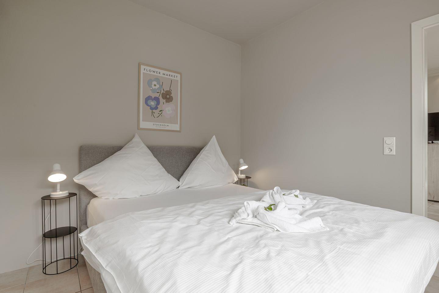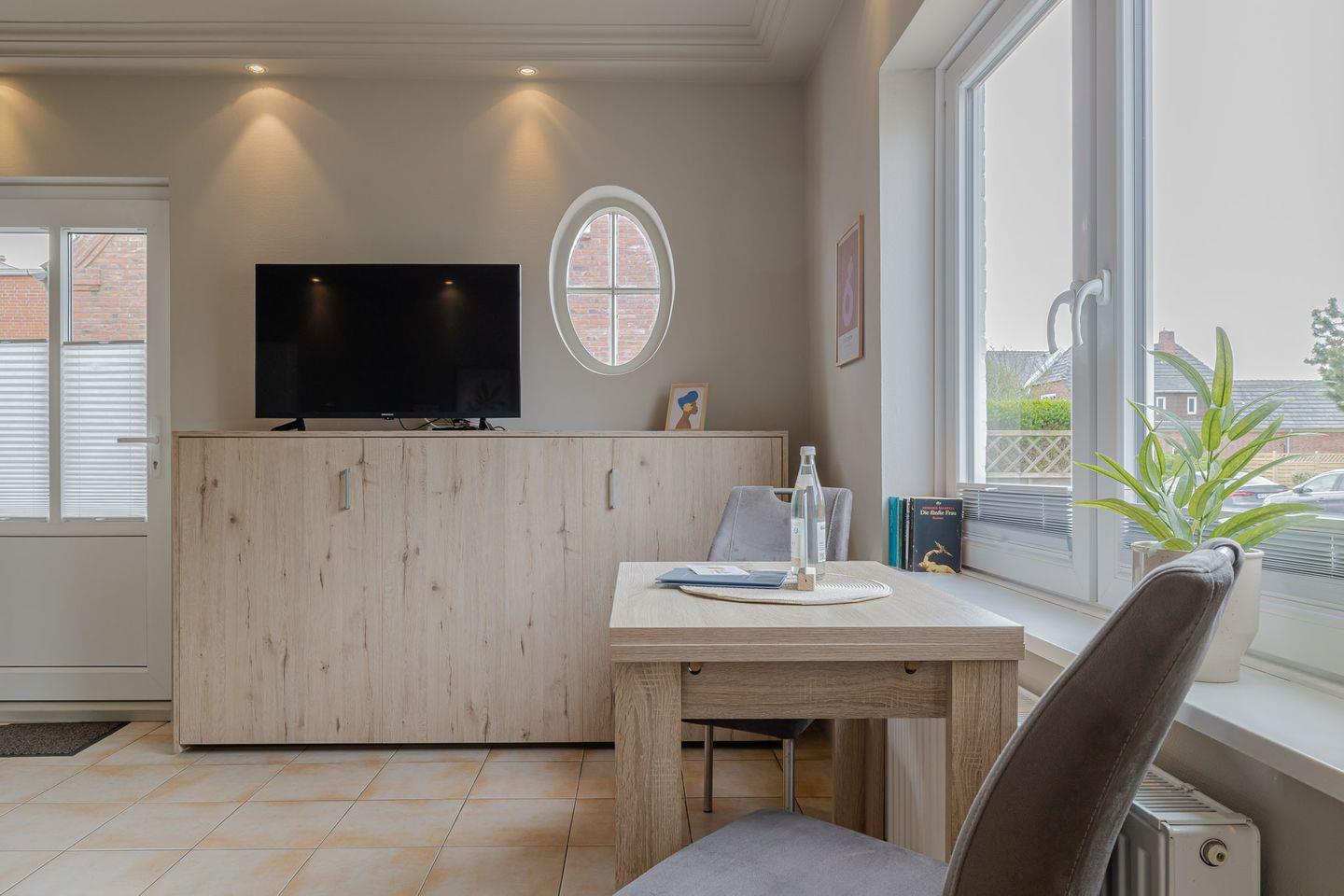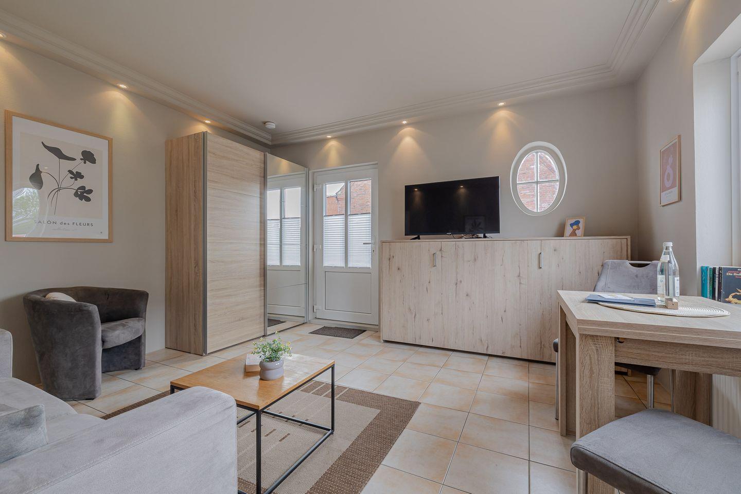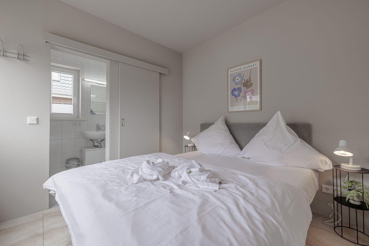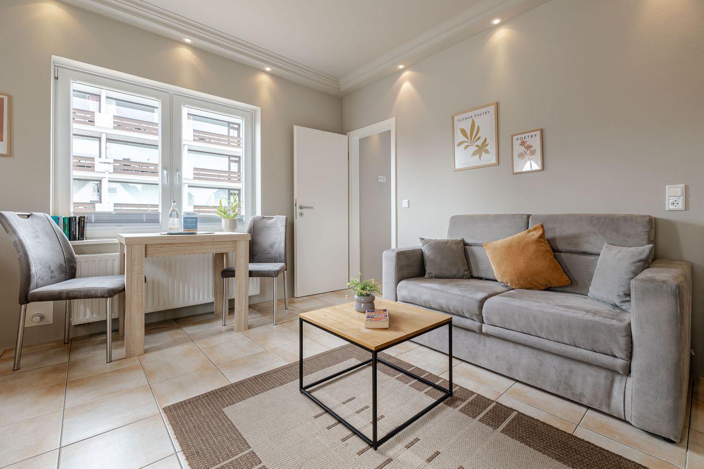 Die kleine Terrasse (Südlage) führt direkt in den gemütlichen und in hellen Farben gehaltenen Wohnbereich mit Couch und Essecke. Von dort aus geht es in die kleine, aber gut ausgestattet Küche. Das Schlafzimmer verfügt über ein bequemes Boxspringbett mit angrenzendem Duschbad.