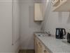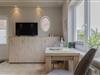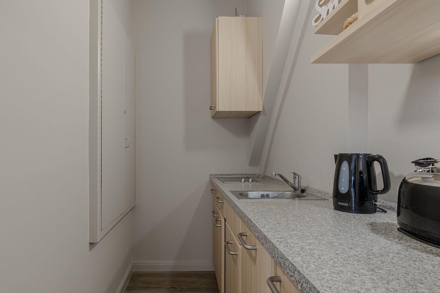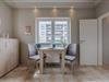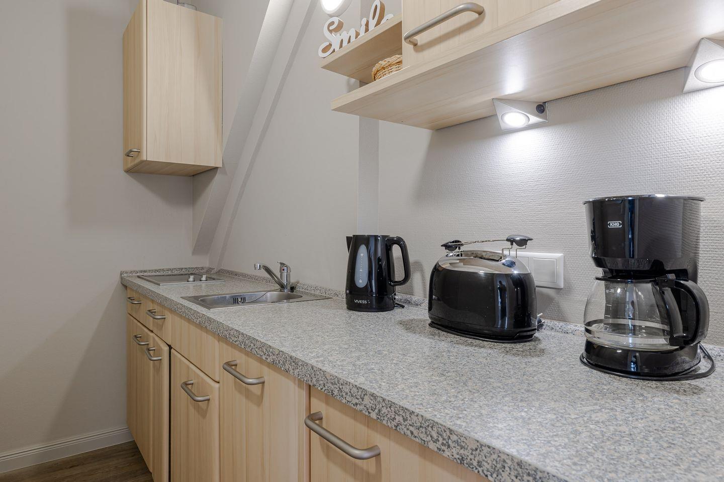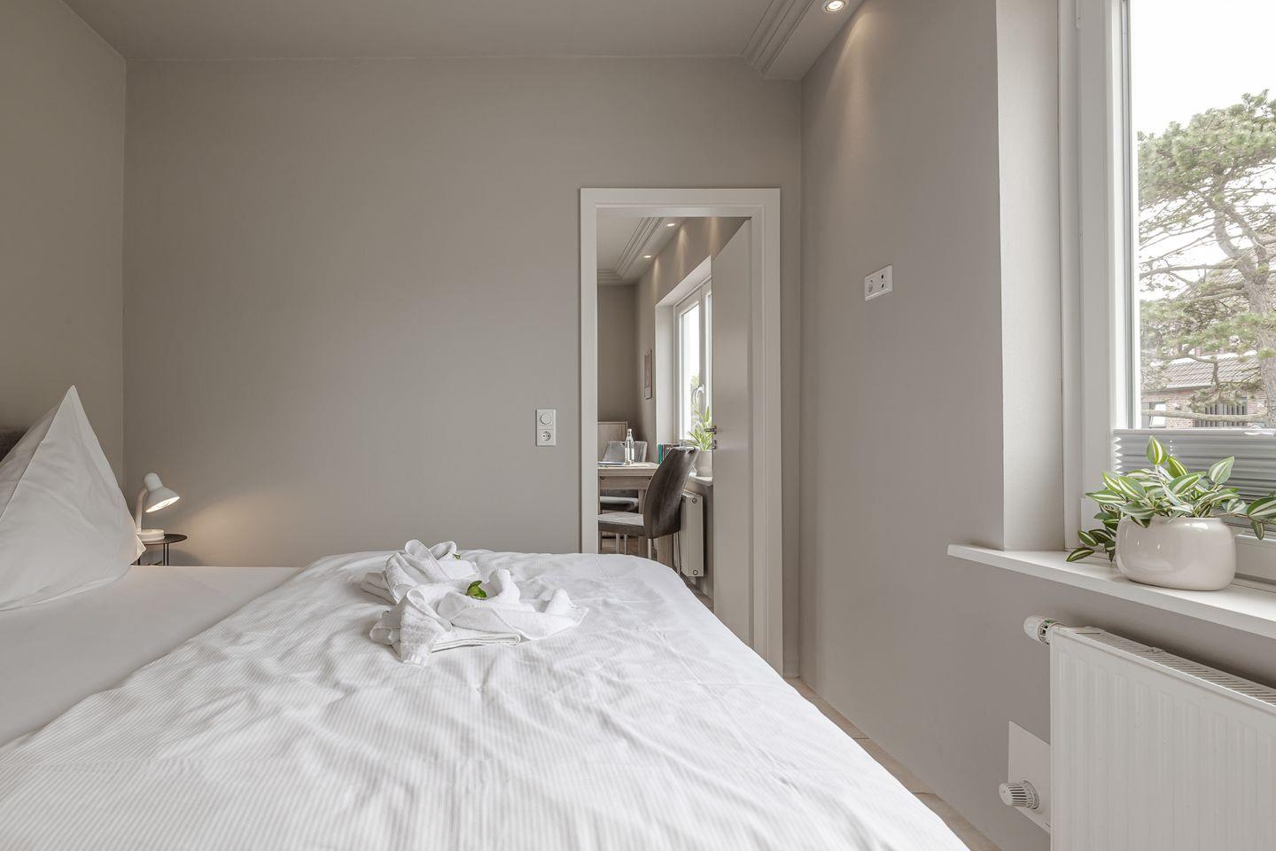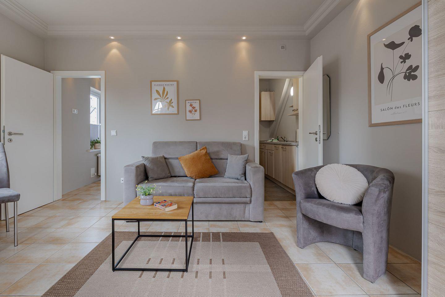 Die kleine Terrasse (Südlage) führt direkt in den gemütlichen und in hellen Farben gehaltenen Wohnbereich mit Couch und Essecke. Von dort aus geht es in die kleine, aber gut ausgestattet Küche. Das Schlafzimmer verfügt über ein bequemes Boxspringbett mit angrenzendem Duschbad.