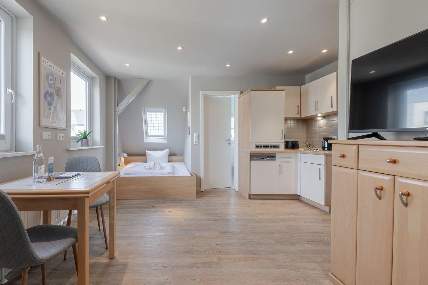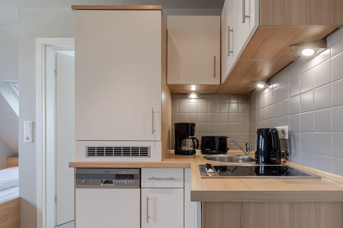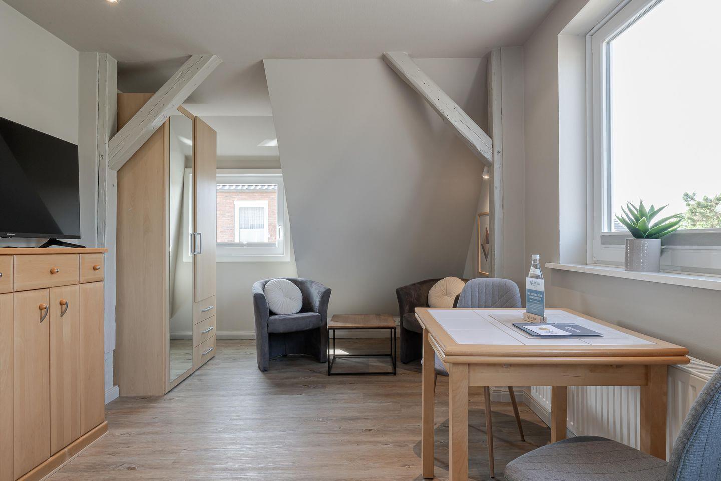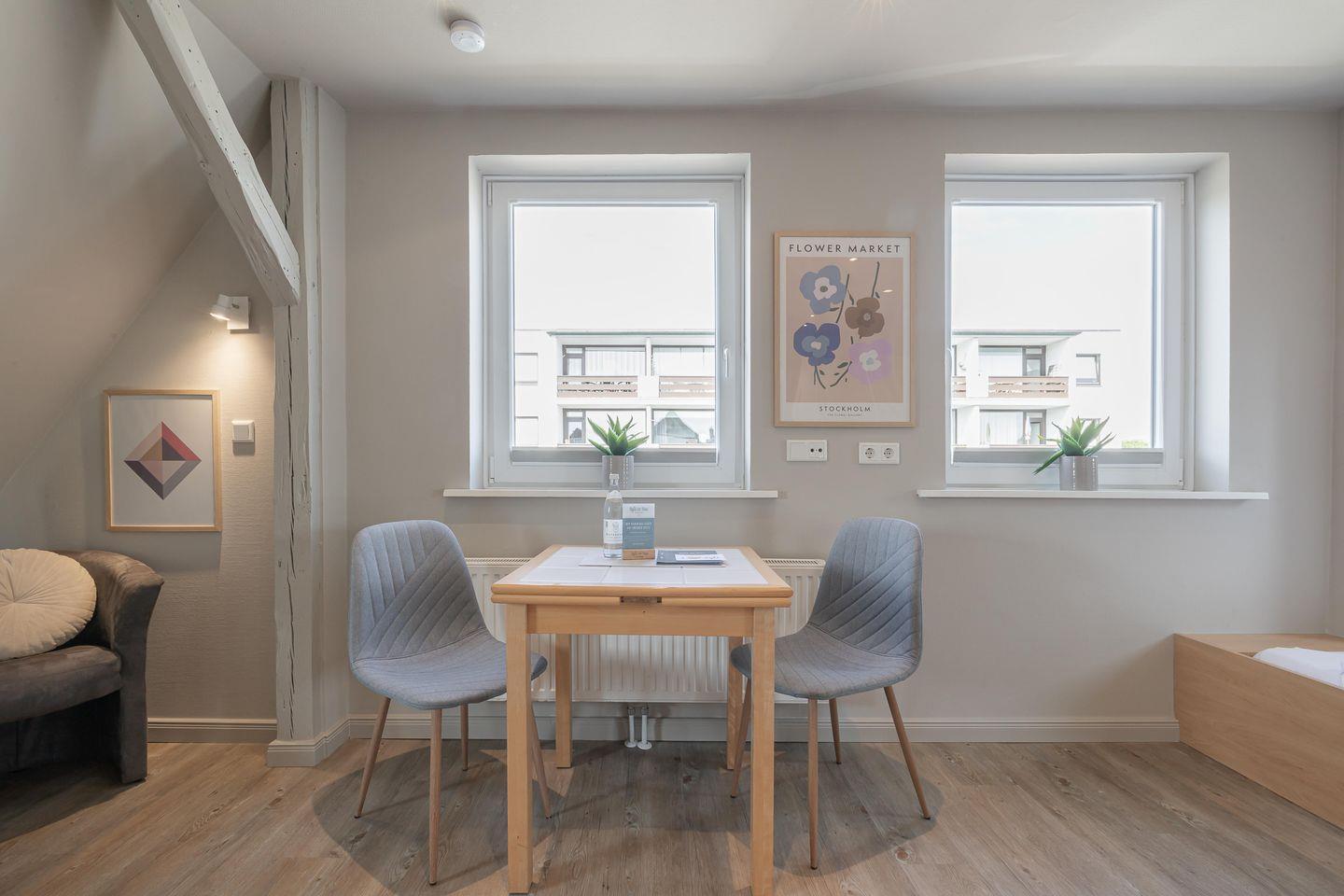 Das schicke und gut geschnittene Appartement verfügt über einen kombinierten Wohn-/Schlafbereich mit zwei Sesseln, einem kleinen Esstisch sowie einer gut ausgestatteten Küchenzeile. Das gemütliche Doppelbett liegt kojenartig unter der Dachschräge. Zur Wohnung gehört eine kleine Terrasse mit Strandkorb mitten im Garten.