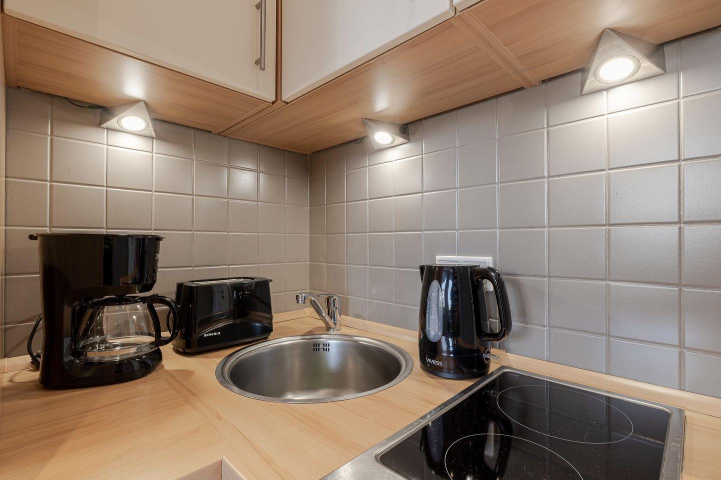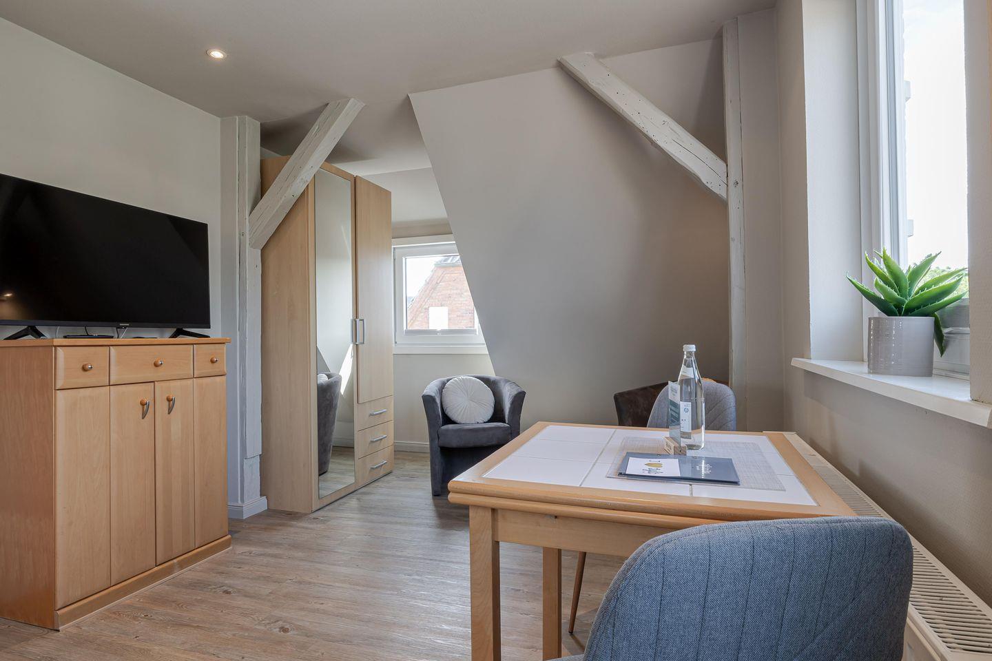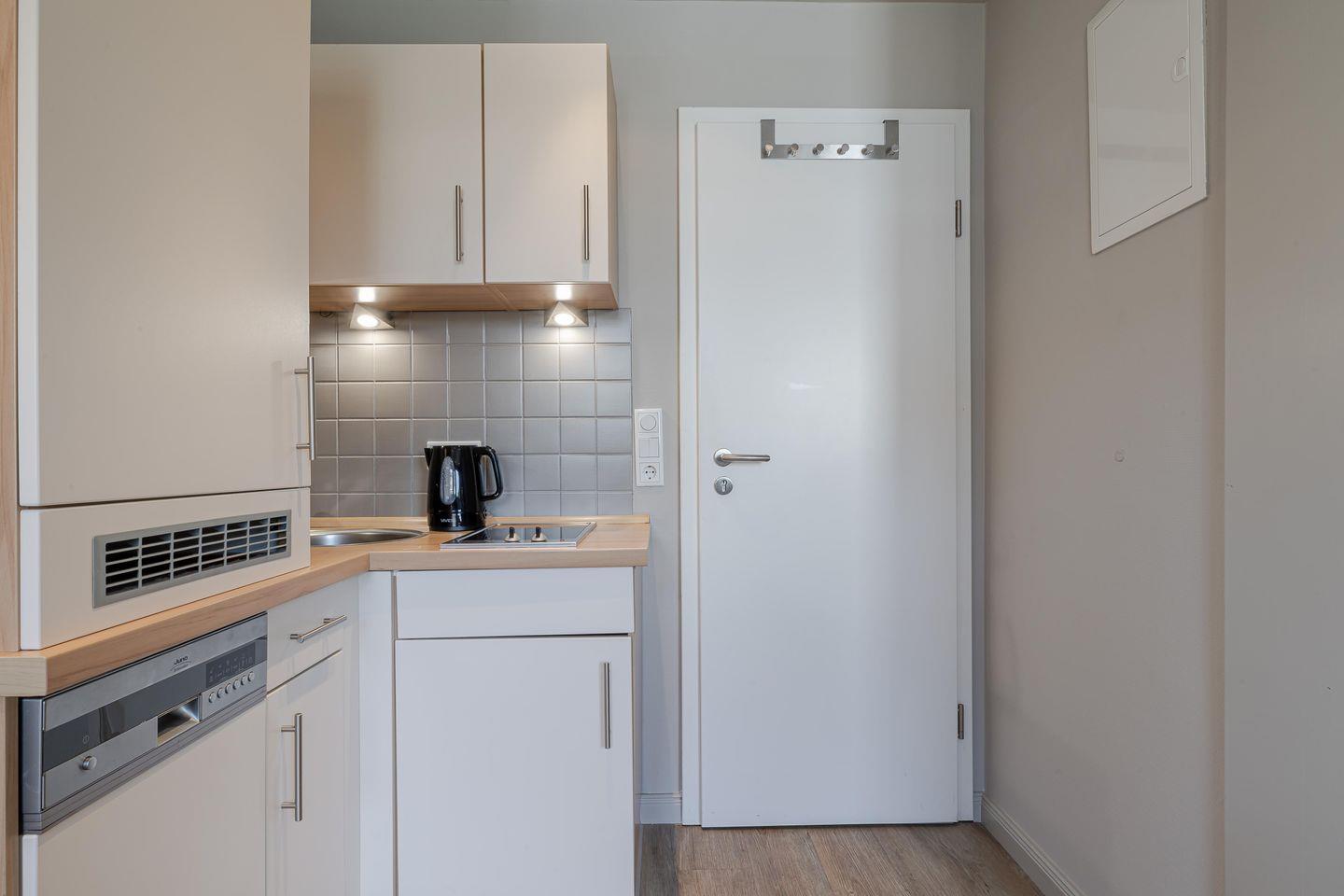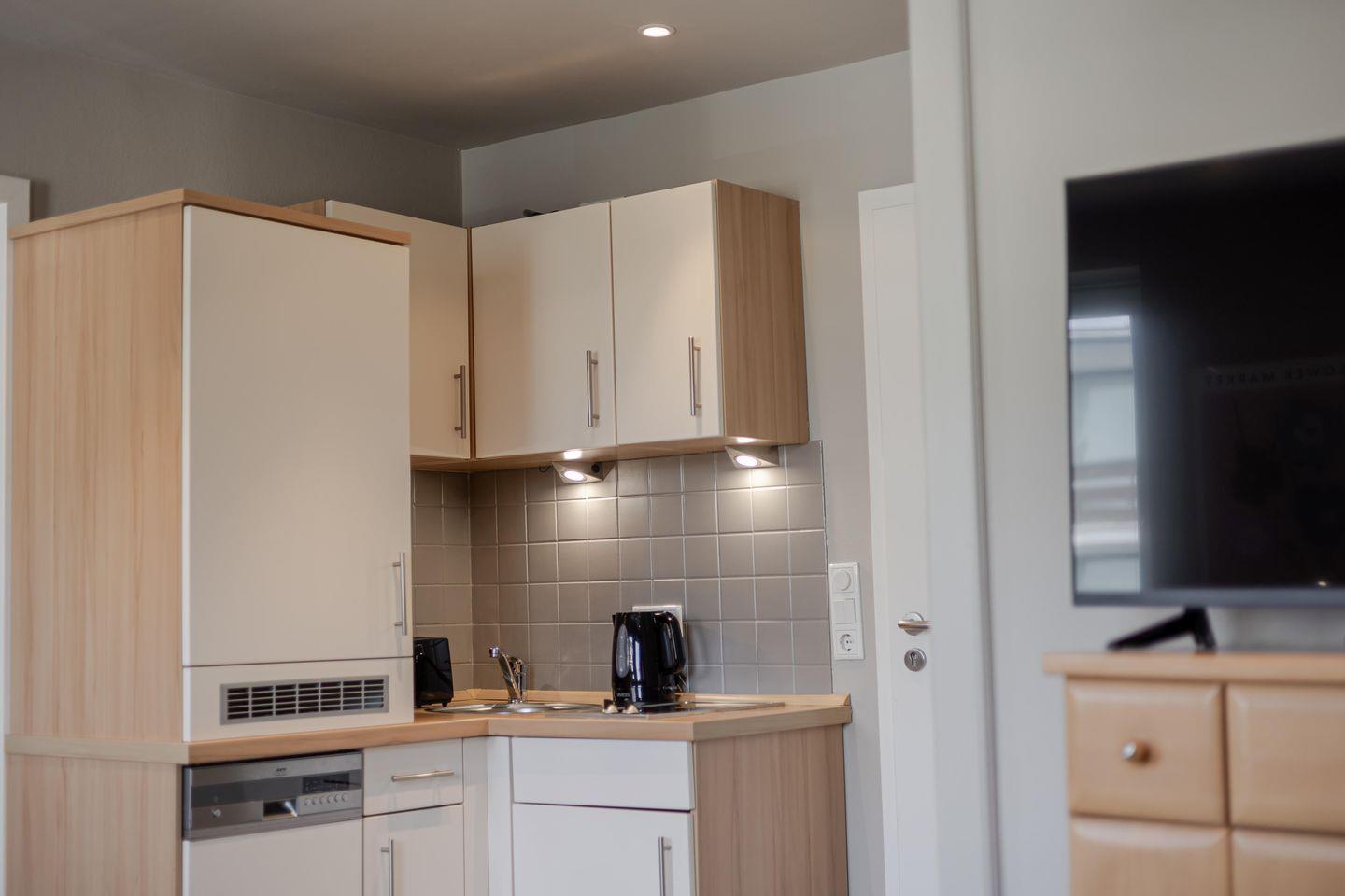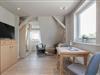 Das schicke und gut geschnittene Appartement verfügt über einen kombinierten Wohn-/Schlafbereich mit zwei Sesseln, einem kleinen Esstisch sowie einer gut ausgestatteten Küchenzeile. Das gemütliche Doppelbett liegt kojenartig unter der Dachschräge. Zur Wohnung gehört eine kleine Terrasse mit Strandkorb mitten im Garten.