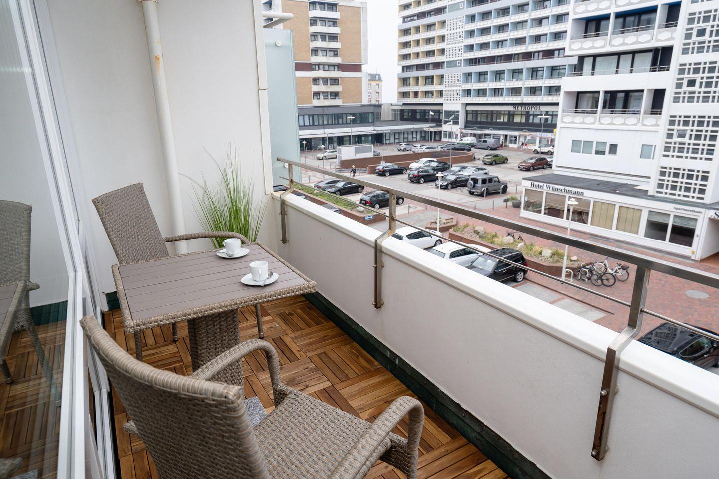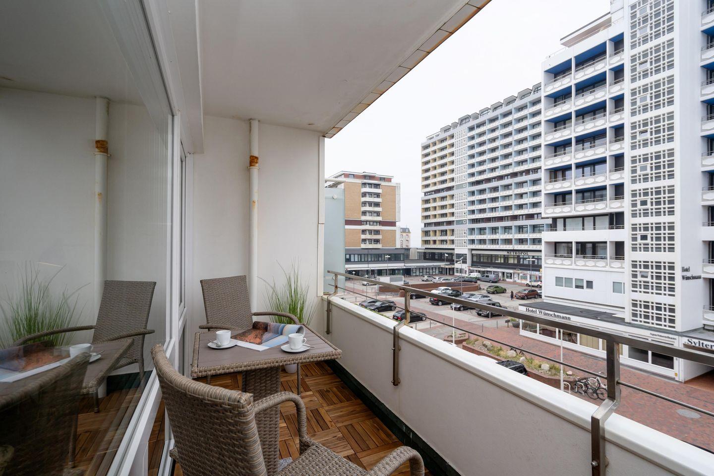 Charmante Ferienwohnung für bis zu 2 Personen mit schönem Balkon in stadt- und strandnaher Lage von Westerland. Inklusive WLAN, (kleinem) zugehörigem PKW-Stellplatz sowie Fahrstuhl.