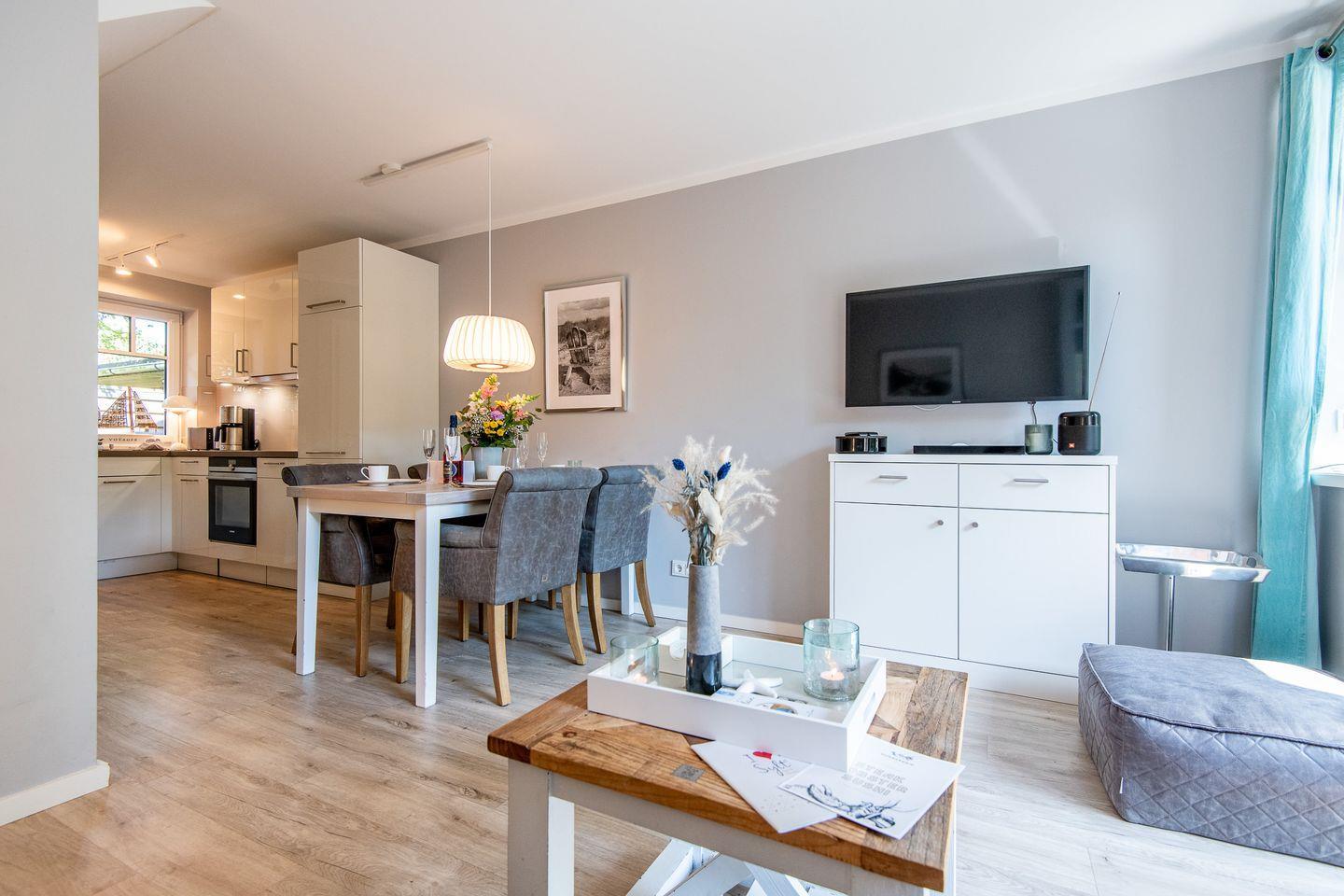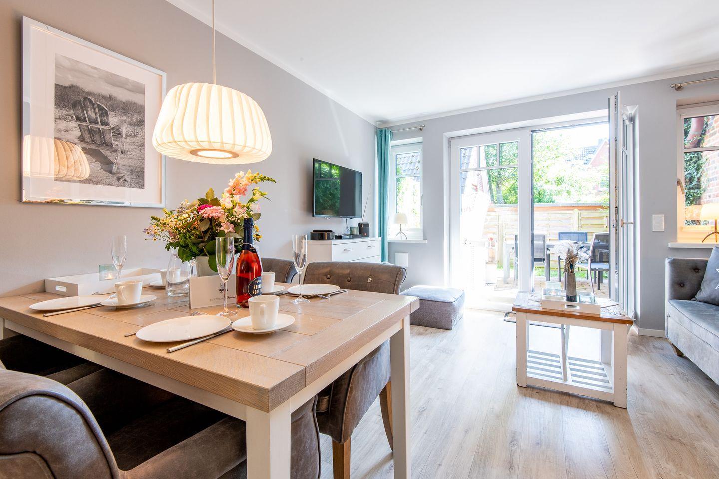 Das gemütliche Wohn- und Esszimmer lädt mit einer bequemen Couch und einem TV zum Entspannen ein. Große Fenster lassen viel Licht herein und bieten Zugang zur nach Süden ausgerichteten Terrasse. Diese komplett eingezäunte Terrasse bietet Ihnen einen Strandkorb (saisonaler Verleih von April bis Oktober) sowie bequeme Gartenmöbel – perfekt für sonnige Nachmittage oder entspannte Grillabende an der frischen Nordseeluft.