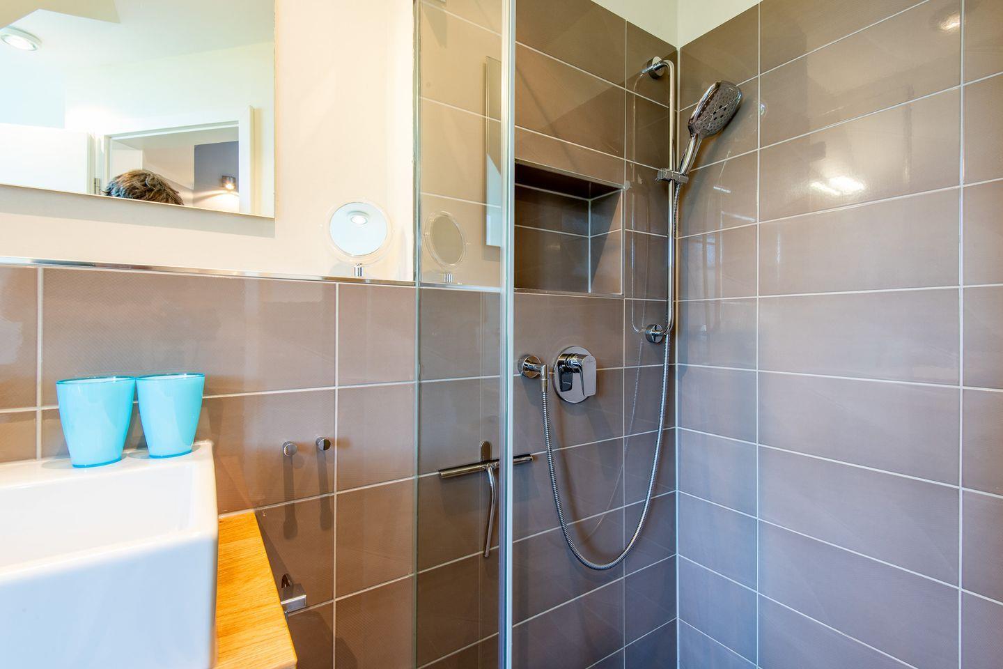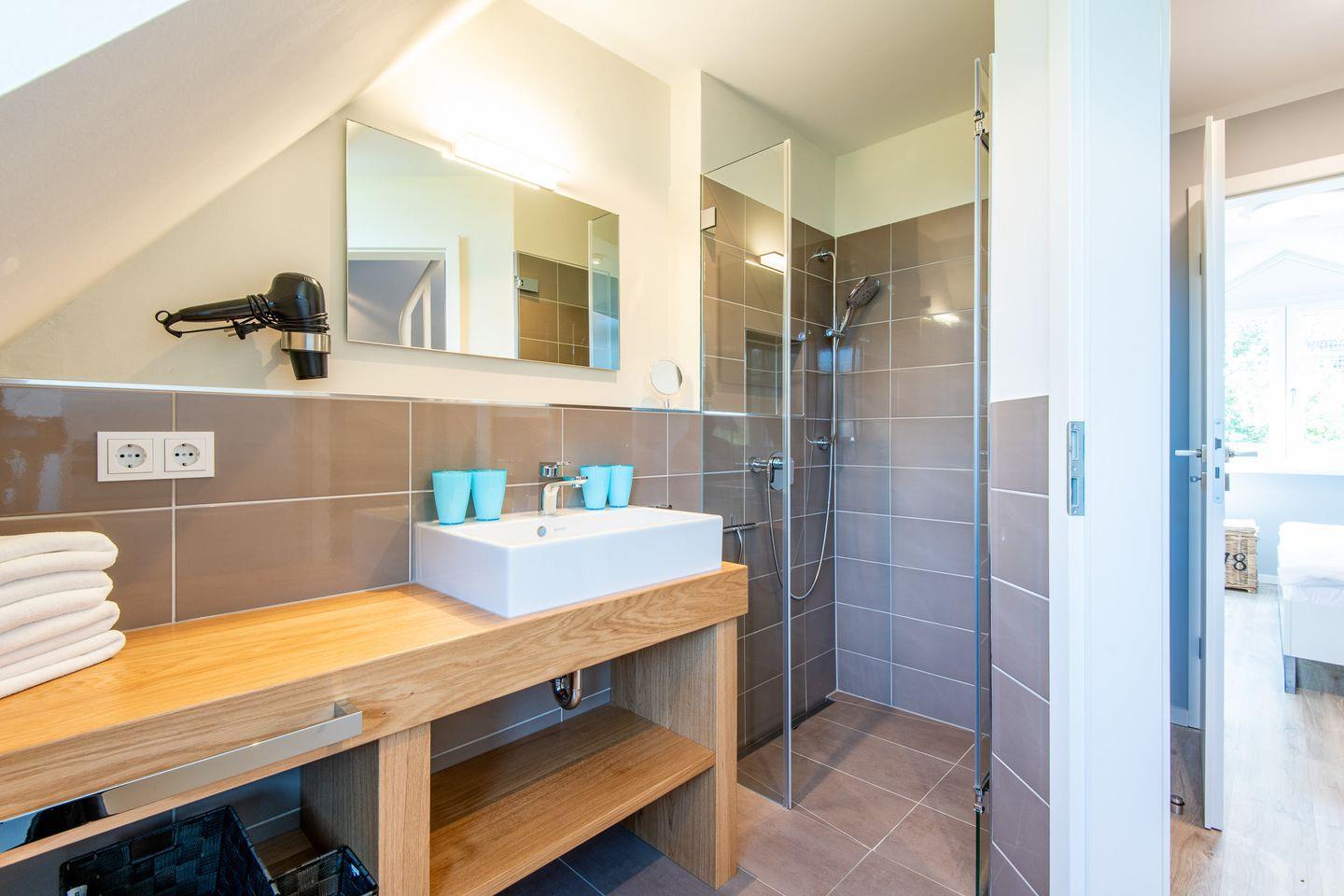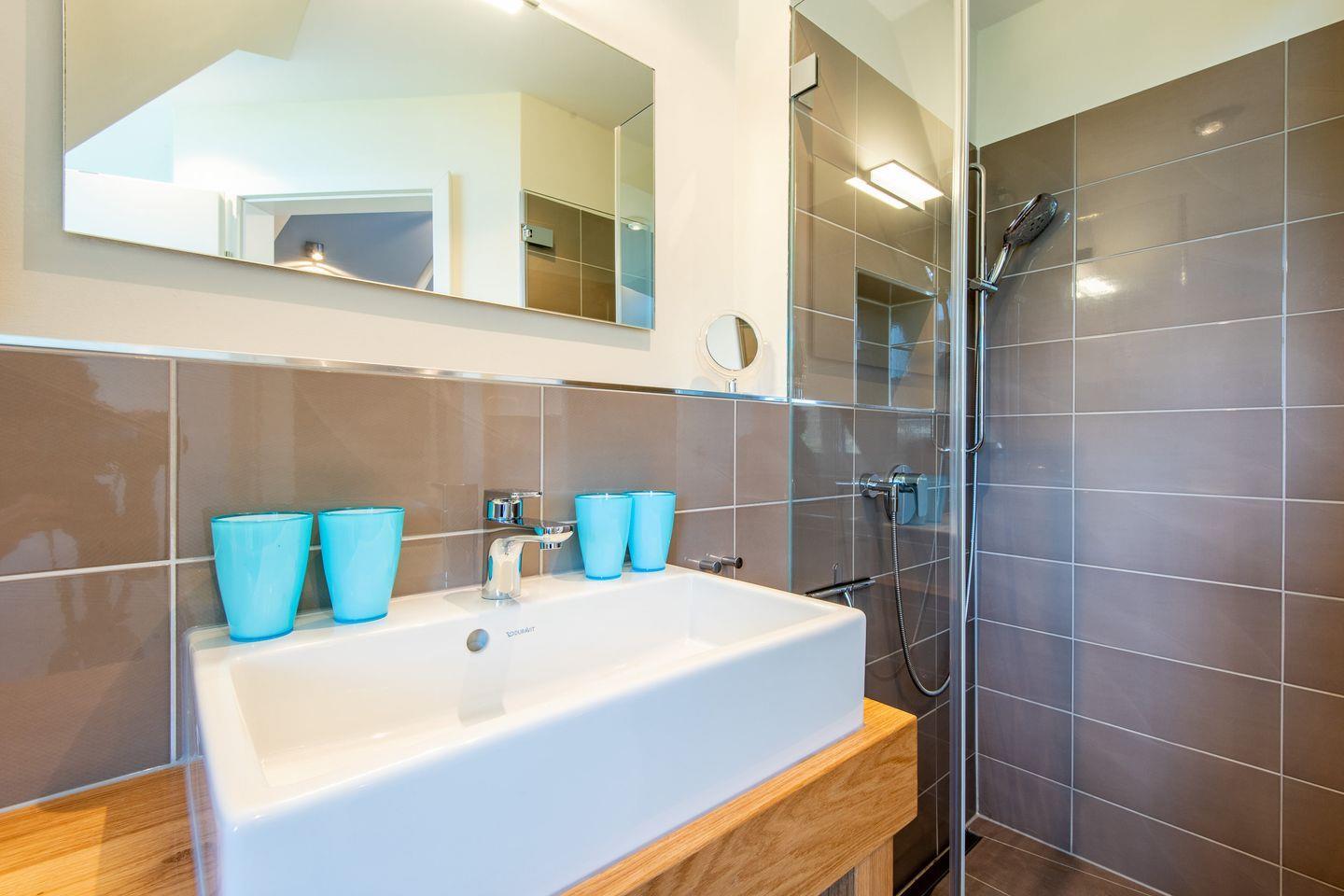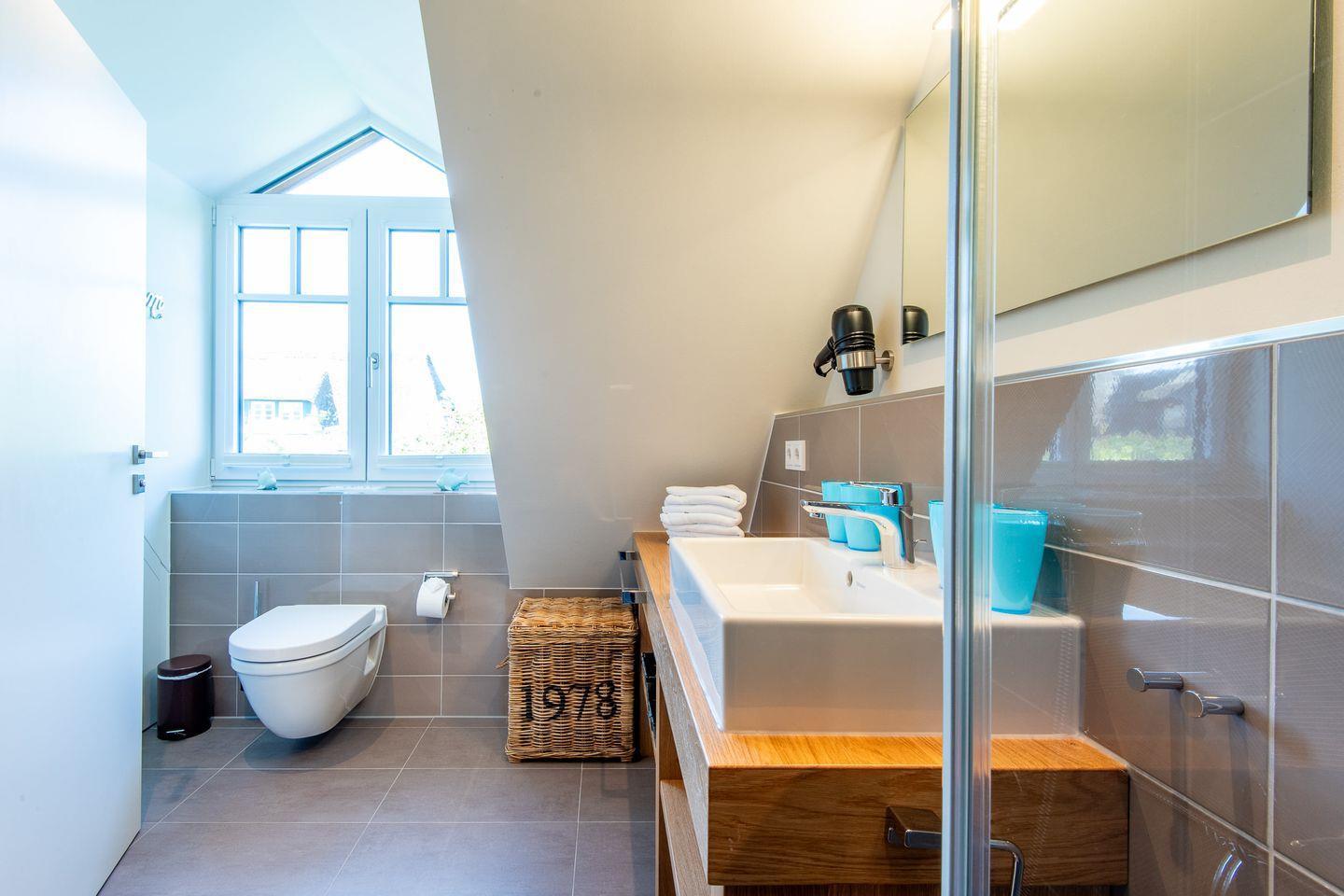 Das moderne Badezimmer verfügt über eine ebenerdige Dusche und einen praktischen Waschtrockner. Zudem gibt es im Erdgeschoss ein separates Gäste-WC für zusätzlichen Komfort.