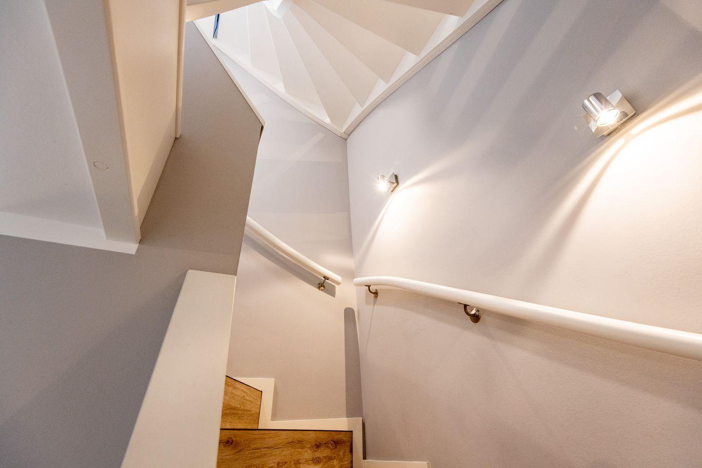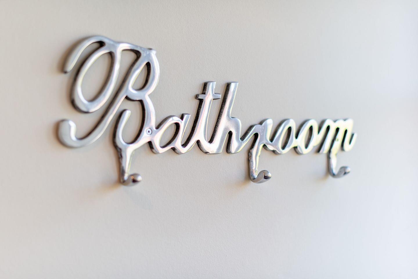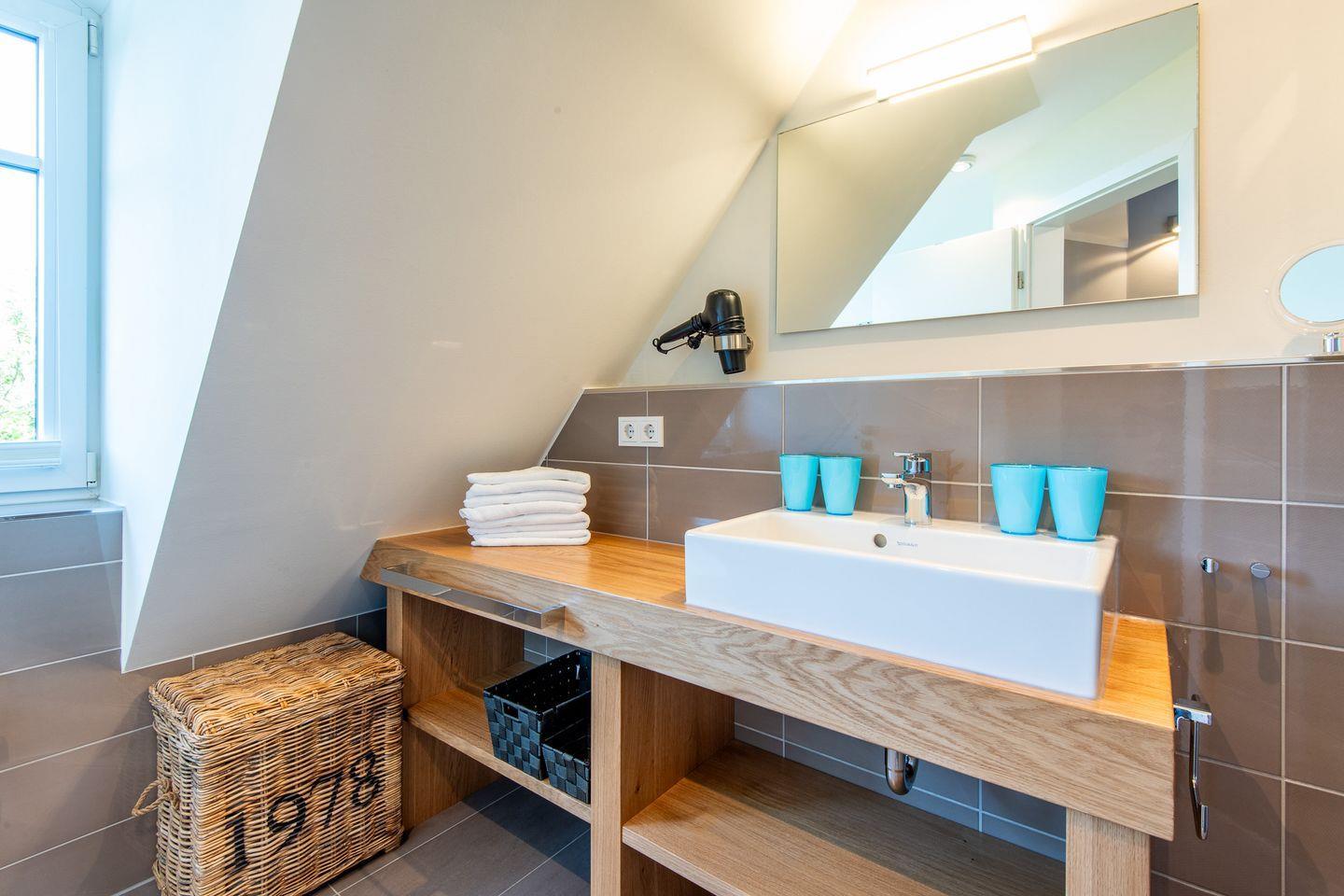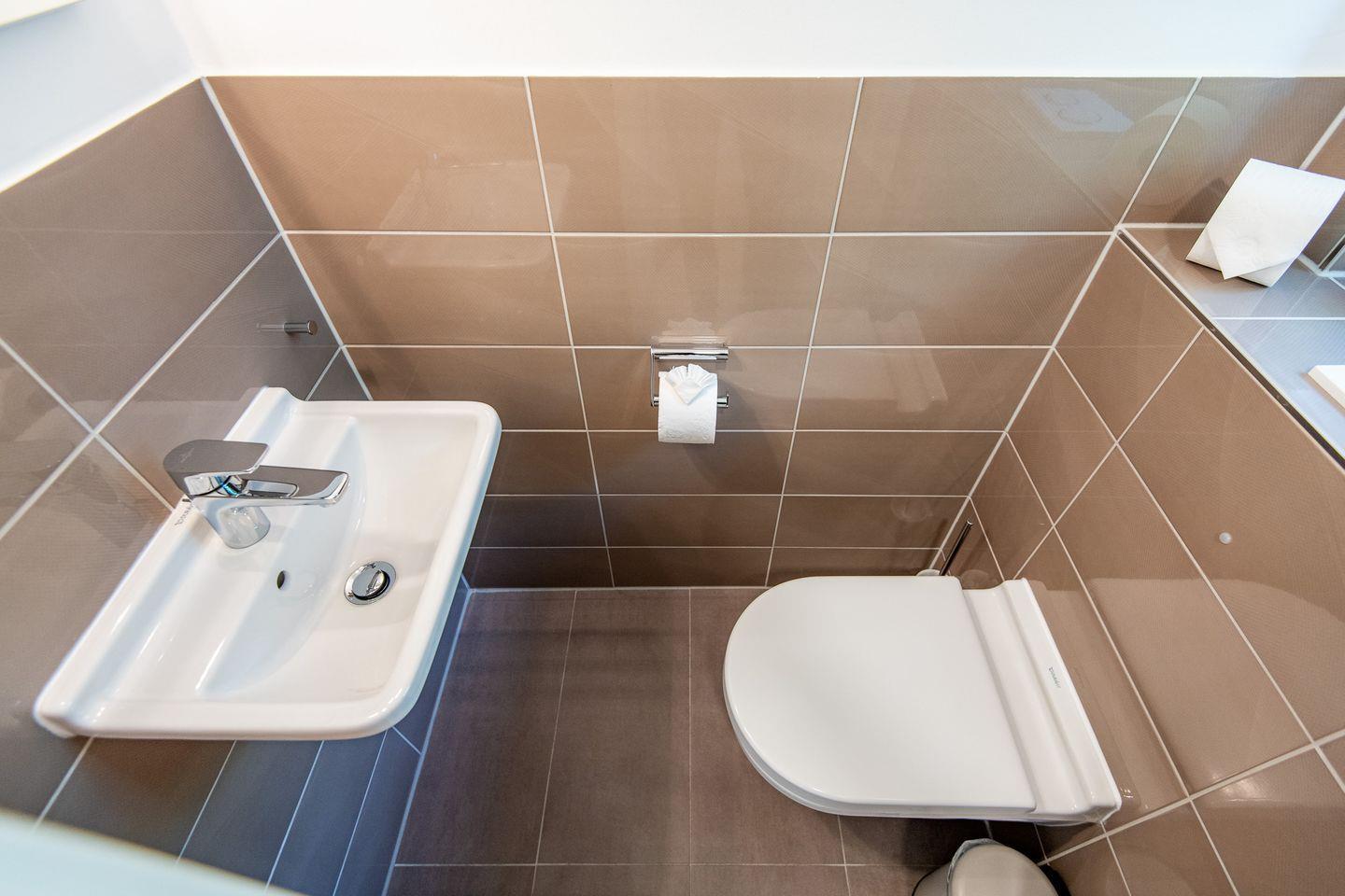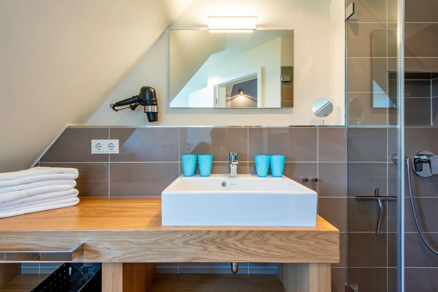 Das moderne Badezimmer verfügt über eine ebenerdige Dusche und einen praktischen Waschtrockner. Zudem gibt es im Erdgeschoss ein separates Gäste-WC für zusätzlichen Komfort.