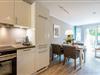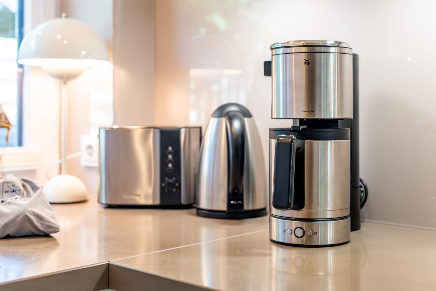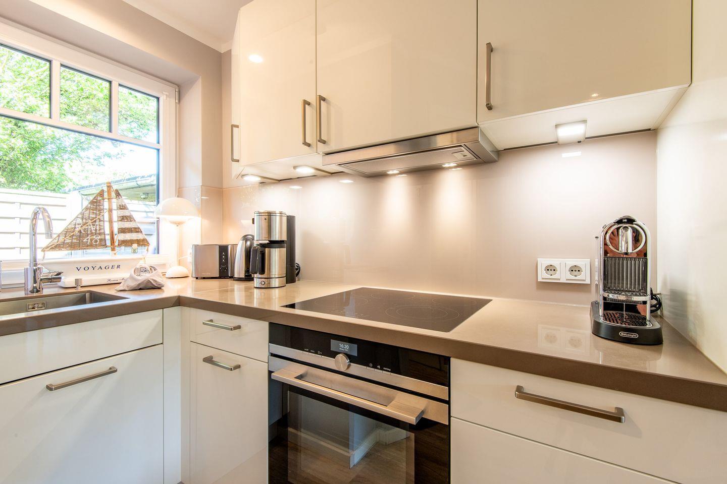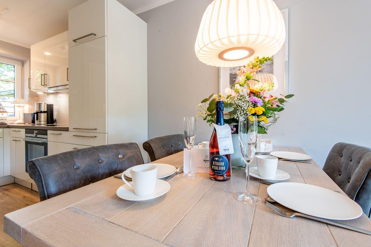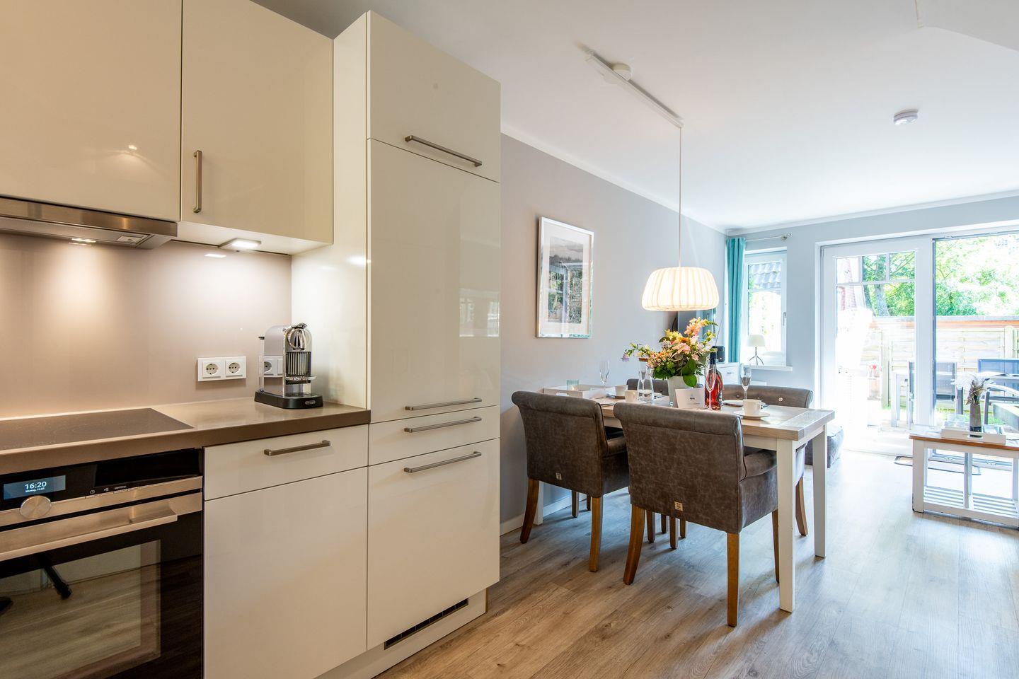 Die offene Wohnküche ist hochwertig ausgestattet und bietet alles, was Sie zur Zubereitung köstlicher Mahlzeiten benötigen. Neben modernen Markengeräten steht Ihnen eine Nespresso-Kapselmaschine zur Verfügung, um den Tag mit einer Tasse frisch gebrühten Kaffee zu beginnen. Der angrenzende Essbereich lädt zu gemeinsamen Mahlzeiten oder geselligen Abenden ein.