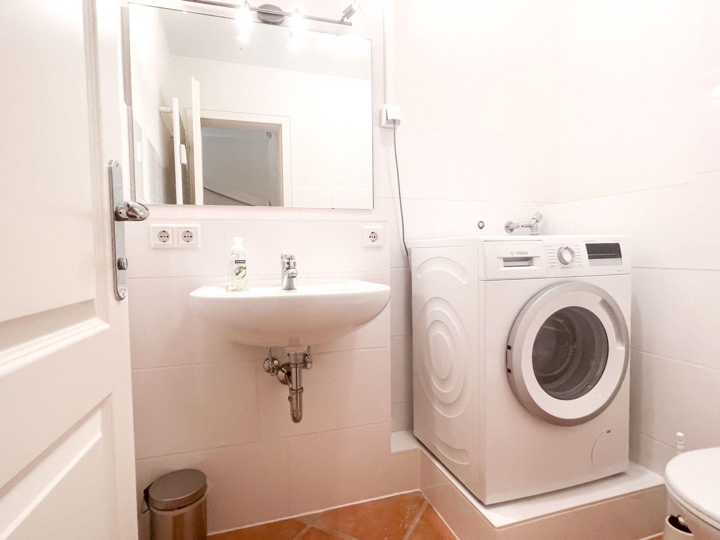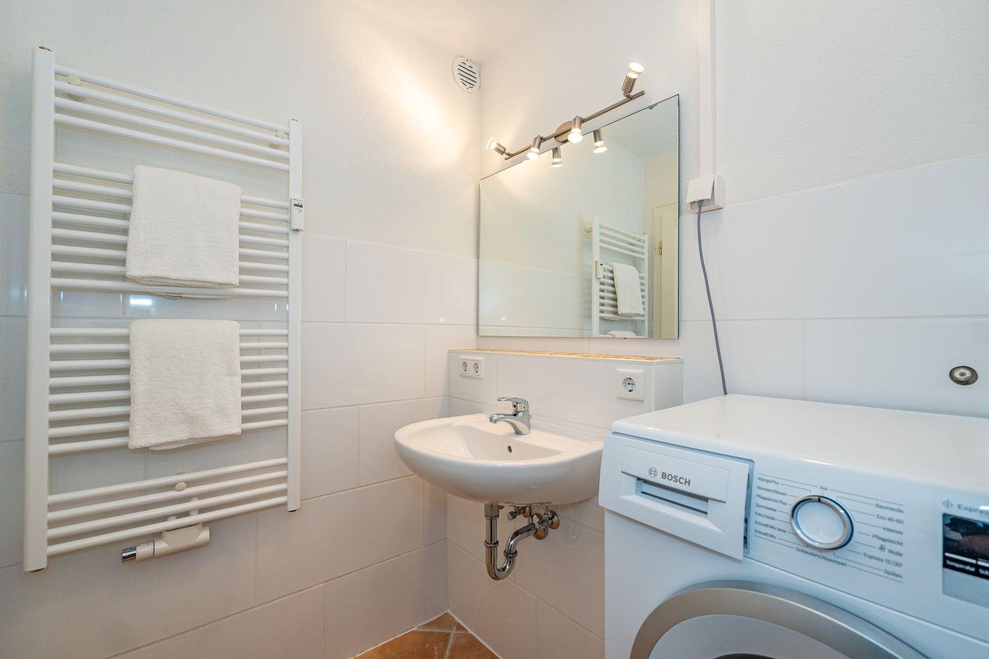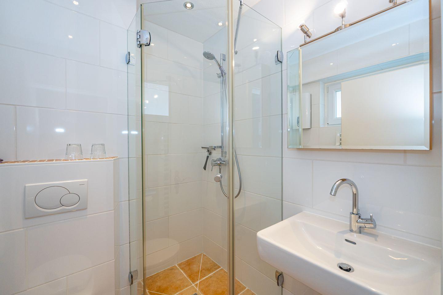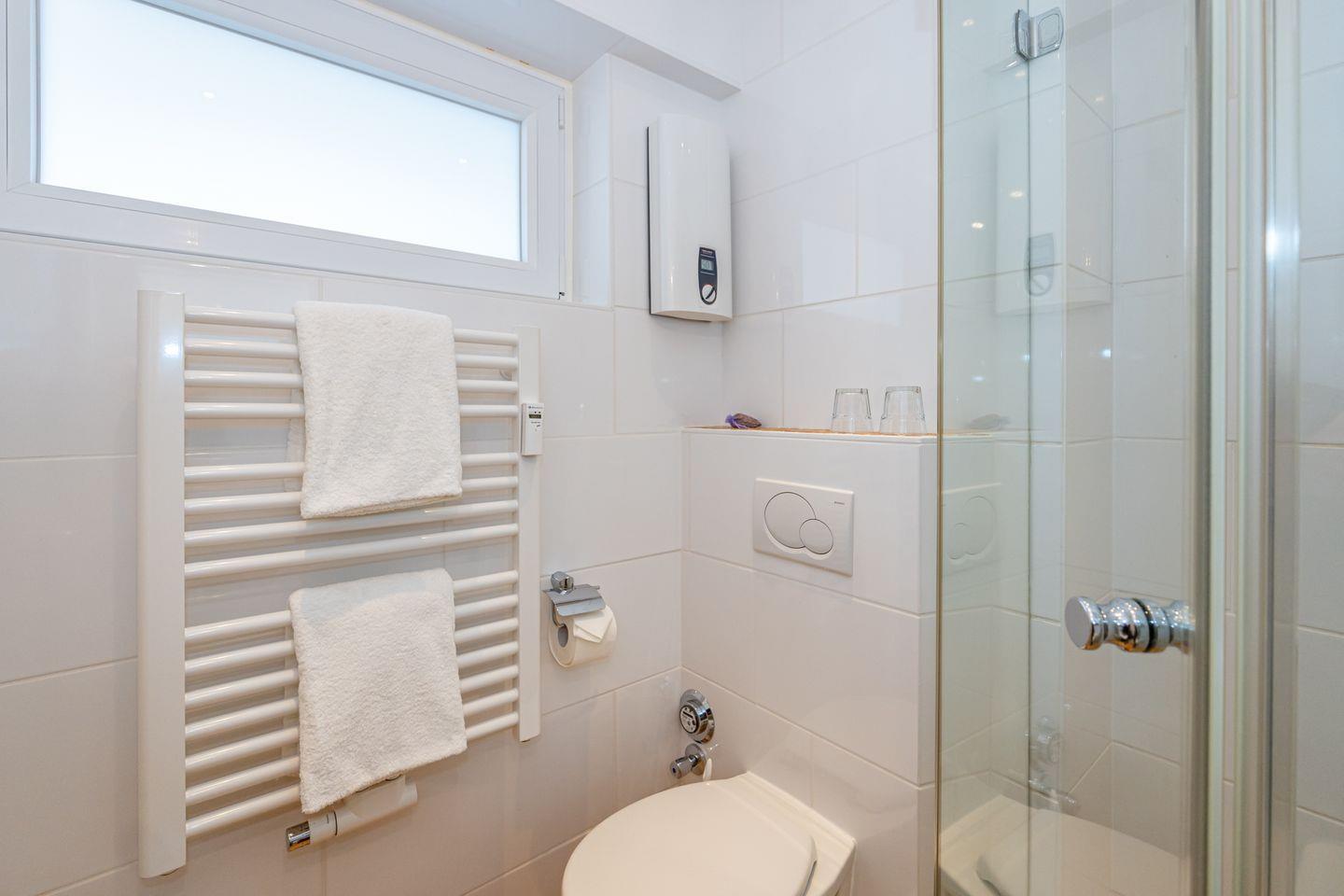 Das Badezimmer ist mit einer Dusche, einem Waschtisch, WC und Fenster ausgestattet.