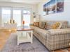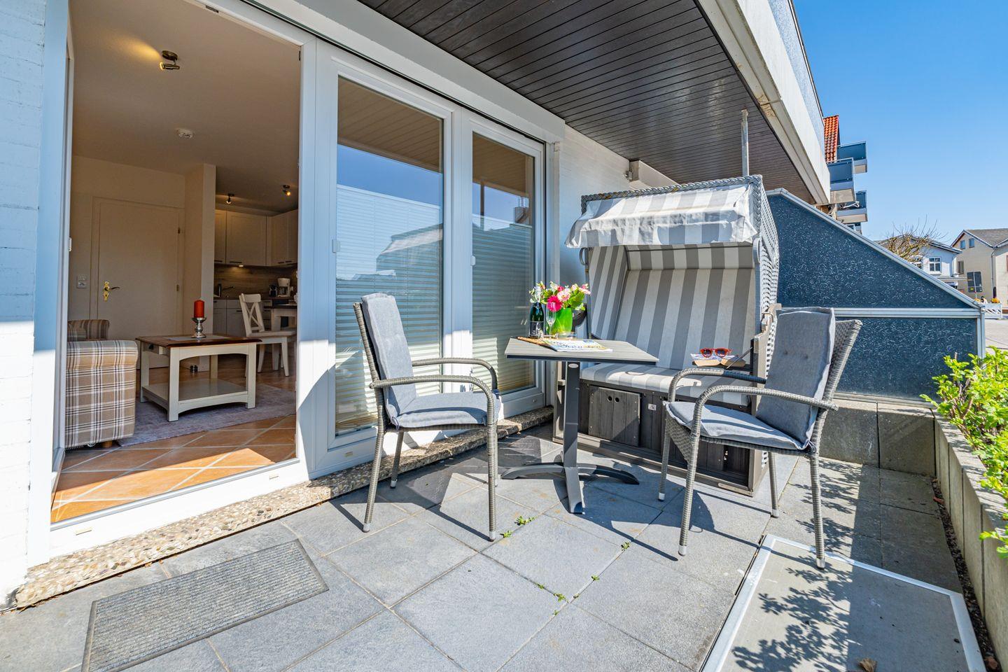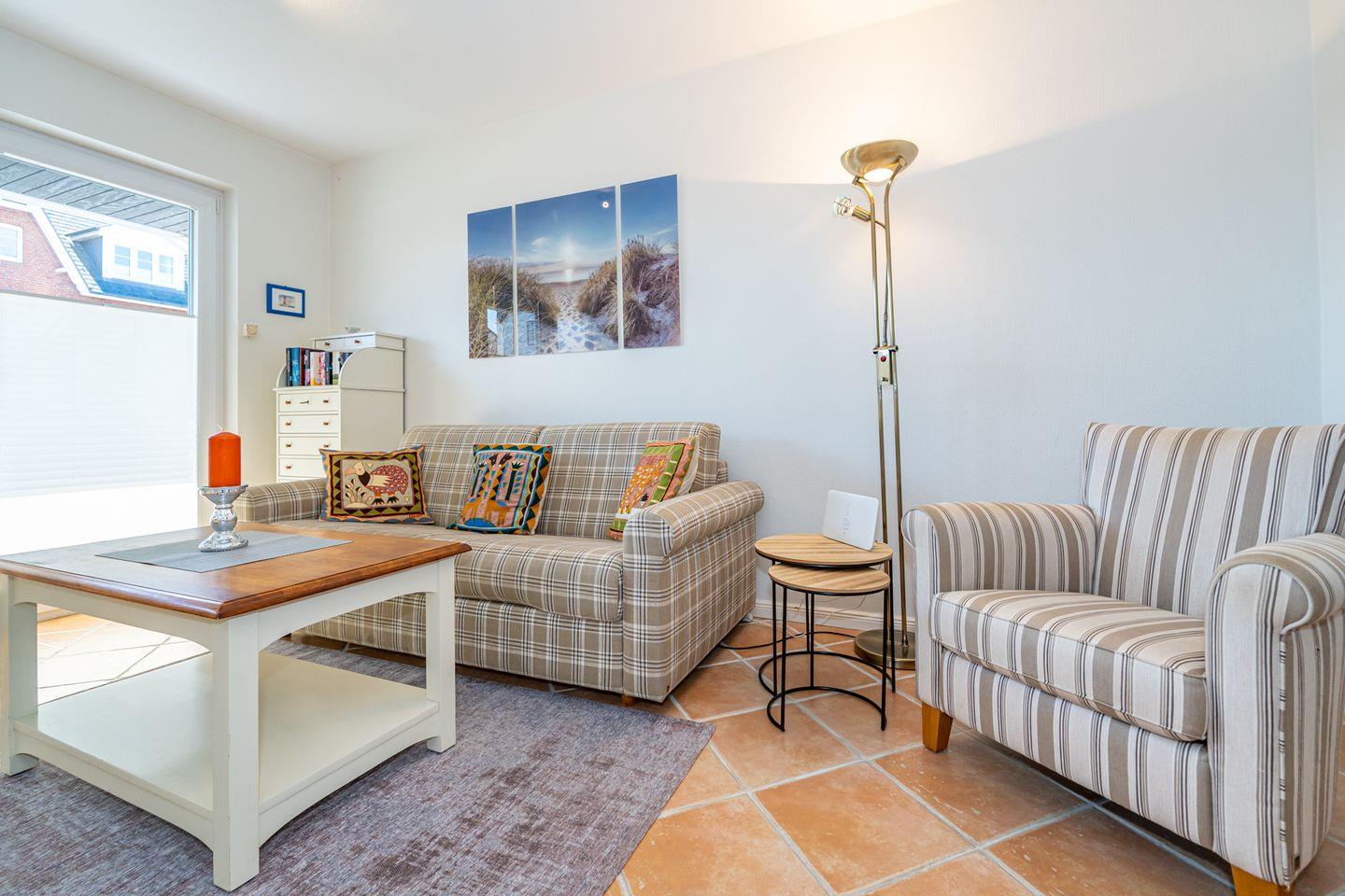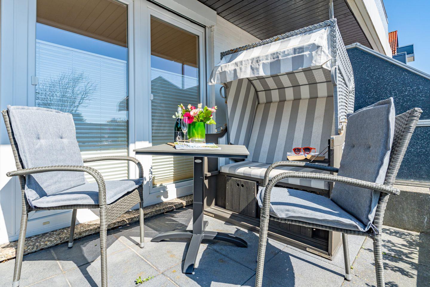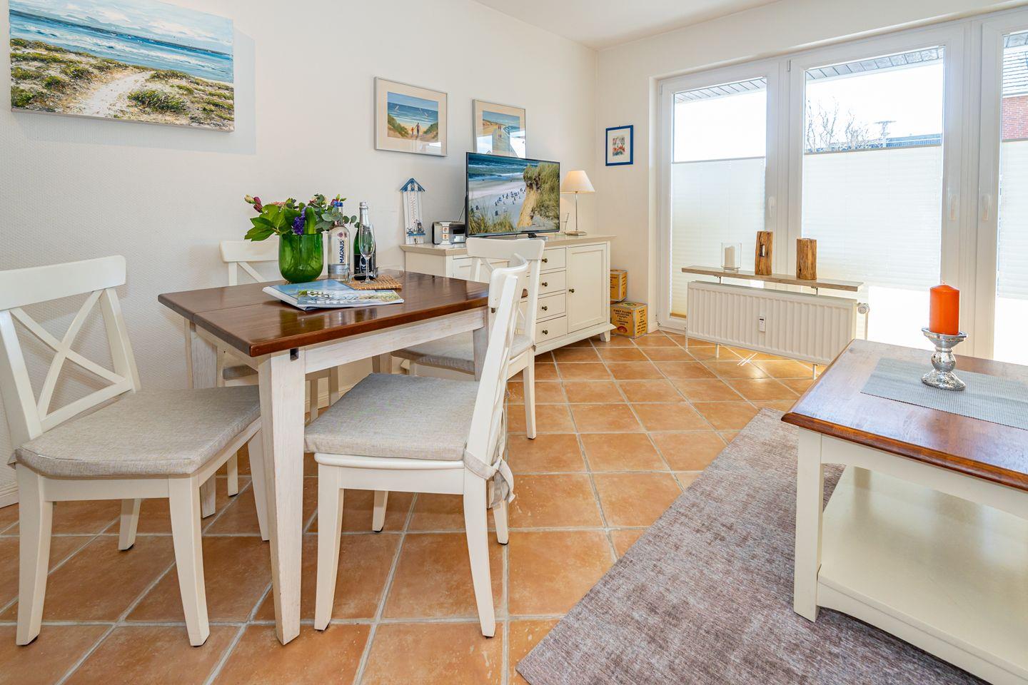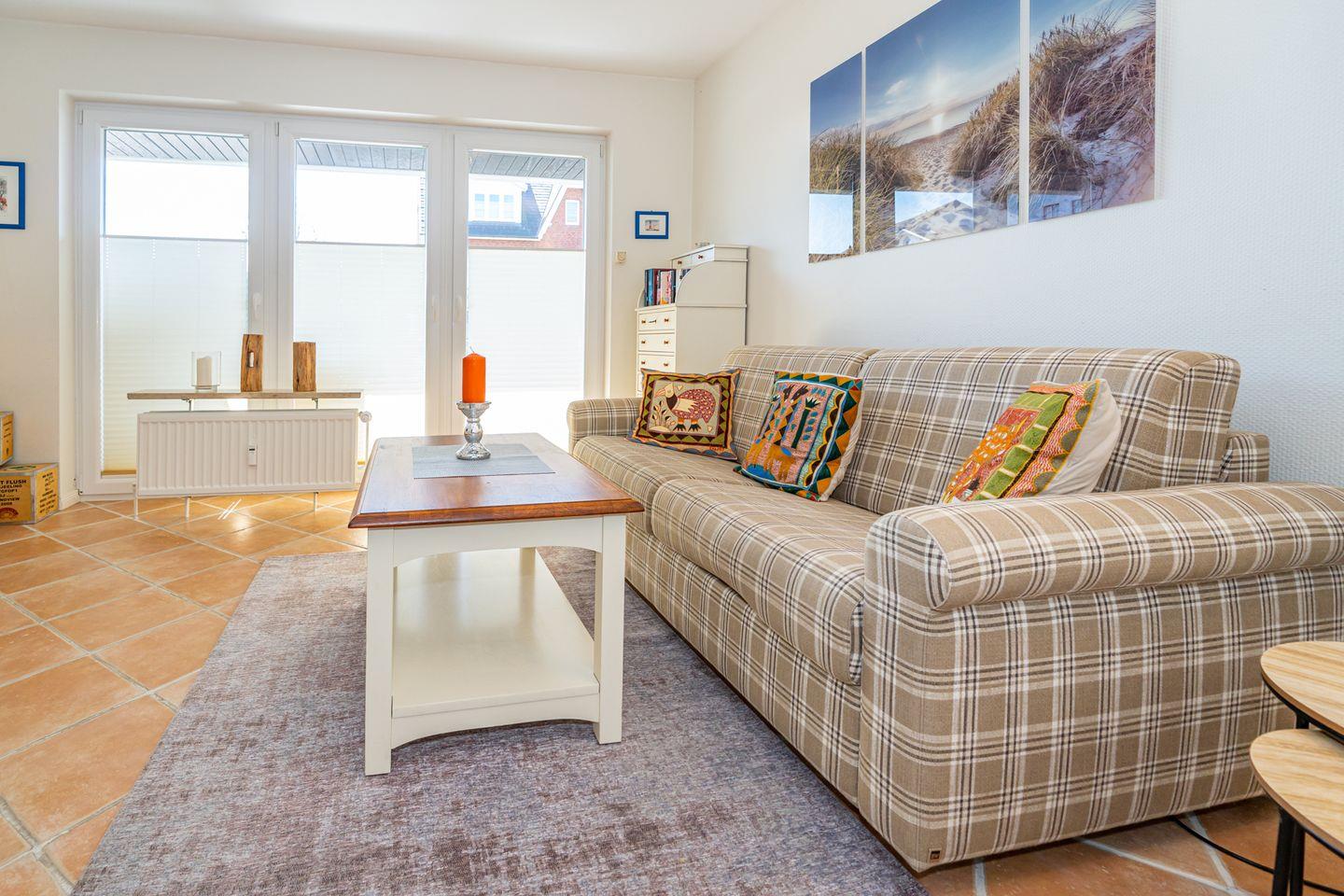 Aufteilung: Im Erdgeschoss gelangt man von der Diele mit Garderobe in das moderne Duschbad/WC mit Fenster, in das Wohnzimmer mit Austritt zu der sonnigen Südterrasse mit Strandkorb sowie der offenen Einbau-Küche mit Essplatz. Im Wohnraum steht eine gemütliche Couchgarnitur (mit Schlaffunktion) zur Verfügung.