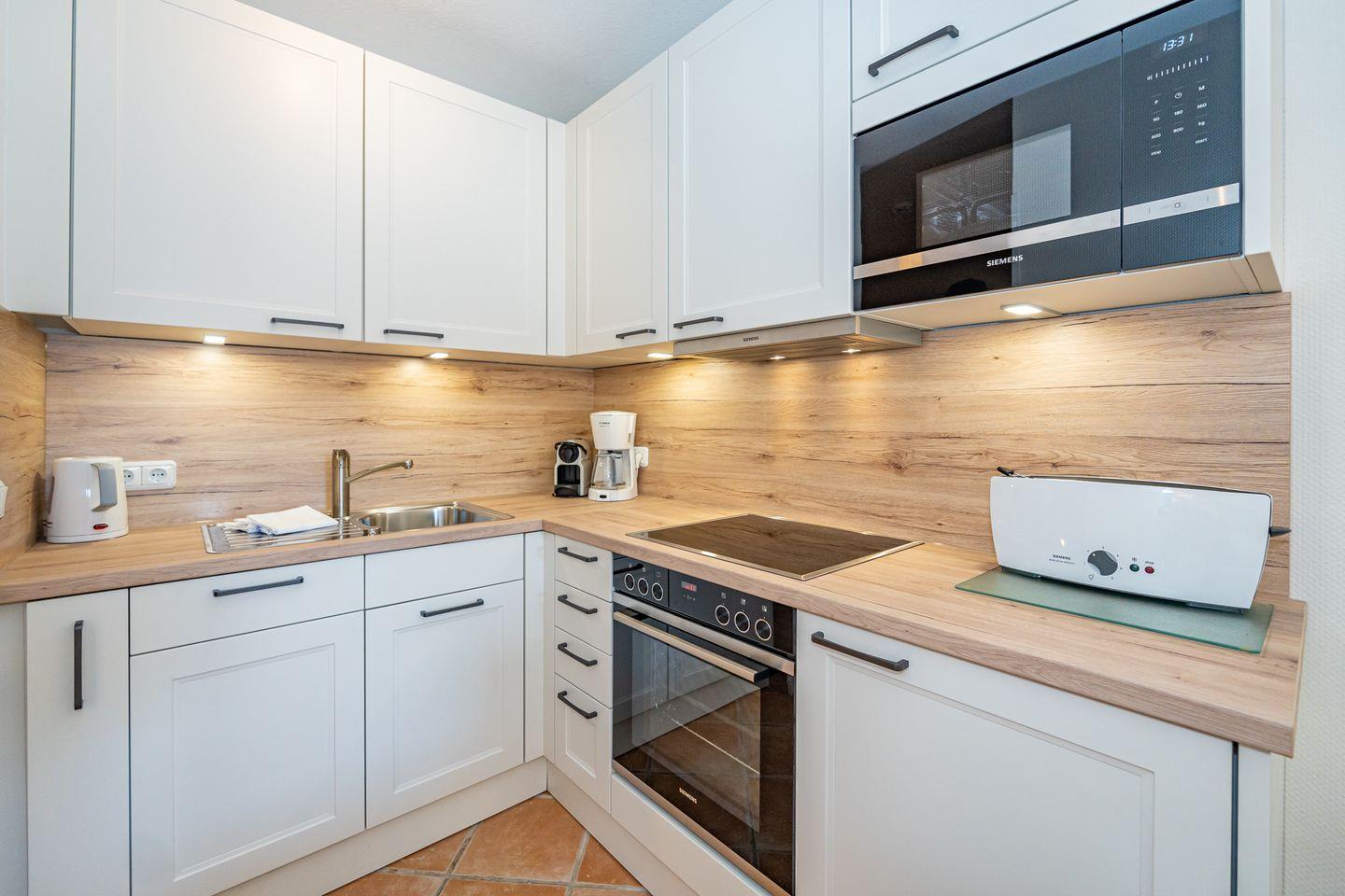 Die moderne, offene Einbau-Küche hat eine Mikrowelle, ein Ceranfeld und einen Kühlschrank. Kaffeemaschine, Wasserkocher und Toaster gehören zur Grundausstattung.
