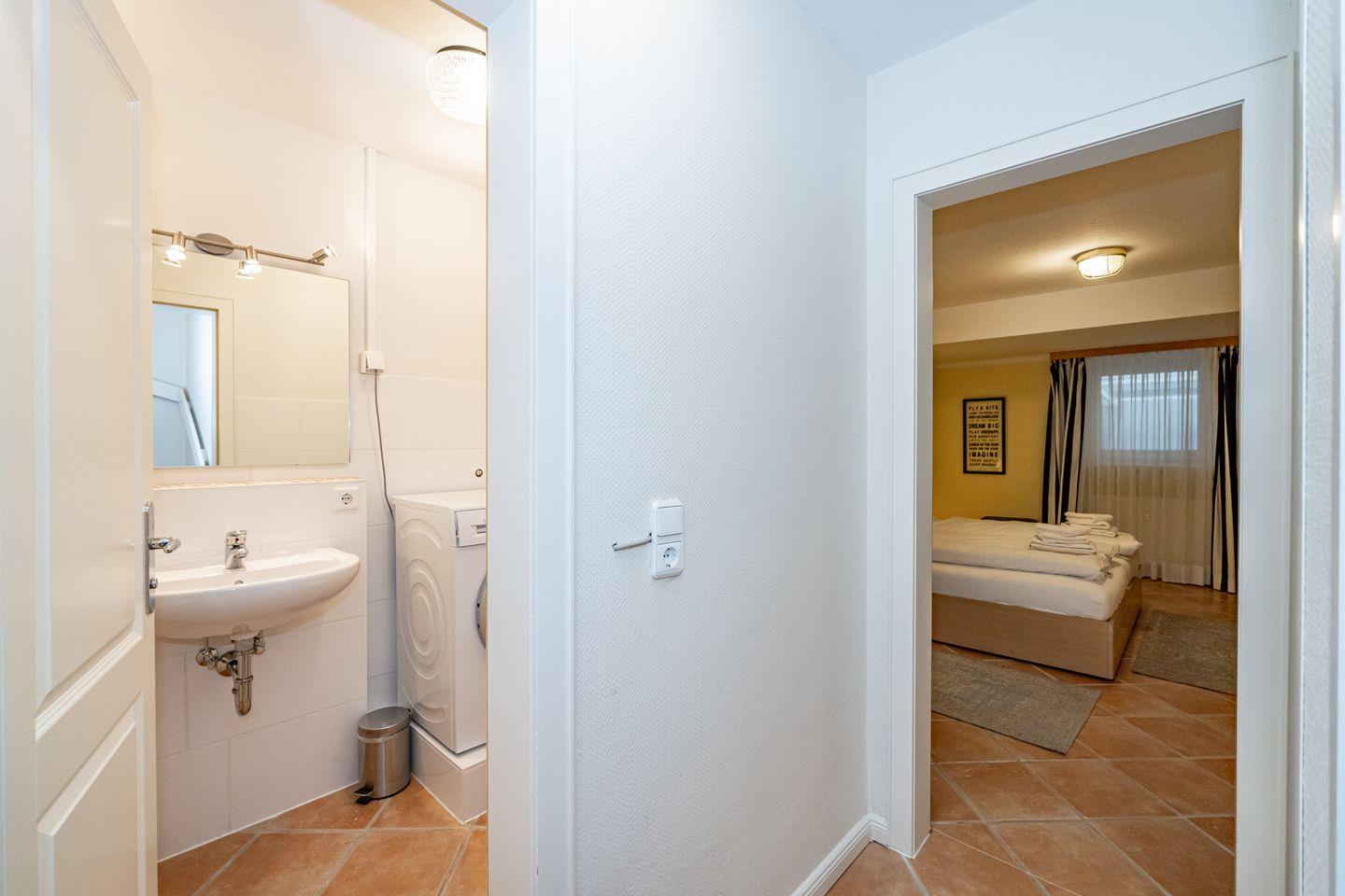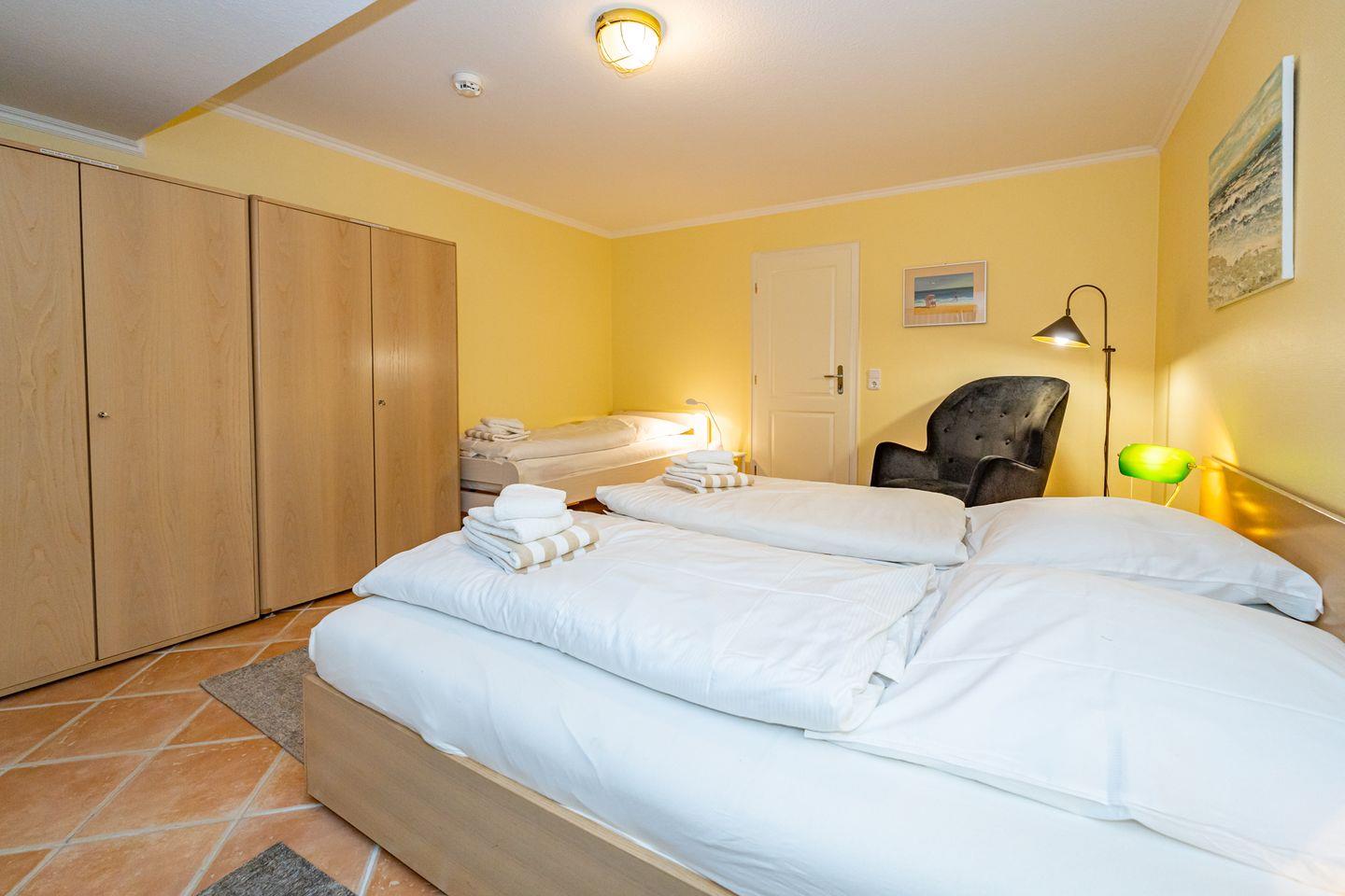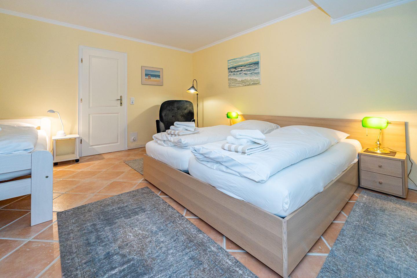 Von der Diele aus gelangt man über eine Treppe in das Untergeschoss des Hauses. Dort stehen das großzügige Schlafzimmer, ein Vorflur mit zusätzlichem Abstellraum und besonders angenehm ein (zusätzliches) Gäste-WC mit Waschmaschine zur Verfügung. Das Schlafzimmer verfügt über ein Doppelbett (Liegefläche 1,80 x 2,00 m, mit guten Einzelmatratzen) mit Nachttischen, zusätzlich ein Einzelbett (Liegefläche 0,90 x 2,00 m) und einen geräumigen Kleiderschrank