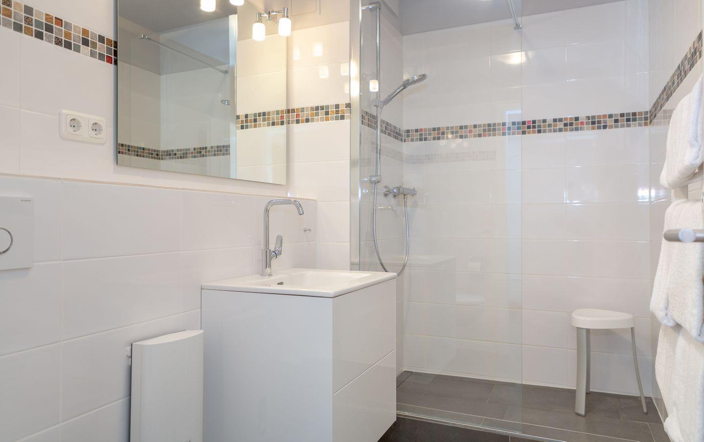 Ein weiteres Highlight ist das stilvolle Badezimmer, das mit einer bodengleichen Dusche und modernen Sanitärobjekten ausgestattet ist. Hier wird Ihnen sicherlich eine entspannende Auszeit nach einem langen Tag am Strand zuteil.