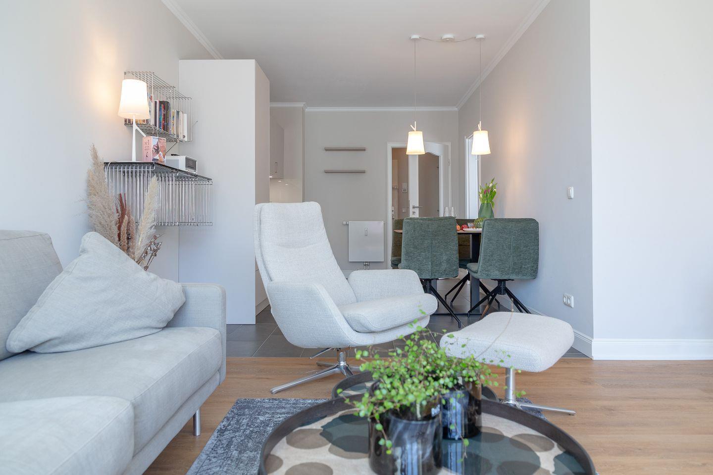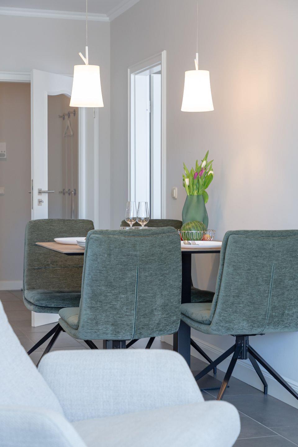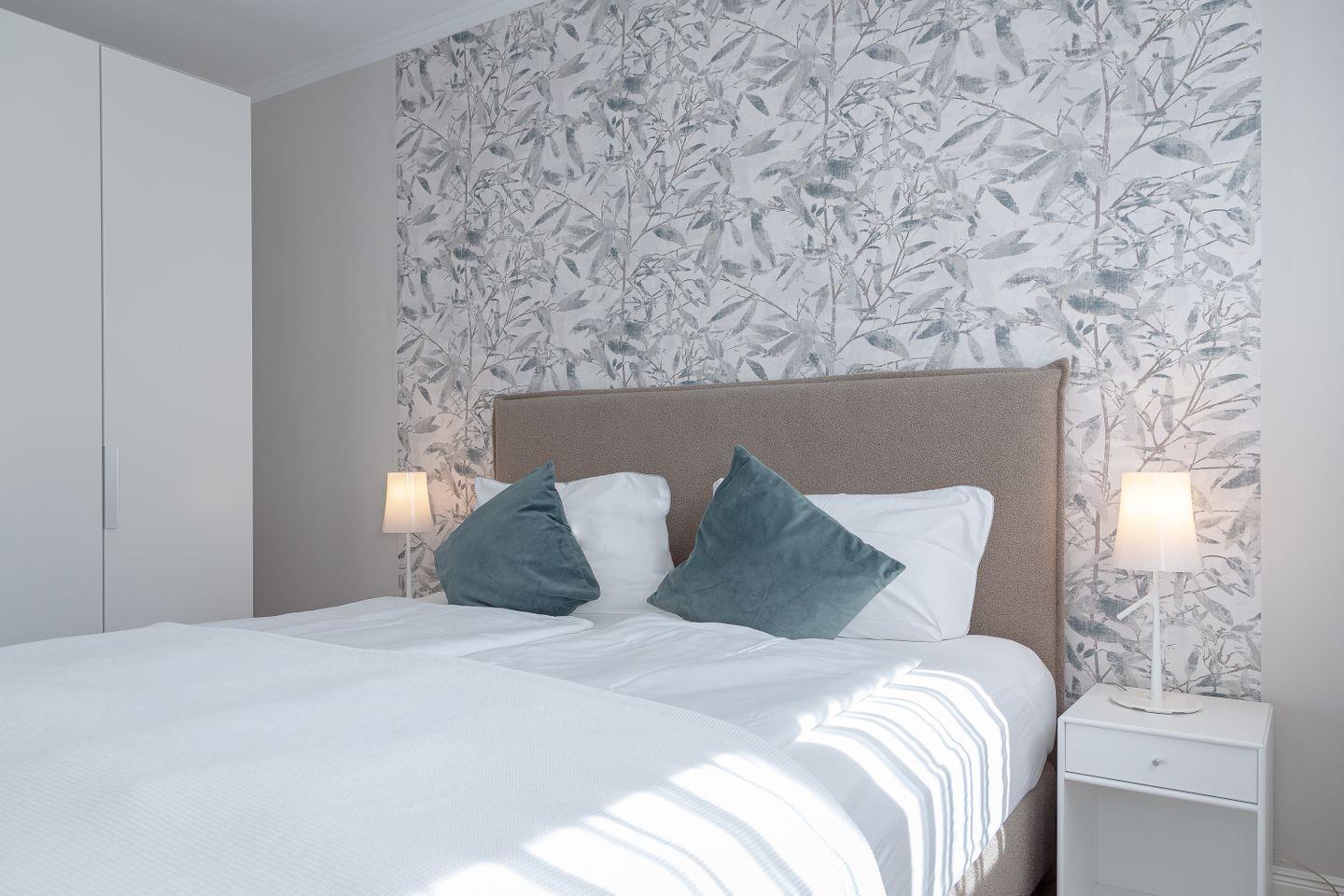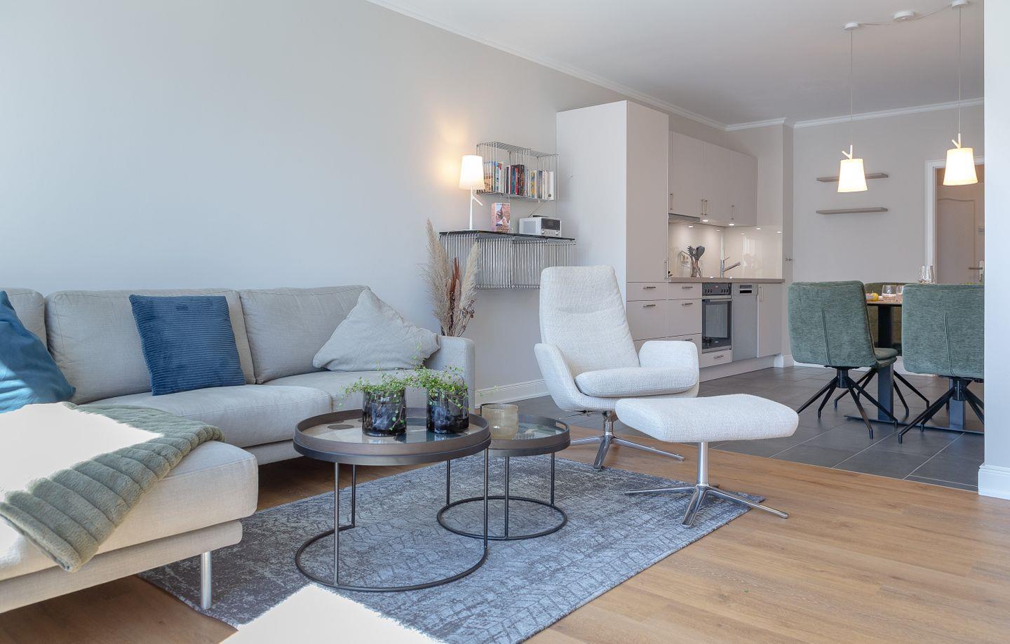 Mit einer großzügigen Fläche von 60 m² bietet die Wohnung Platz für bis zu drei Personen und ist damit ideal für kleine Familien oder Paare, die einen entspannten Aufenthalt direkt am Strand genießen möchten. Das ausreichende Platzangebot wird durch ein helles Schlafzimmer und ein einladendes Wohnzimmer ergänzt, das mit einem bequemen Sofa und einer gemütlichen Sofaecke ausgestattet ist. Der hochwertige Parkettboden sorgt zusätzlich für ein behagliches Wohngefühl.