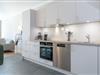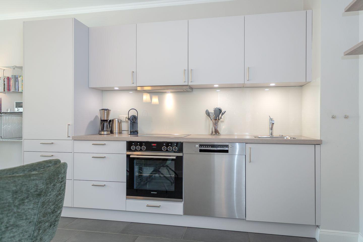 einer Nespresso-Maschine sowie einem Herd und einem Kühlschrank mit Gefrierfach. Hier können Sie Ihre Lieblingsgerichte zubereiten und am Esstisch herrliche Mahlzeiten genießen.