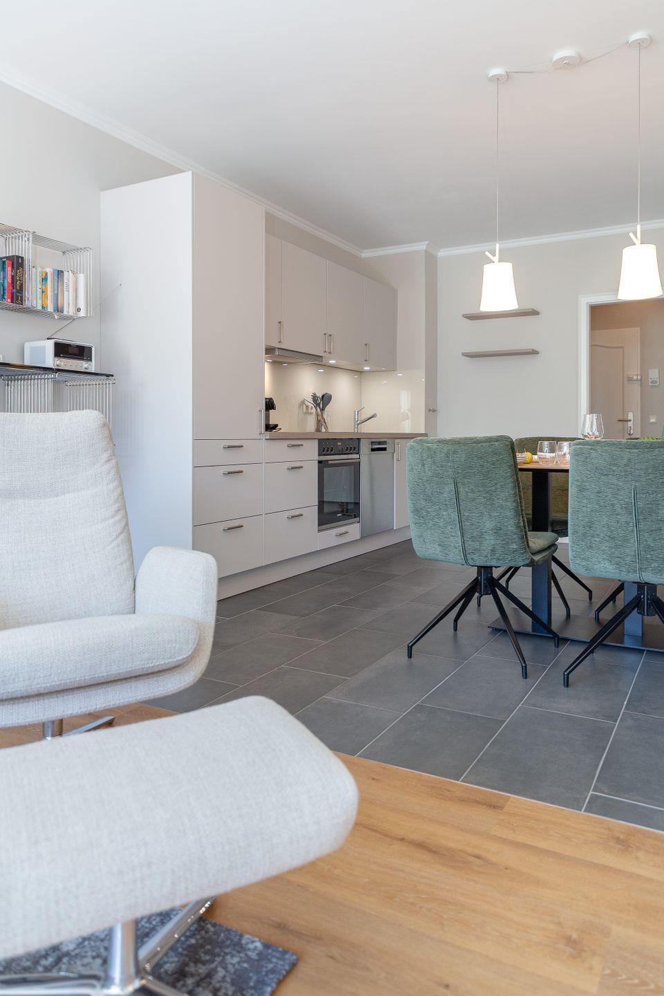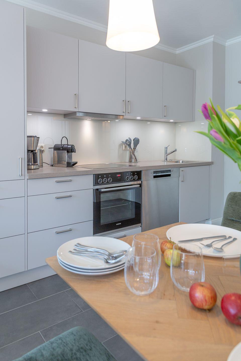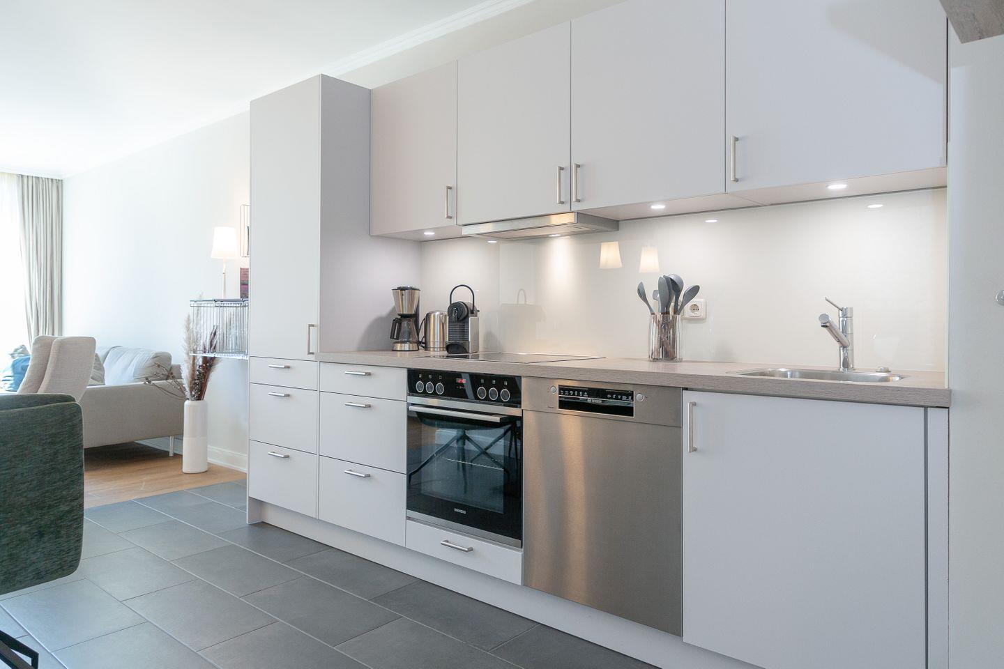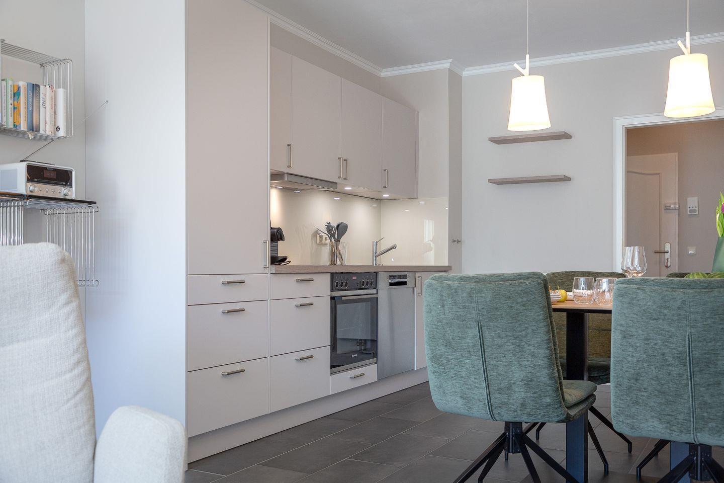 Die offene Küche ist nicht nur funktional, sondern auch einladend gestaltet. Sie ist komplett ausgestattet mit modernsten Geräten wie einer Spülmaschine, einer Kaffeemaschine,
