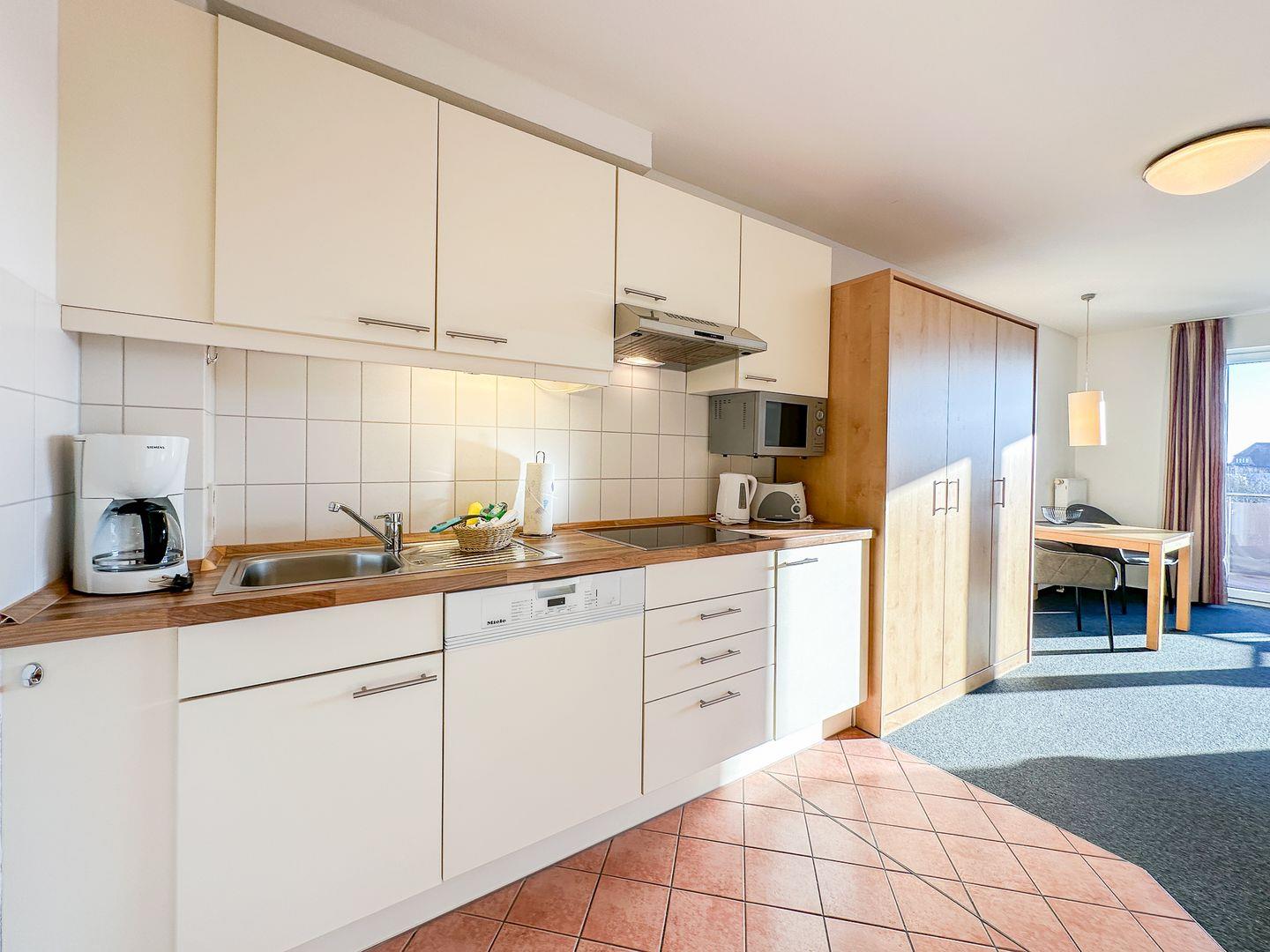 Synnewyn ist übrigens Söl'ring, also Sylter Friesisch und mit "Sonnenwind" zu übersetzen. Aber egal, ob die Sonne scheint oder es windig ist - dieses Appartement ist immer eine gute Wahl. Der Wohnbereich ist hell und offen gehalten. Ein gemütliches Doppelbett, die Couch sowie ein kleiner Essbereich haben bequem nebeneinander ihren Platz gefunden und eine voll ausgestattete Küchenzeile darf natürlich nicht fehlen. Das helle Bad verfügt über eine bodengleiche Dusche und ausreichend Ablageflächen. Schönes Add-on des Appartements ist der Südbalkon, der sowohl bei als auch bei Wind zum Draußensitzen einlädt.