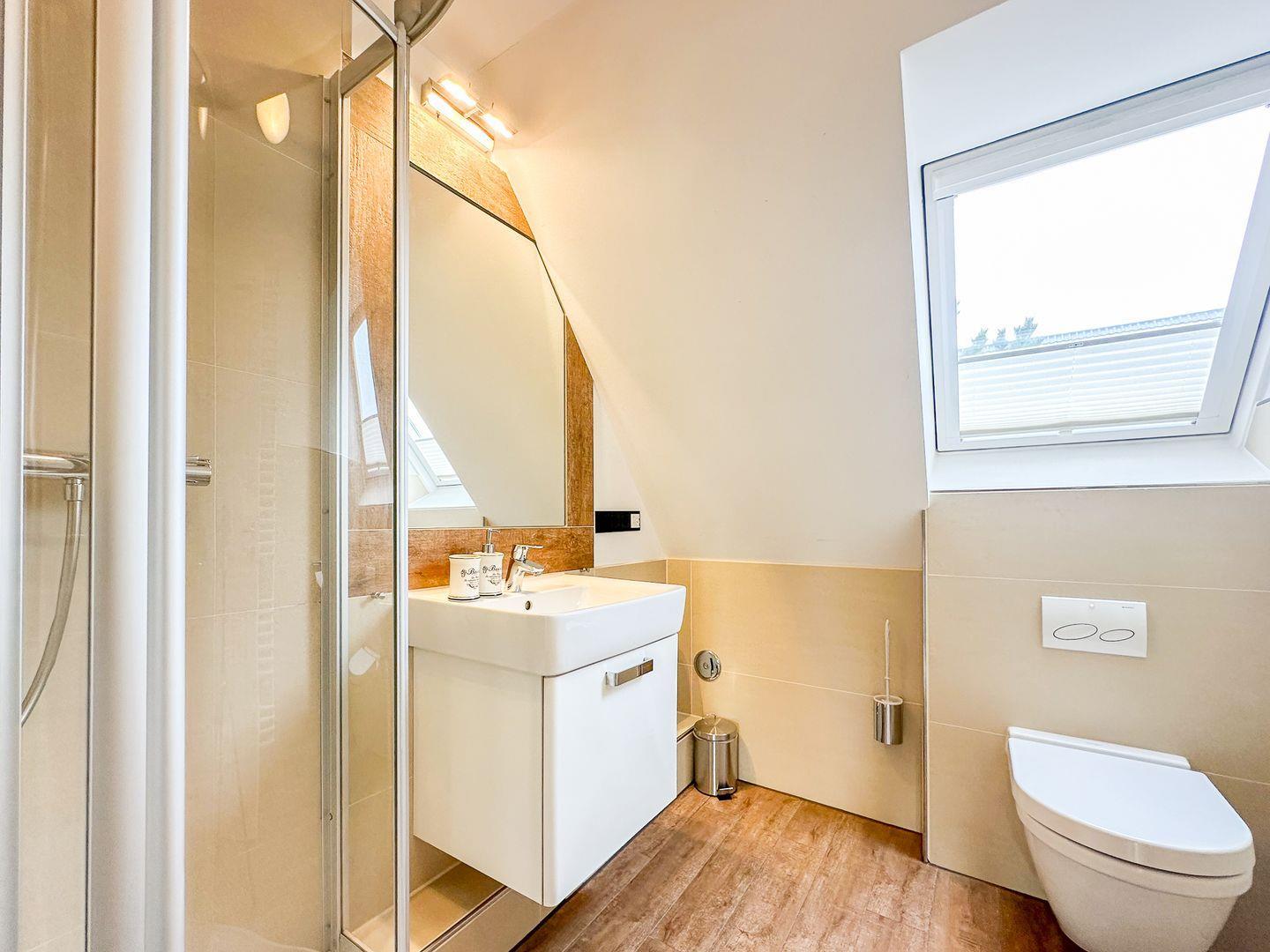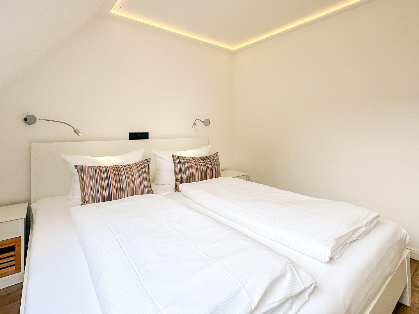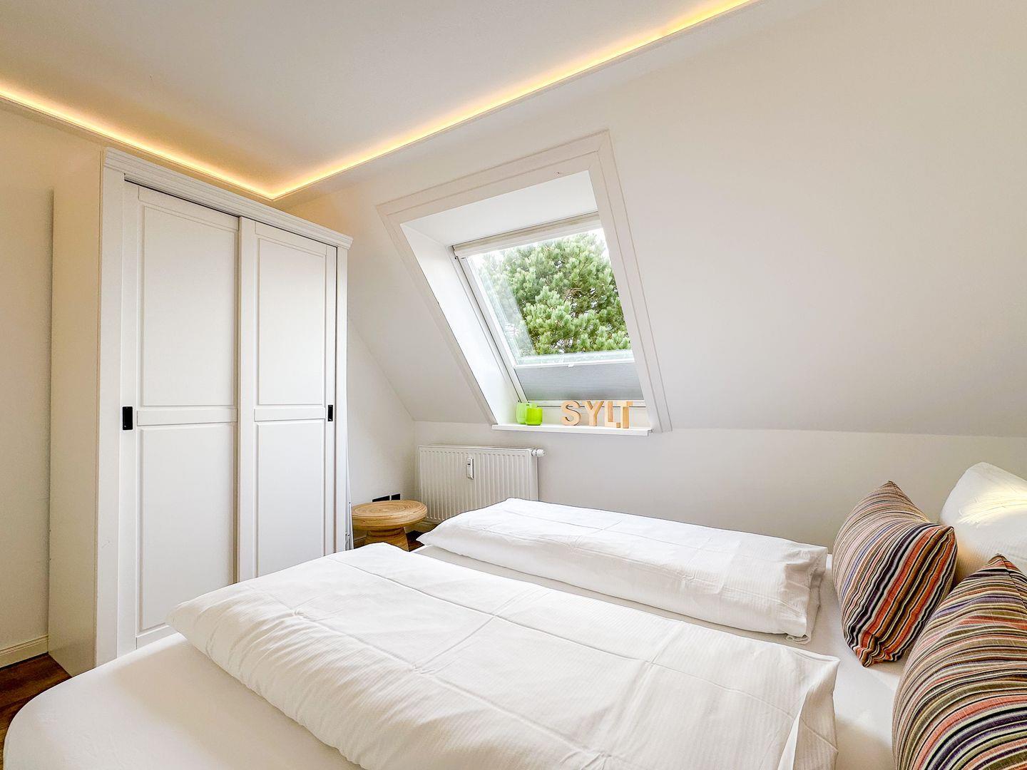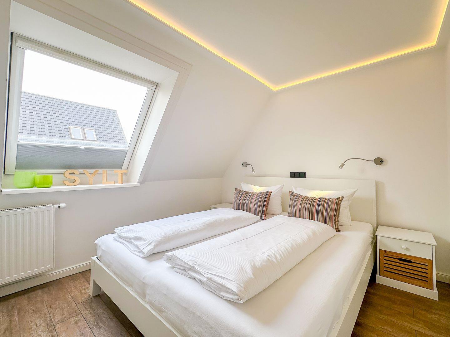 Das ganz in Weiß gehaltene Schlafzimmer hat neben dem bequemen Doppelbett noch einen "Fenster-Blick" in den Himmel zu bieten und in dem modernen Badezimmer lädt am Morgen die Dusche zum Start in den neuen Tag ein. Das perfekte Appartement also für gemütliche Stunden zu zweit.