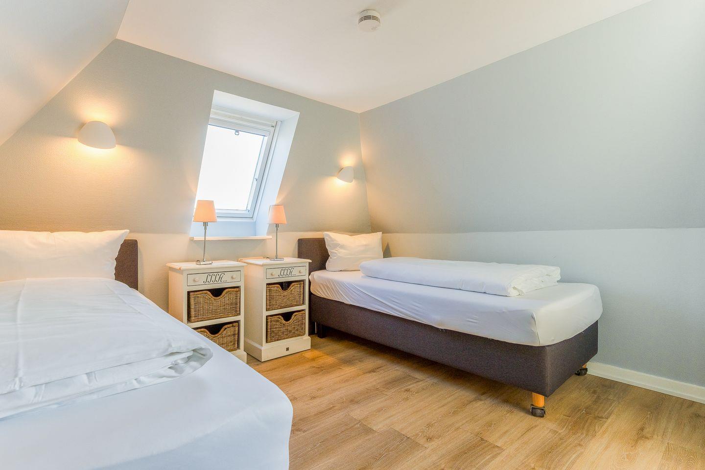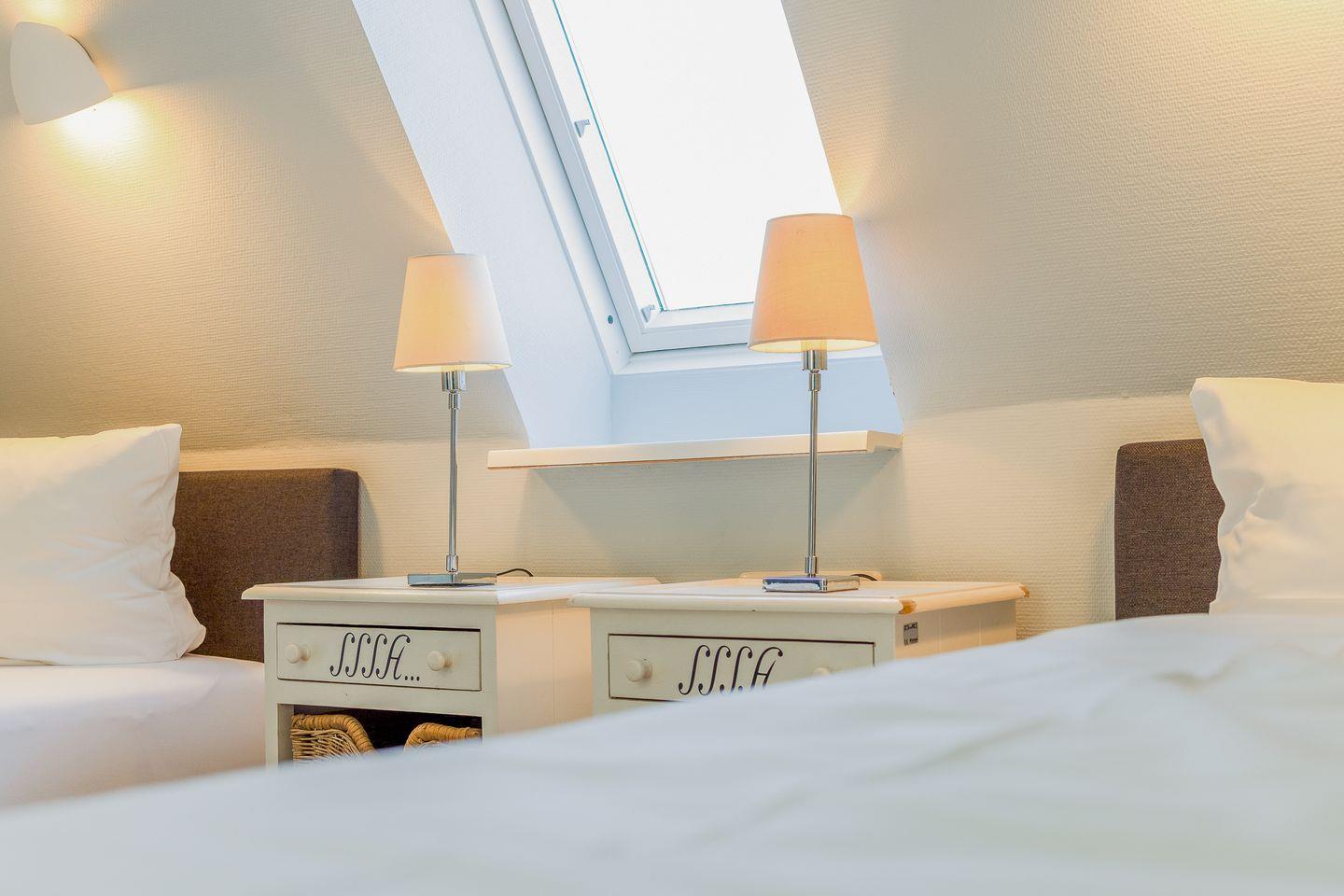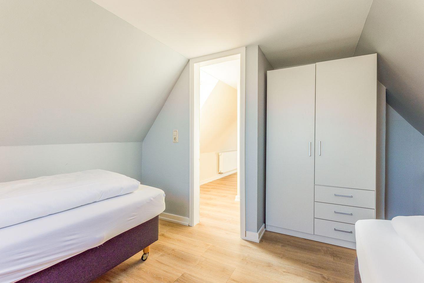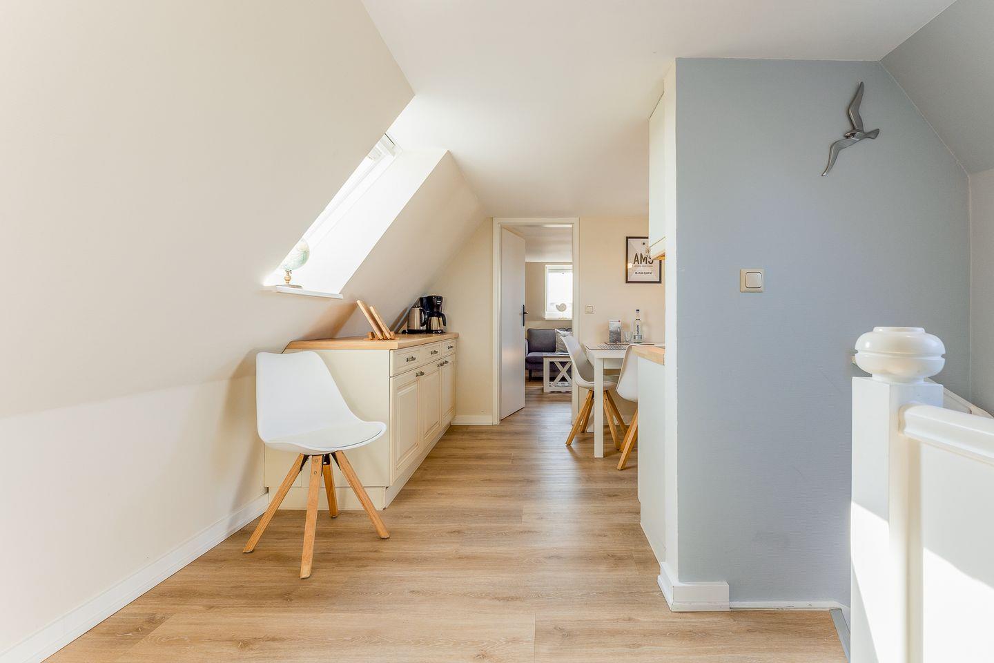 Der Schnitt des Appartements ist ungewöhnlich und kreativ wie die niederländische Hauptstadt: Das Schlafzimmer mit seinem komfortablen Polsterbett befindet sich in der 1. Etage und punktet mit viel maritimer Gemütlichkeit. Eine (etwas steile) Treppe höher führt ein langer Flur durch die Küche mit Essbereich in das helle und einladende Wohnzimmer. Auf der anderen Seite des Flurs wartet ein weiteres Schlafzimmer mit zwei Einzelbetten sowie ein modernes, helles Bad mit Walk-in Dusche (aufgrund der etwas niedrigeren Deckenhöhe für größere Menschen nicht geeignet).