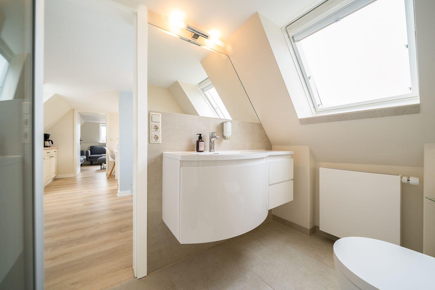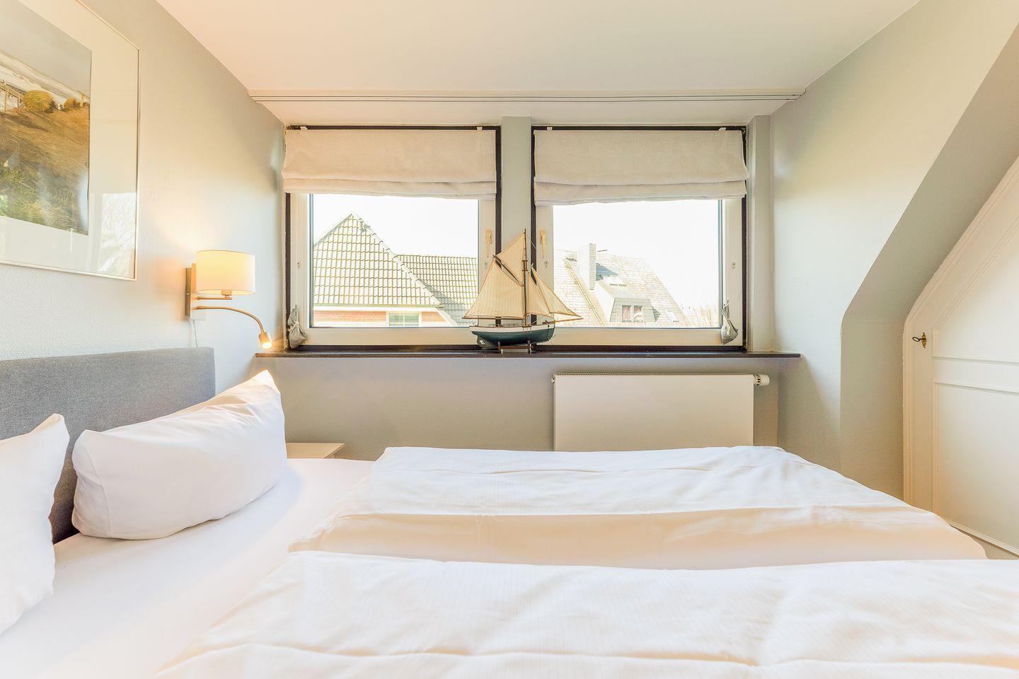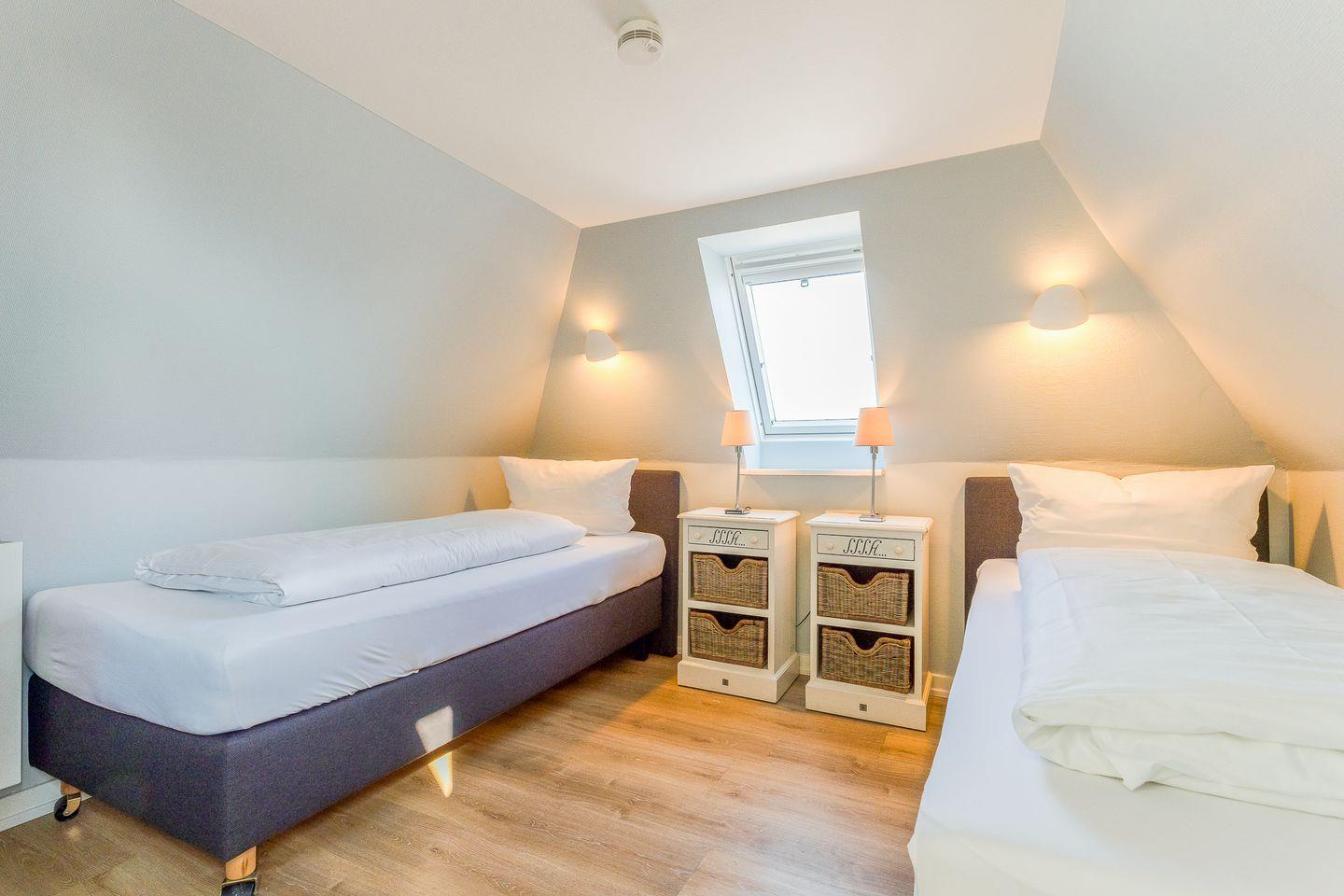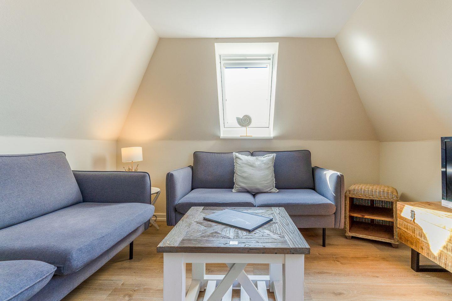 Der Schnitt des Appartements ist ungewöhnlich und kreativ wie die niederländische Hauptstadt: Das Schlafzimmer mit seinem komfortablen Polsterbett befindet sich in der 1. Etage und punktet mit viel maritimer Gemütlichkeit. Eine (etwas steile) Treppe höher führt ein langer Flur durch die Küche mit Essbereich in das helle und einladende Wohnzimmer. Auf der anderen Seite des Flurs wartet ein weiteres Schlafzimmer mit zwei Einzelbetten sowie ein modernes, helles Bad mit Walk-in Dusche (aufgrund der etwas niedrigeren Deckenhöhe für größere Menschen nicht geeignet).