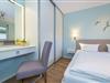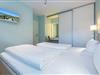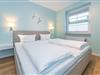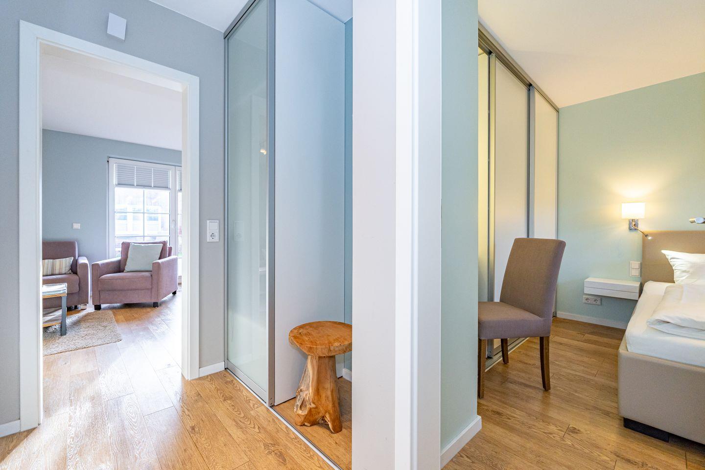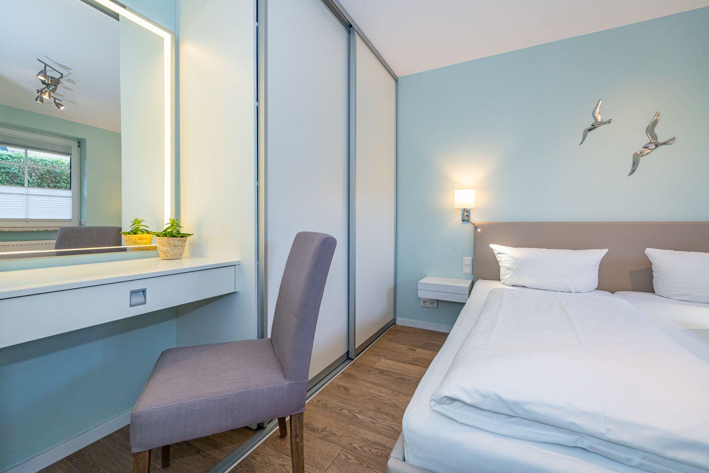 Der großzügig geschnittene Wohnbereich besteht aus einer kleinen Chillout-Ecke mit Schlafcouch sowie einem Esstisch nebst hochwertig ausgestatteter Küchenzeile. Die bodentiefen Fenster sind zugleich der Austritt auf die Terrasse (Südlage), auf der es sich im Sommer perfekt im Strandkorb relaxen lässt. Nebenan im Schlafzimmer steht ein hochwetiges Boxspringbett und - zur Freude der Damen - gibt es hier sogar einen kleinen Schminktisch.