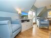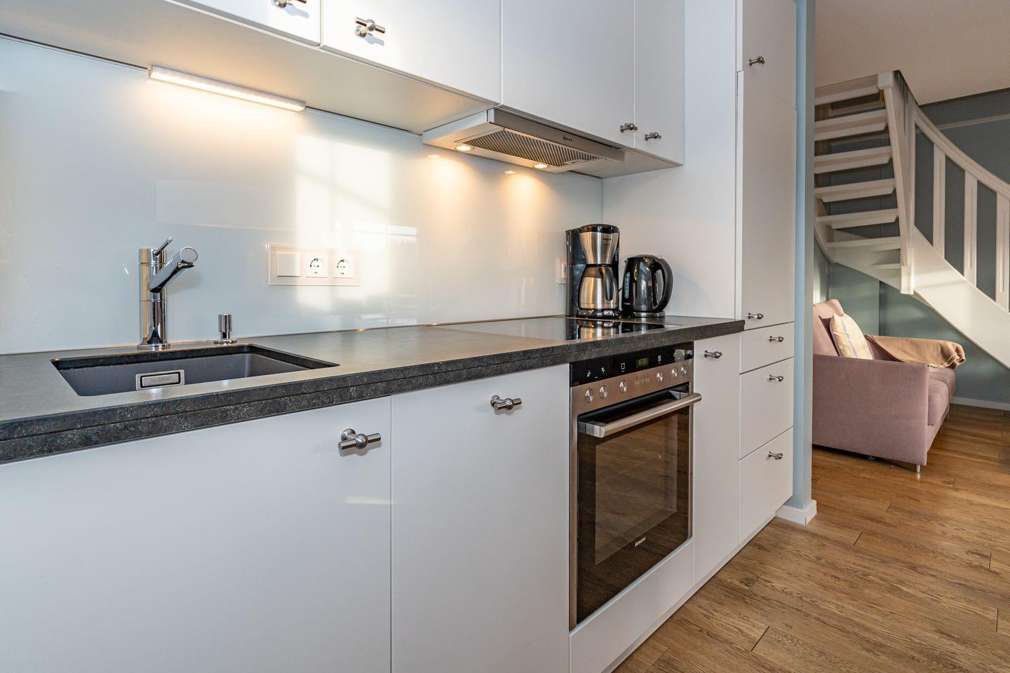 Der gemütliche Wohnbereich besteht aus einer kleinen Chillout-Ecke mit Couch sowie einem Esstisch nebst hochwertig ausgestatteter Küchenzeile. Die bodentiefen Fenster sind zugleich der Austritt auf den Balkon (Südlage), auf dem es sich im Sommer perfekt relaxen lässt. Nebenan im Schlafzimmer stehen zwei einzelne Boxspringbetten und ein großes Boxspringbett lädt eine Etage höher zum Schlummern wie im 7ten Himmel ein.