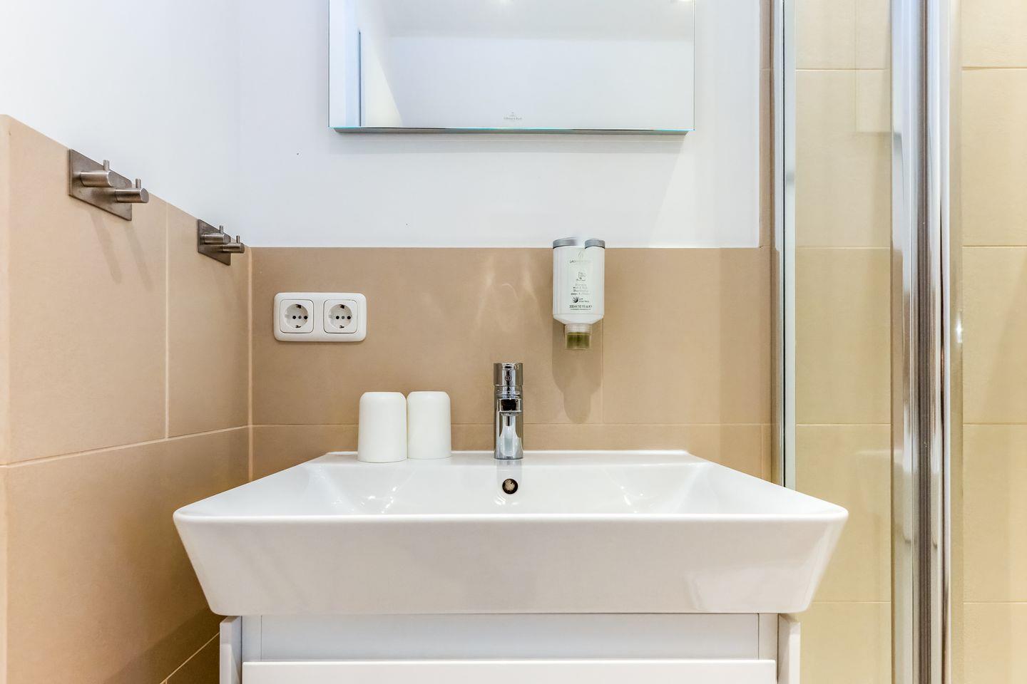 Um das Appartement luftig und dennoch gemütlich zu gestalten wurde hier auf viel Holz, Naturtöne und