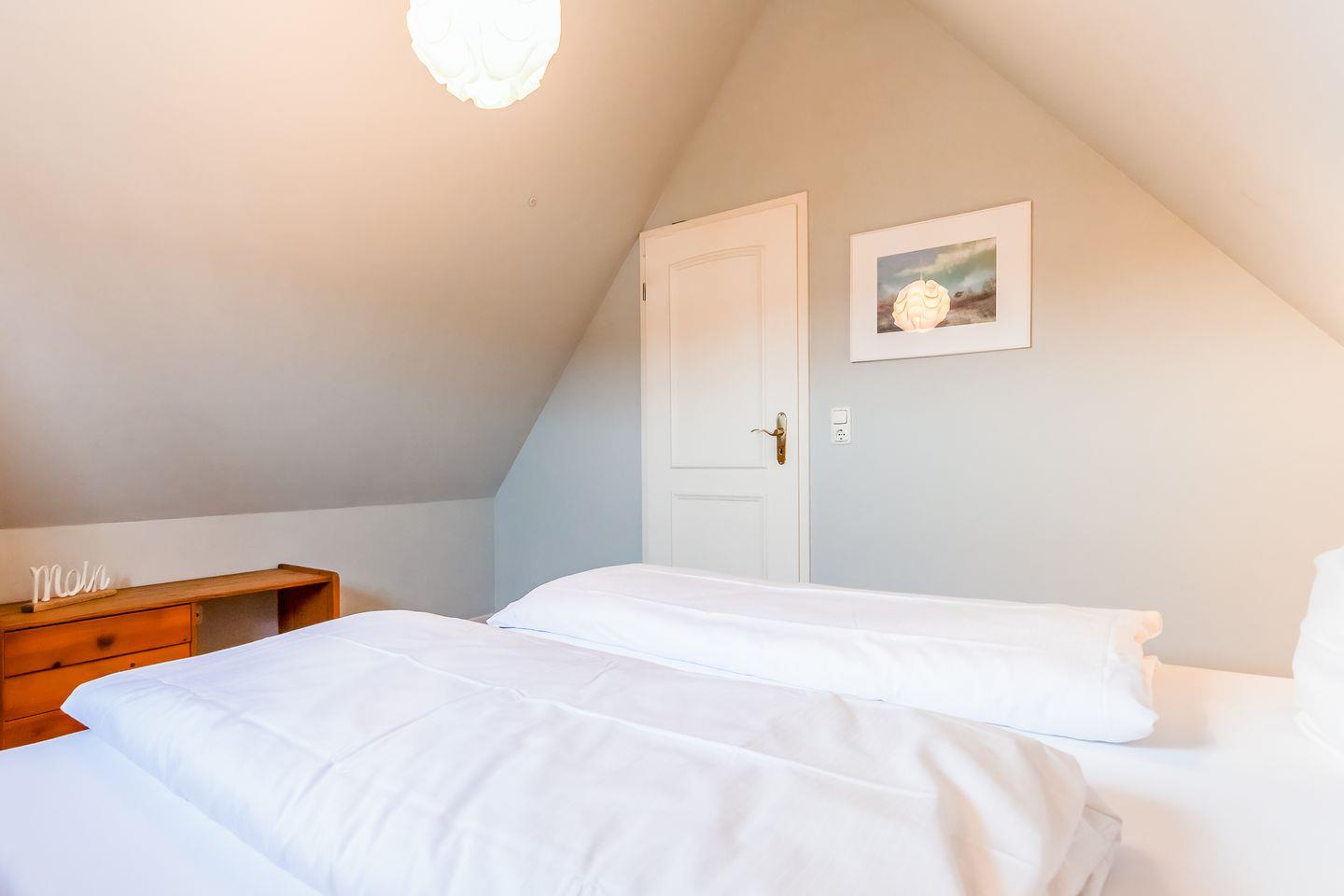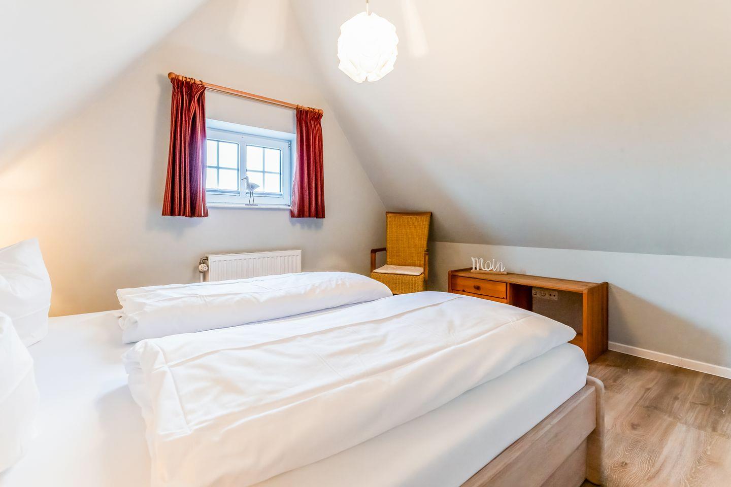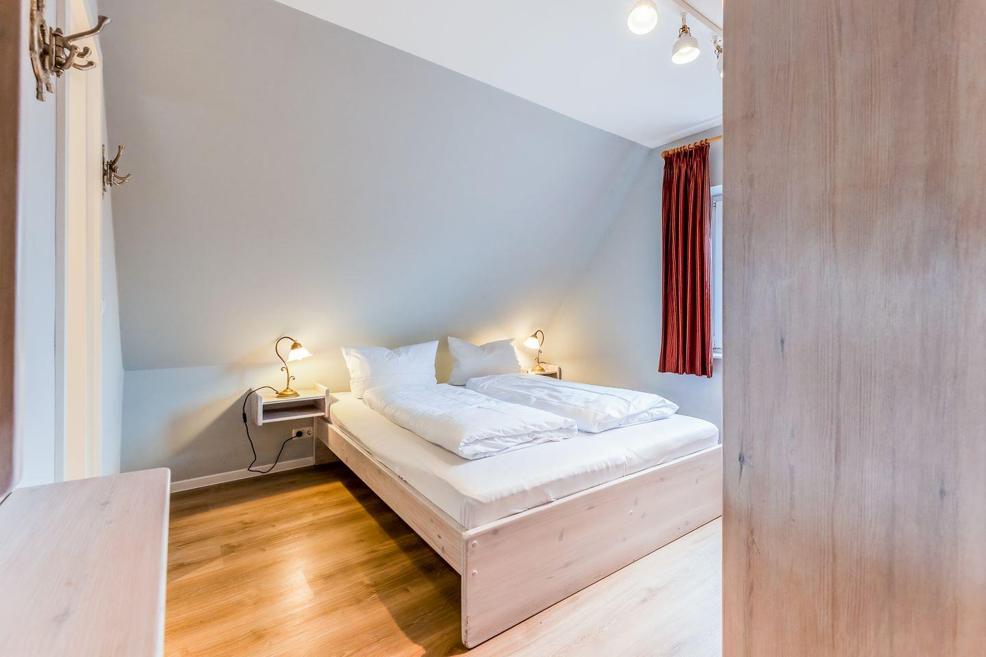 Das Schlafzimmer verfügt über ein komfortables Doppelbett und ist dank seinen gedeckten Farben auch optisch ein schöner Ruhepol. Ein weiteres ebenso gemütliches Schlafzimmer befindet sich eine Treppe weiter oben unter dem Dach. Auch in den beiden modernen Badezimmer ist jeder Besuch eine Freude, den die sandfarbenen Fliesen hier erinnern schon an den späteren Strandbesuch. Kurz gesagt, ist das Appartement Nord-Hüs No.4 ein heimeliges Zuhause auf Zeit, das bestens für kleine Familien geeignet ist.