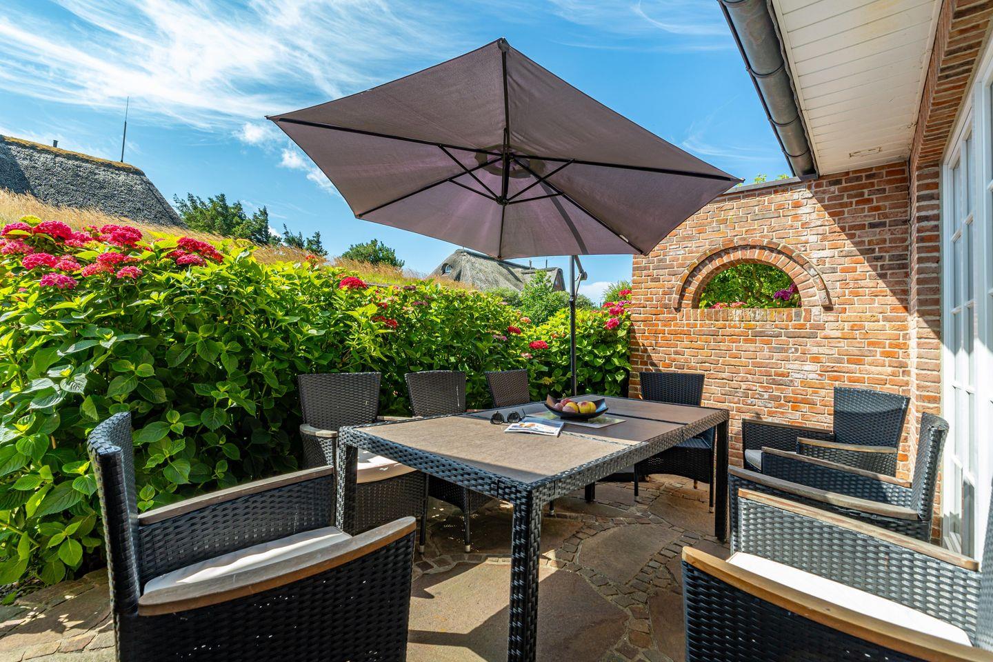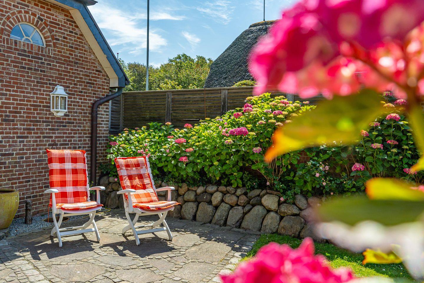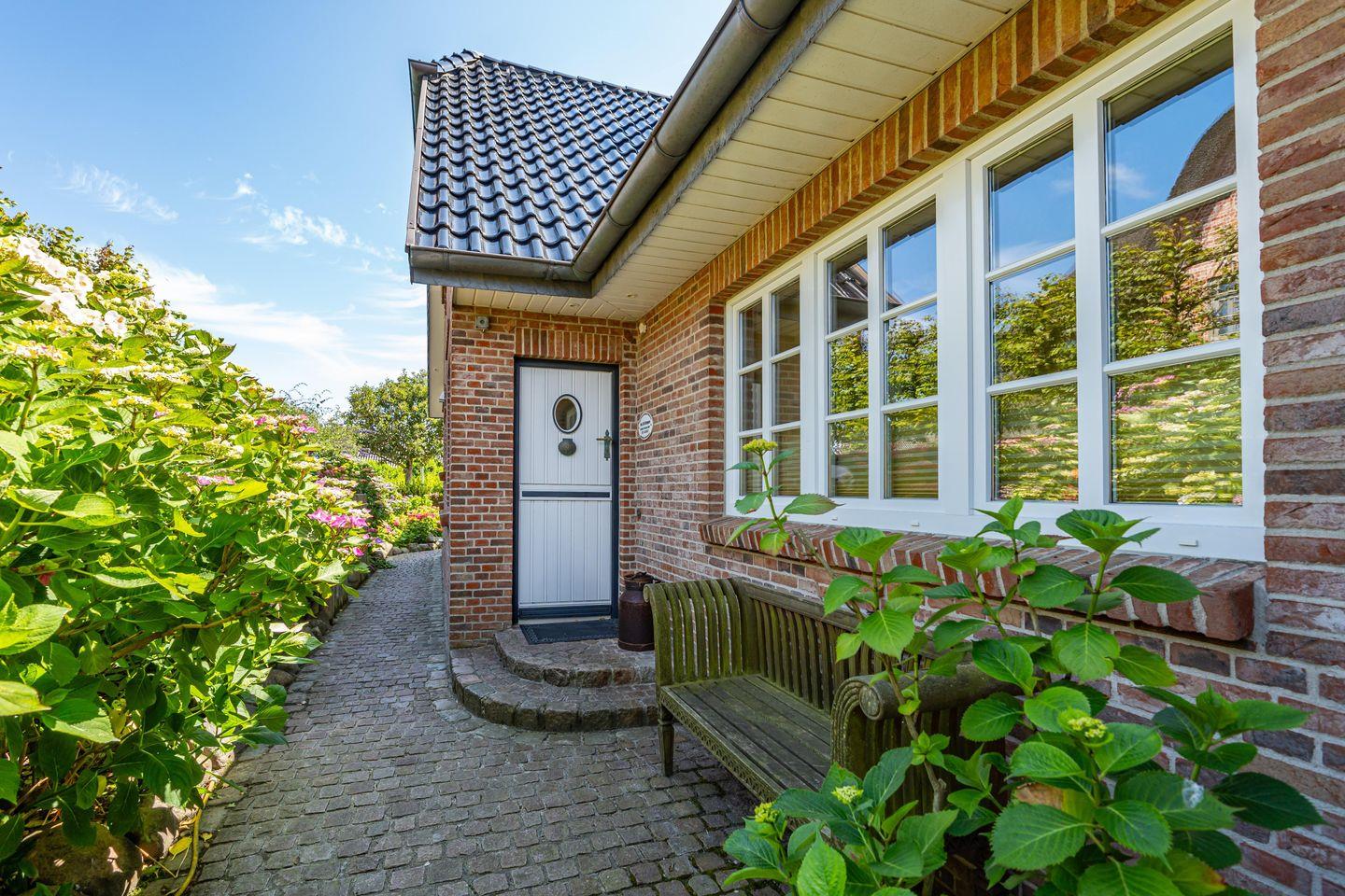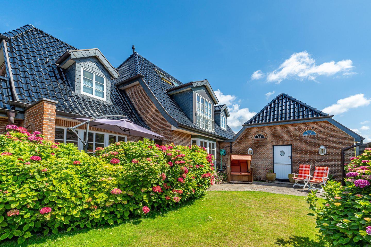 In einer traumhaft ruhigen Seitenstraße im Süden Westerlands befindet sich das schöne Landhaus Nici nur wenige Gehminuten vom Strand entfernt. Auch der Ortskern ist fußläufig gut und schnell erreichbar. Im Erdgeschoss des Hauses erwartet Sie ein heller, großzügiger Wohn- und Essbereich, der zum gemeinsamen Verweilen einlädt. Von hier aus gelangen Sie auf die wunderschöne Südterrasse samt Gartenmöbeln und Strandkorb. Der angrenzende Garten darf anteilig bis zu der imaginären Grenze zwischen den Hortensien genutzt werden (anteilig, damit die Gäste aus dem Bungalow nicht gestört werden). In der offenen, voll ausgestatteten Küche finden Sie einen Side by Side Kühlschrank mit Eiswürfelspender, einen Herd mit Cerankochfeld sowie einen Backofen als auch eine Filterkaffeemaschine, einen Toaster sowie einen Wasserkocher vor. Die Küche bietet alles, was für einen gemeinsamen Kochabend mit Freunden oder der Familie benötigt wird. Im 1. Obergeschoss erwarten Sie drei großzügige Doppelschlafzimmer mit schönem Holzdielenboden, die jeweils mit Flachbildfernsehern ausgestattet sind. Das große Tageslichtbad verfügt über eine tolle Eckbadewanne, eine separate Dusche mit Infrarotkabine, einem WC sowie einem Bidet. Im 2. Obergeschoss finden Sie ein weiteres kleines Duschbad mit WC vor. Auf dem wunderschönen Grundstück befindet sich neben dem Landhaus zudem noch das App. Nici sowie der Bungalow Nici, welche wunderbar gemeinsam für größere Familienzusammenkünfte gemietet werden können. Das Landhaus Nici verfügt über einen PKW-Stellplatz vor der Garage. Weitere öffentliche Parkmöglichkeiten befinden sich zudem direkt vor dem Haus. Kostenloses WLAN ist vorhanden, zwei Hunde sind erlaubt.