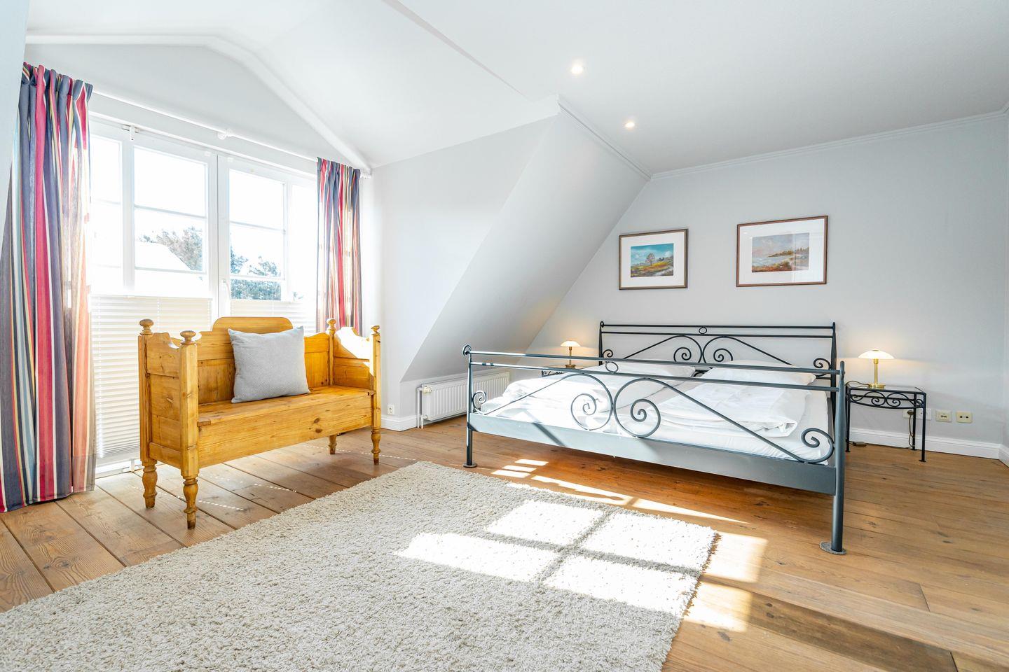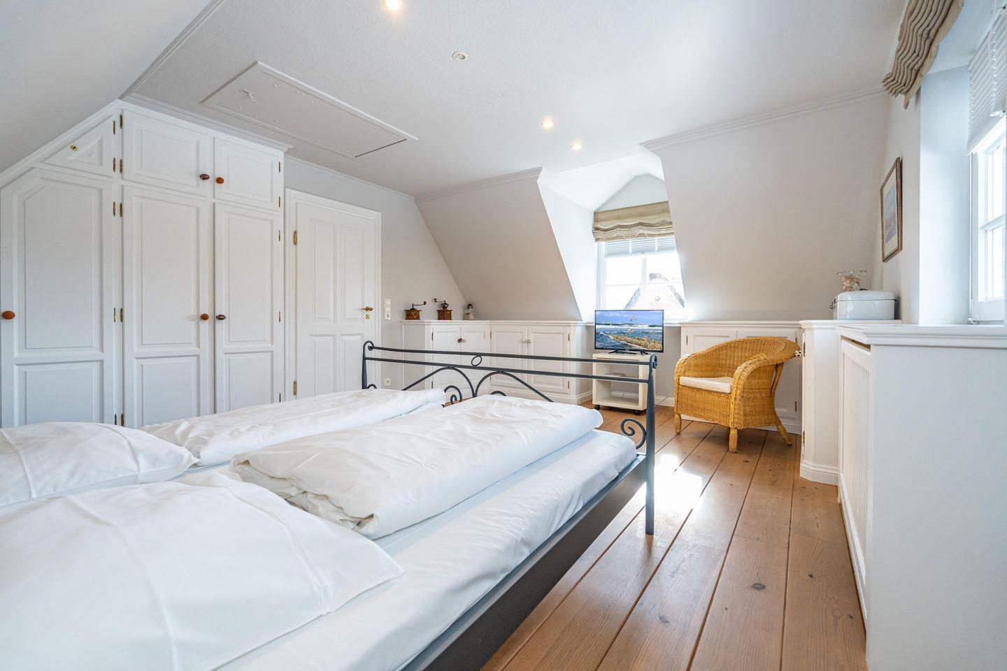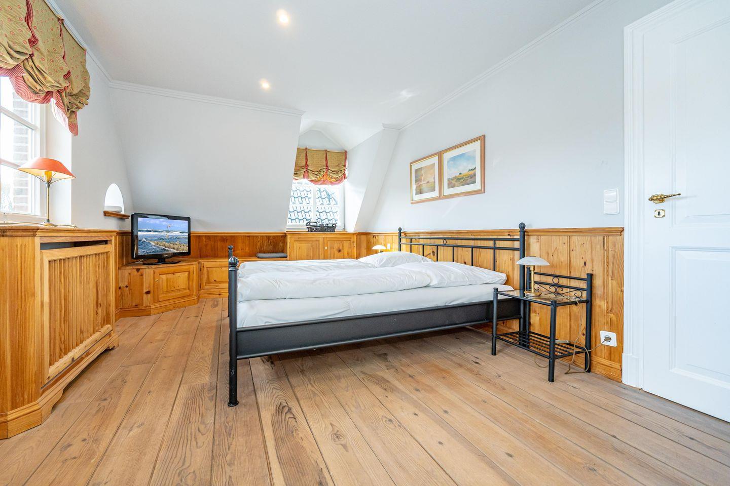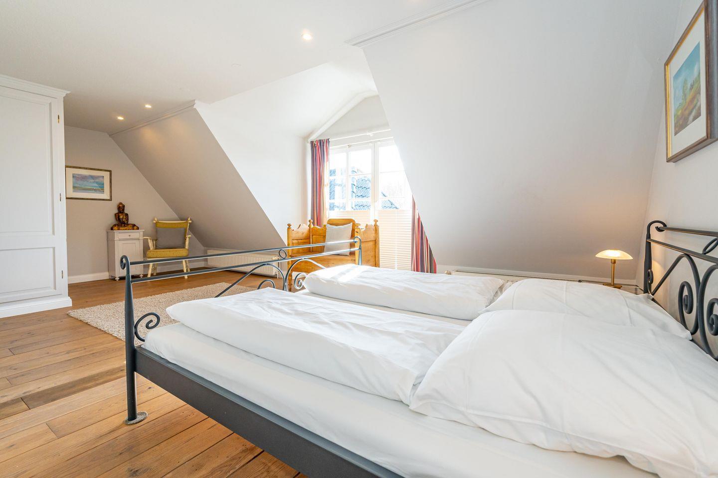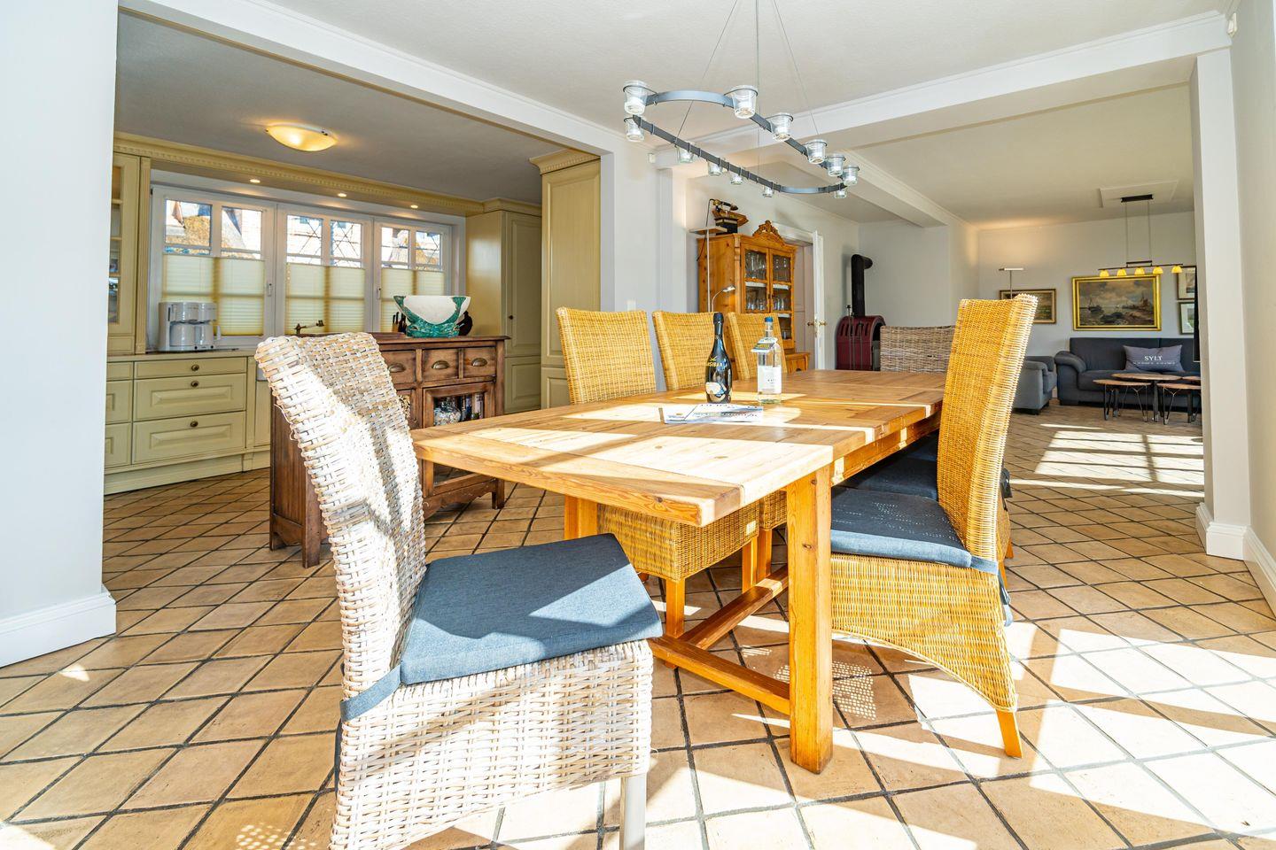 In einer traumhaft ruhigen Seitenstraße im Süden Westerlands befindet sich das schöne Landhaus Nici nur wenige Gehminuten vom Strand entfernt. Auch der Ortskern ist fußläufig gut und schnell erreichbar. Im Erdgeschoss des Hauses erwartet Sie ein heller, großzügiger Wohn- und Essbereich, der zum gemeinsamen Verweilen einlädt. Von hier aus gelangen Sie auf die wunderschöne Südterrasse samt Gartenmöbeln und Strandkorb. Der angrenzende Garten darf anteilig bis zu der imaginären Grenze zwischen den Hortensien genutzt werden (anteilig, damit die Gäste aus dem Bungalow nicht gestört werden). In der offenen, voll ausgestatteten Küche finden Sie einen Side by Side Kühlschrank mit Eiswürfelspender, einen Herd mit Cerankochfeld sowie einen Backofen als auch eine Filterkaffeemaschine, einen Toaster sowie einen Wasserkocher vor. Die Küche bietet alles, was für einen gemeinsamen Kochabend mit Freunden oder der Familie benötigt wird. Im 1. Obergeschoss erwarten Sie drei großzügige Doppelschlafzimmer mit schönem Holzdielenboden, die jeweils mit Flachbildfernsehern ausgestattet sind. Das große Tageslichtbad verfügt über eine tolle Eckbadewanne, eine separate Dusche mit Infrarotkabine, einem WC sowie einem Bidet. Im 2. Obergeschoss finden Sie ein weiteres kleines Duschbad mit WC vor. Auf dem wunderschönen Grundstück befindet sich neben dem Landhaus zudem noch das App. Nici sowie der Bungalow Nici, welche wunderbar gemeinsam für größere Familienzusammenkünfte gemietet werden können. Das Landhaus Nici verfügt über einen PKW-Stellplatz vor der Garage. Weitere öffentliche Parkmöglichkeiten befinden sich zudem direkt vor dem Haus. Kostenloses WLAN ist vorhanden, zwei Hunde sind erlaubt.