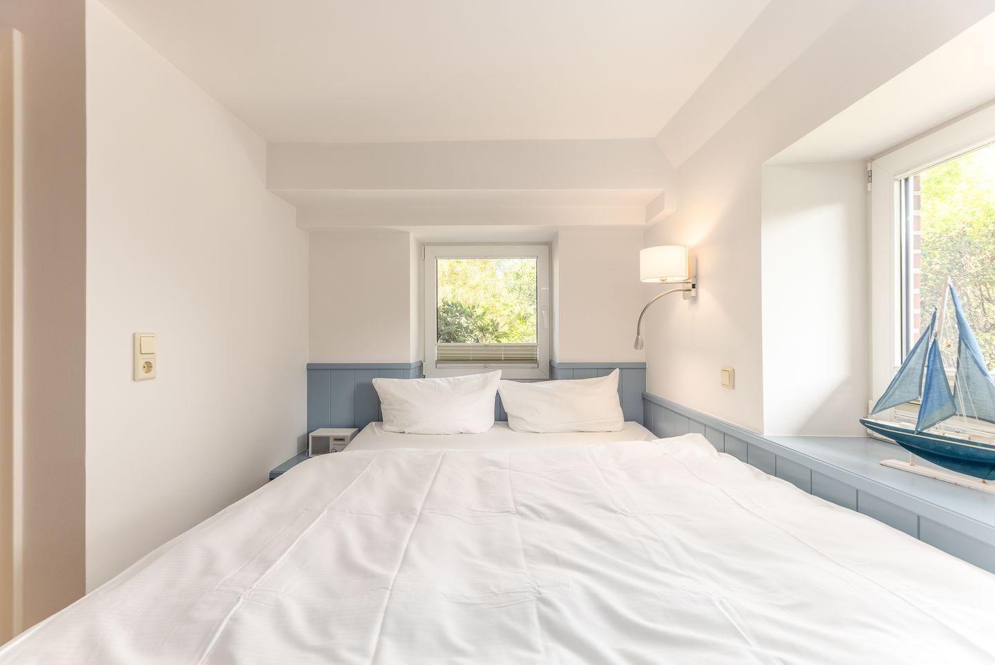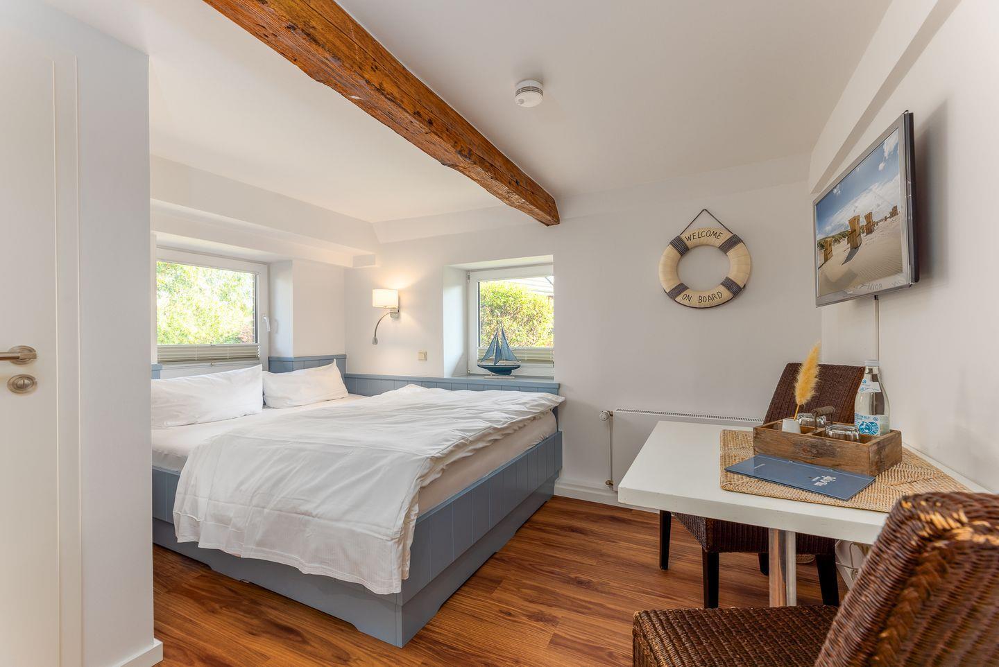 Ganz in Weiß und als Kontrast dazu ein dunkler Holzboden präsentiert sich der Captains Room als cosy Doppelzimmer.
