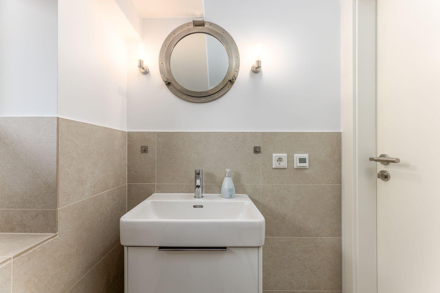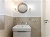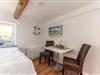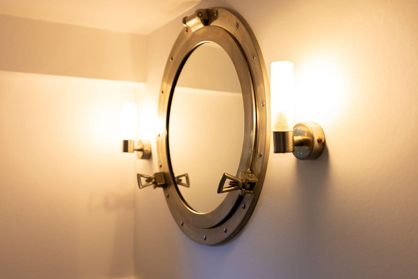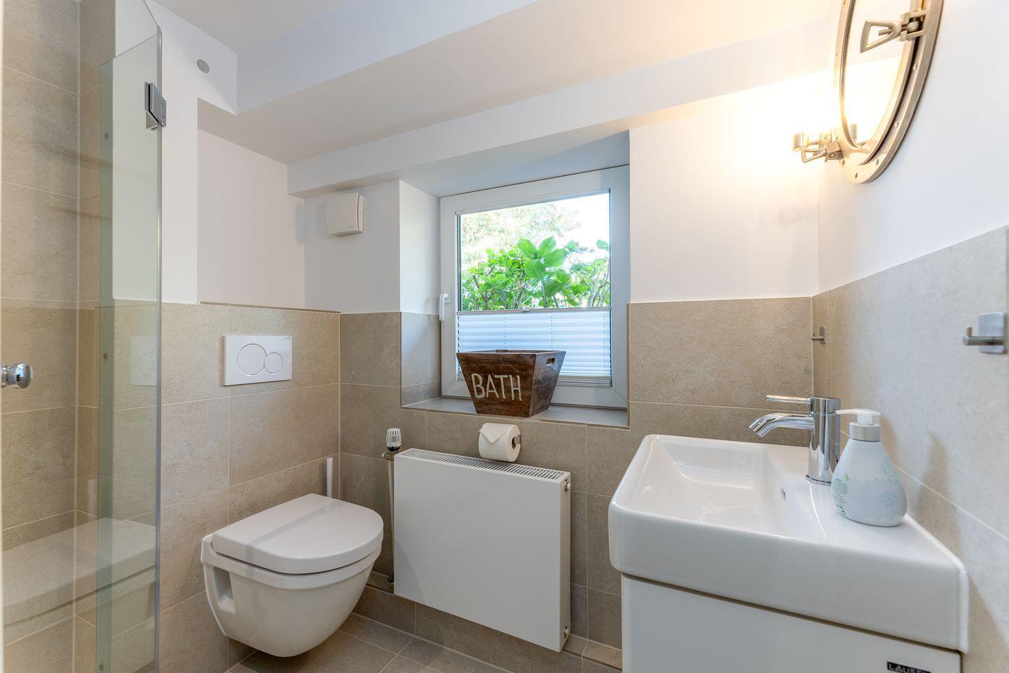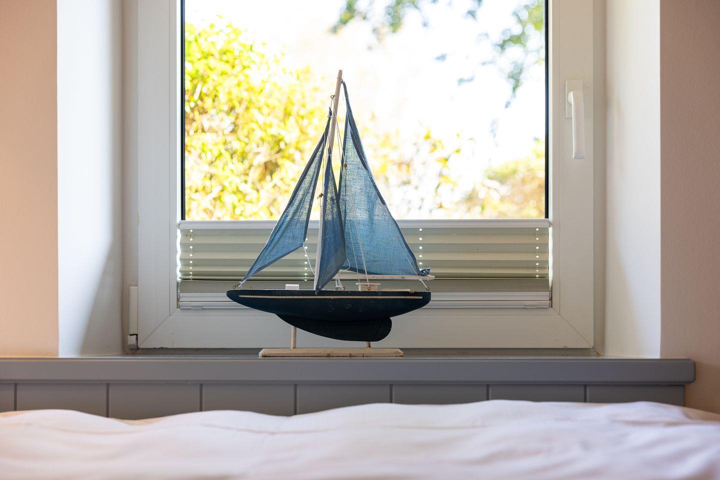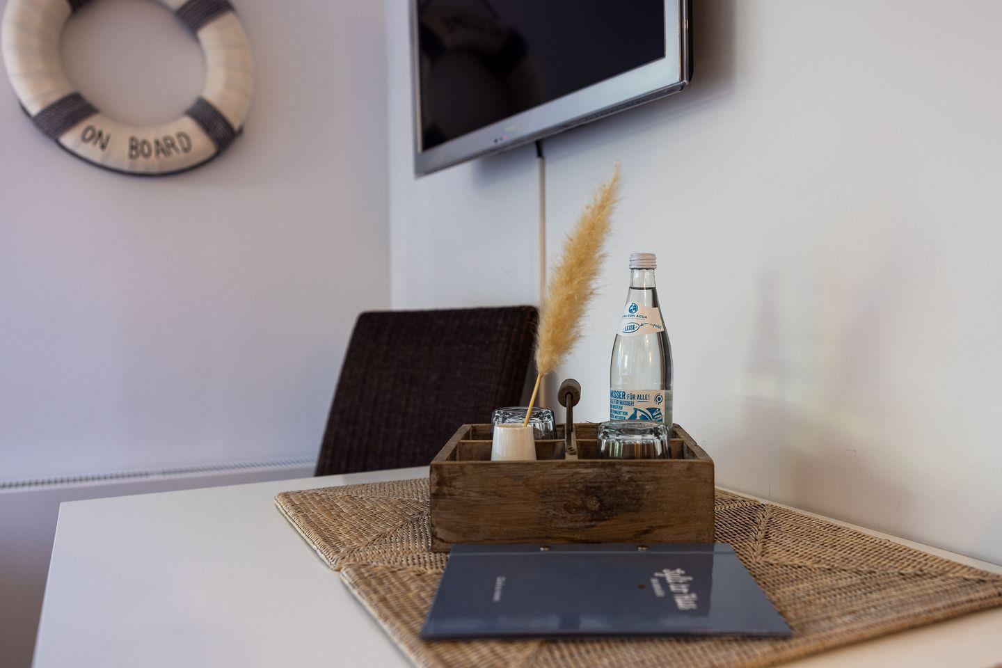 Hier wurde alles passgenau vom Tischler angefertigt und der Raum dadurch aufs Beste genutzt. Kein Schnickschnack nur ein paar ausgewählte maritime Accessoires lenken den Blick auf das Wesentliche, in diesem Fall das gemütliche Doppelbett (1,60 x 2,00m) samt seiner rückenfreundlichen Matratze. Dazu noch ein Einbauschrank, der genug Platz für die Urlaubsgarderobe bietet sowie ein kleiner Tisch mit Stühlen. In dem modernen Duschbad werden mit Sand und Weiß sanfte Töne angeschlagen und der Spiegel hier macht bereits morgens Lust auf das Meer. Zusammengefasst das perfekte Zimmer für eine kleine Auszeit auf Sylt!