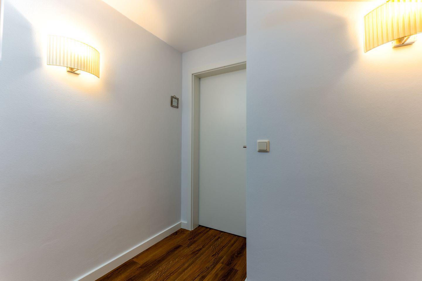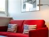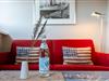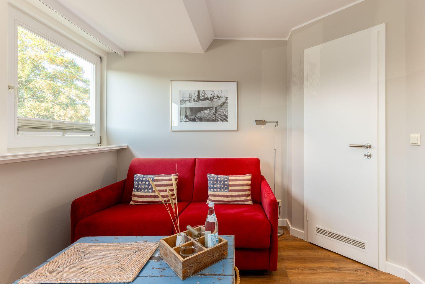Klasse Kombi: Weiß, ein dunkler Holzfußboden und dazu noch ein Klecks Rot. Dieser freundliche Mix zieht sich durch beide Zimmer und lässt es überraschend großzügig wirken. Im Wohnbereich eine bequeme Couch in Signalfarbe, die sich wunderbar mit den maritimen Accessoires verträgt. Dazu noch Tischlereinbauten für genügend Stauraum.Suite dreams: Das Schlafzimmer ist mit einem bequemen Polsterbett, einem TV und ausreichend Schränken zum Verstauen ausgestattet. Das moderne Duschbad mag es clean und ist ganz in Weiß gehalten.