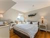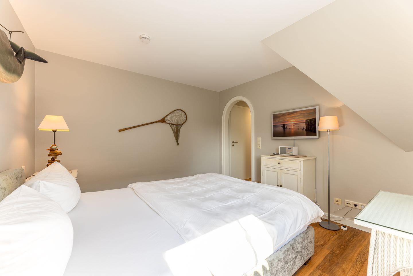 Ganz viel Gemütlichkeit in nur einem Raum. Herzstück hier ist das samtige Polsterbett über dem ein Wal über den Schlaf wacht. Rundherum haben sich ein Tisch mit Stühlen sowie eine Kommode nebst TV versammelt. Im Flur dann ein geräumiger Einbauschrank und abschließend noch das helle und moderne Duschbad. Mehr braucht es nicht zum Wohlfühlen. Zusammengefasst das perfekte Zimmer für eine kleine Auszeit auf Sylt!