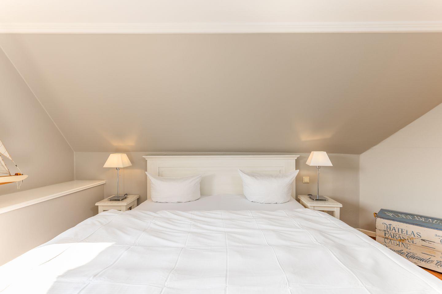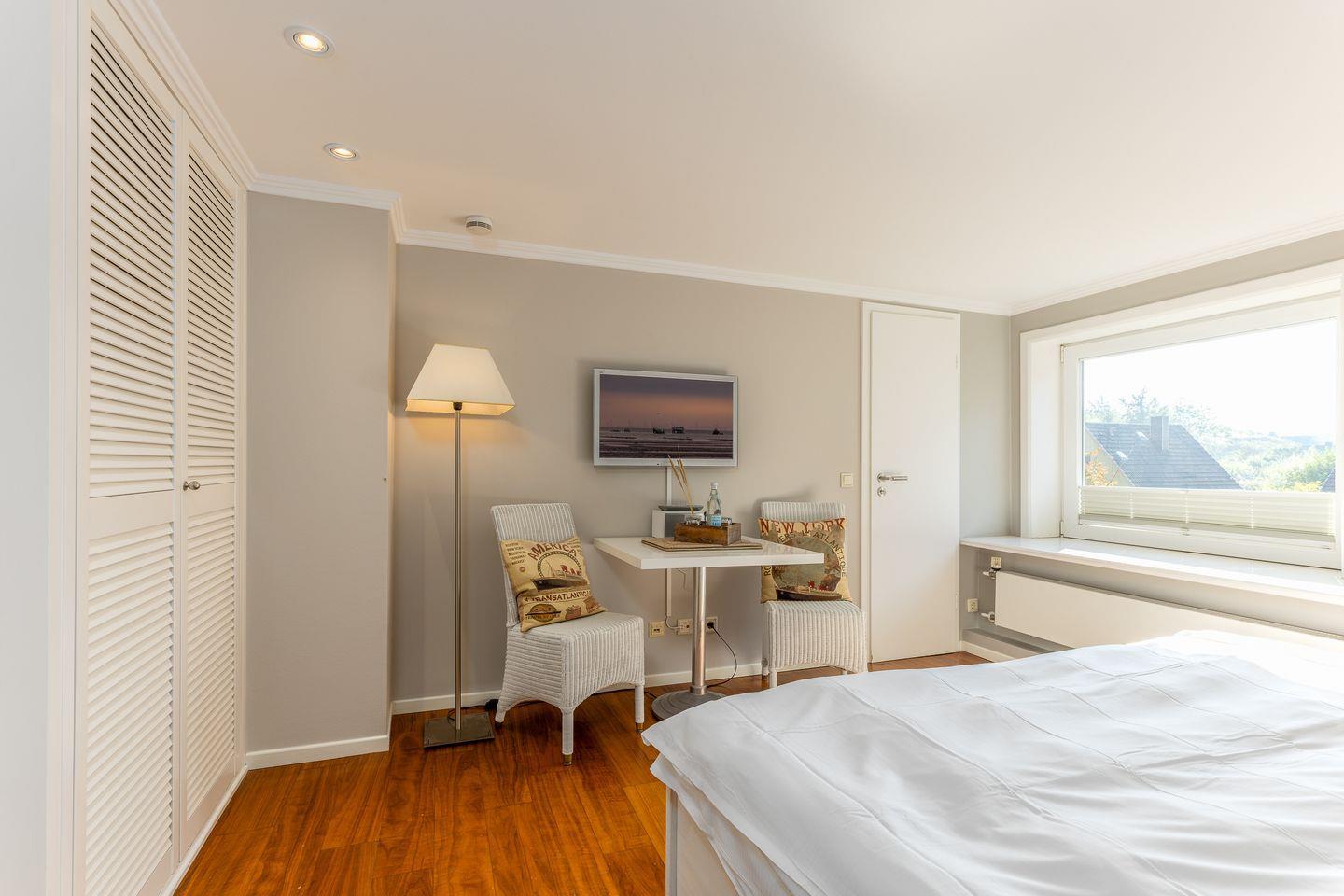 Hier wurde alles passgenau vom Tischler angefertigt und somit ist ein gemütliches Wohlfühldomizil entstanden. Das komfortable Doppelbett verfügt über eine rückenfreundliche Matratze und Blick auf den Fernseher. Ein Einbauschrank bietet genug Platz für die Urlaubsgarderobe und eine kleine Sitzgelegenheit gibt es ebenfalls. In dem hellen und modernen Duschbad werden mit Sand und Weiß sanfte Töne angeschlagen. Hier lässt es sich wunderbar in den Tag starten, bevor es ans Erkunden der Insel geht. Zusammengefasst das perfekte Zimmer für eine kleine Auszeit auf Sylt!