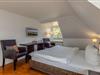 Hier wurde alles passgenau vom Tischler angefertigt und somit ist ein gemütliches Wohlfühldomizil entstanden. Das komfortable Polsterbett verfügt über eine rückenfreundliche Matratze und Blick auf den Fernseher. Ein Einbauschrank bietet genug Platz für die Urlaubsgarderobe und eine kleine Sitzgelegenheit gibt es ebenfalls. In dem hellen und modernen Duschbad werden mit Sand und Weiß sanfte Töne angeschlagen. Hier lässt es sich wunderbar in den Tag starten, bevor es ans Erkunden der Insel geht. Zusammengefasst das perfekte Zimmer für eine kleine Auszeit auf Sylt!