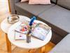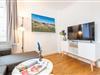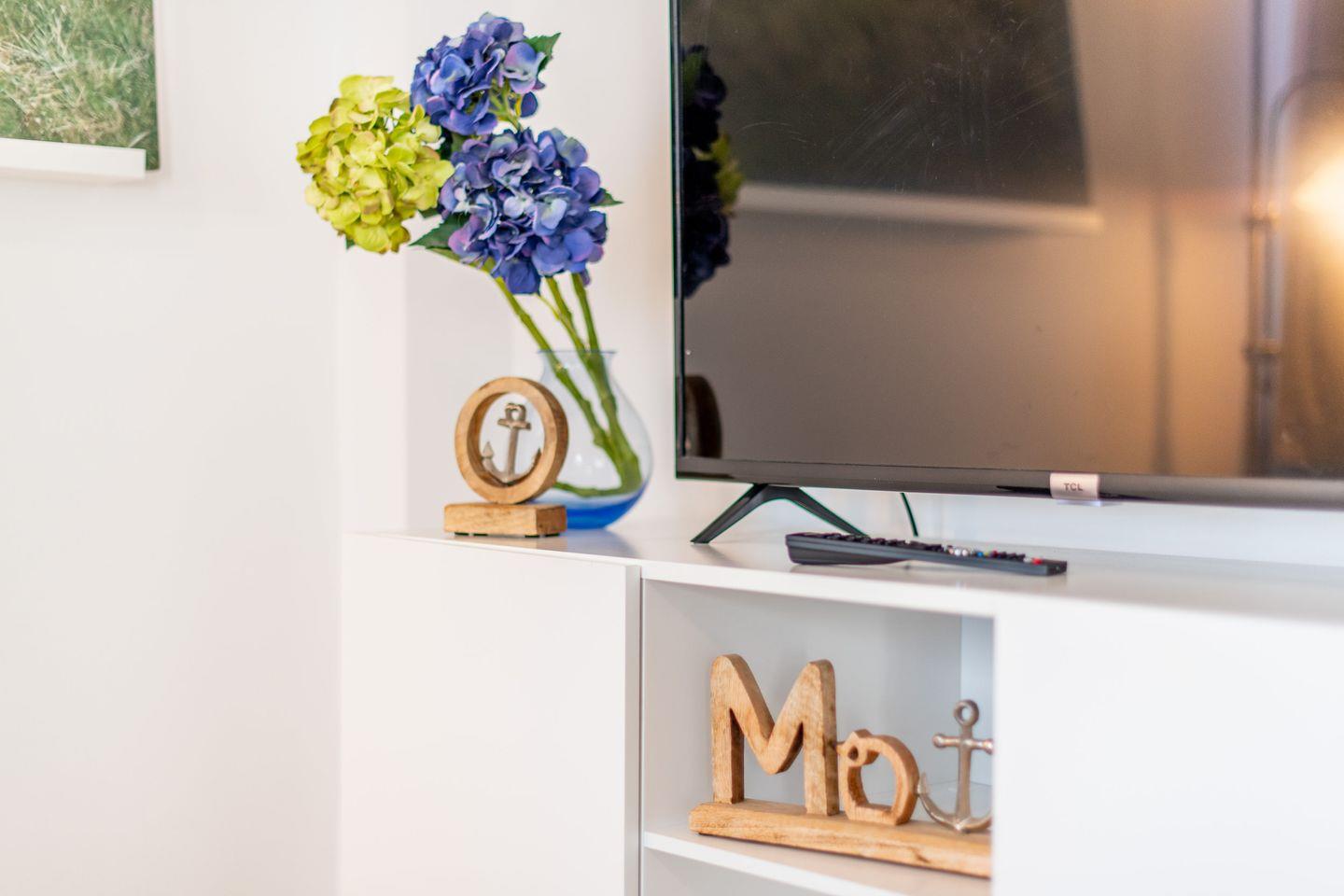 Das helle und modern gestaltete Wohnzimmer bietet eine gemütliche Sofaecke, einen Sessel und einen TV, ideal für entspannte Abende. Von hier aus haben Sie direkten Zugang zur möblierten Terrasse nach Süden, wo Sie die Sonne genießen können.