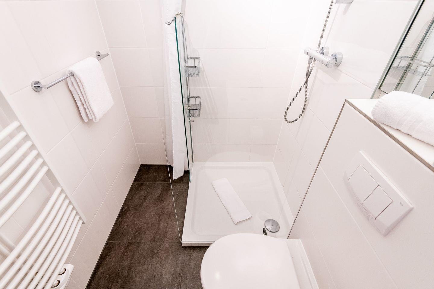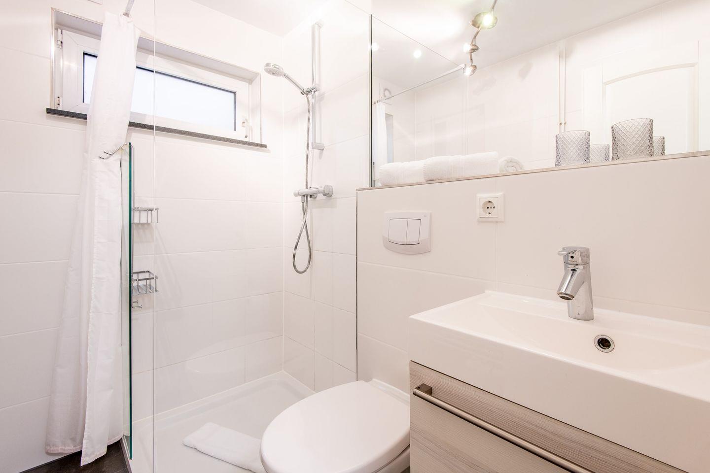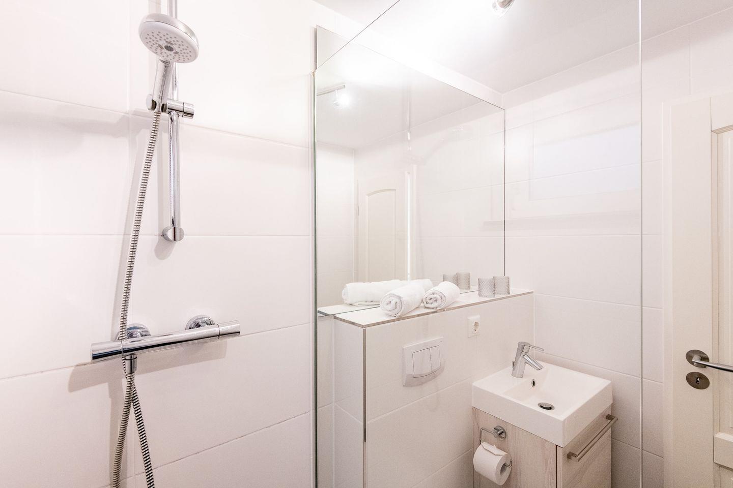 Das erste Badezimmer ist mit einer Dusche, WC und Tageslicht ausgestattet. Das zweite Badezimmer verfügt über eine Dusche, WC und Föhn.