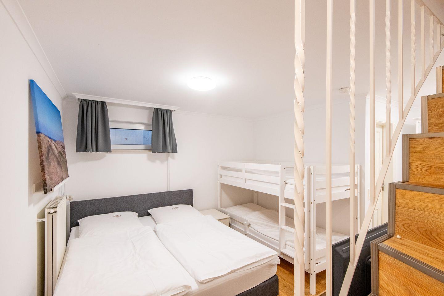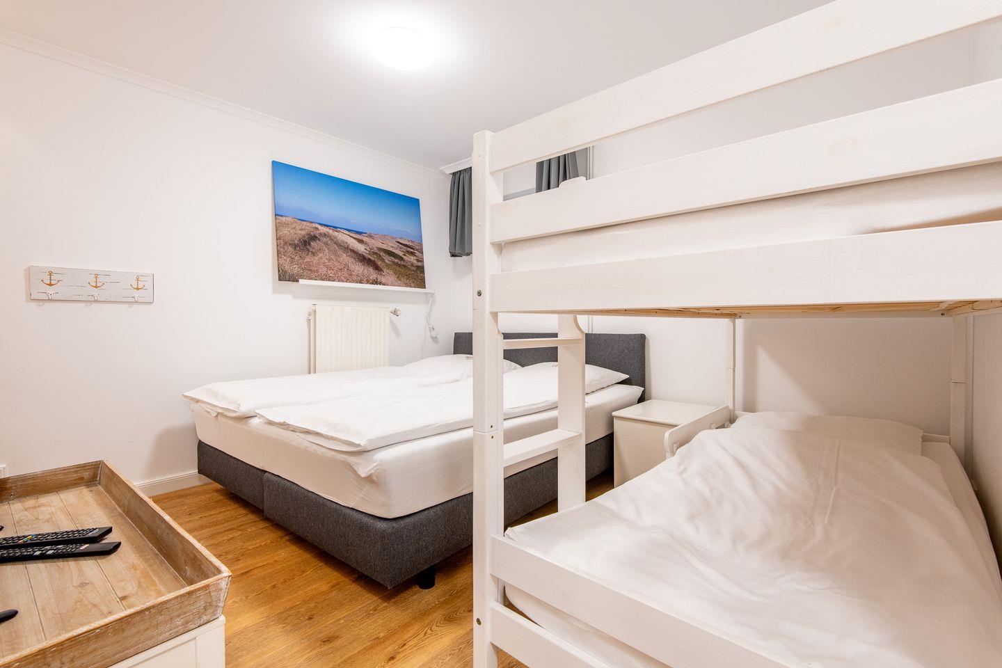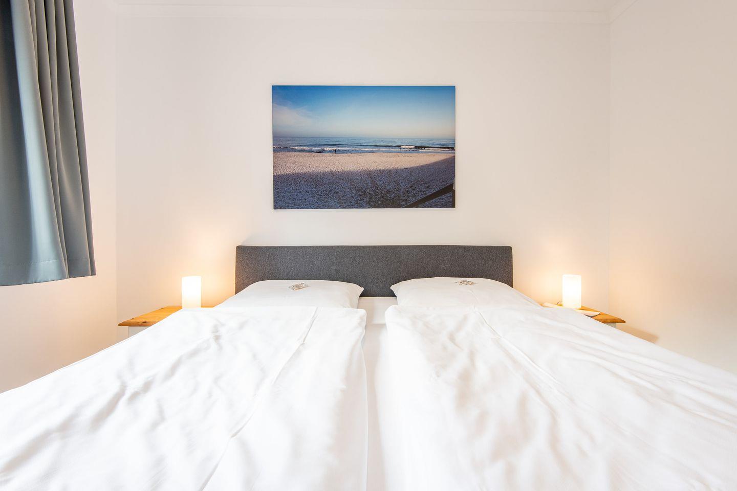 Das erste Schlafzimmer ist mit einem Boxspringbett (2x 90x200 cm) und einem geräumigen Kleiderschrank ausgestattet. Das zweite Schlafzimmer verfügt ebenfalls über ein Boxspringbett (2x 90x200 cm) und einen Kleiderschrank und bietet zusätzlich ein Etagenbett (2x 90x200 cm) – perfekt für Kinder.