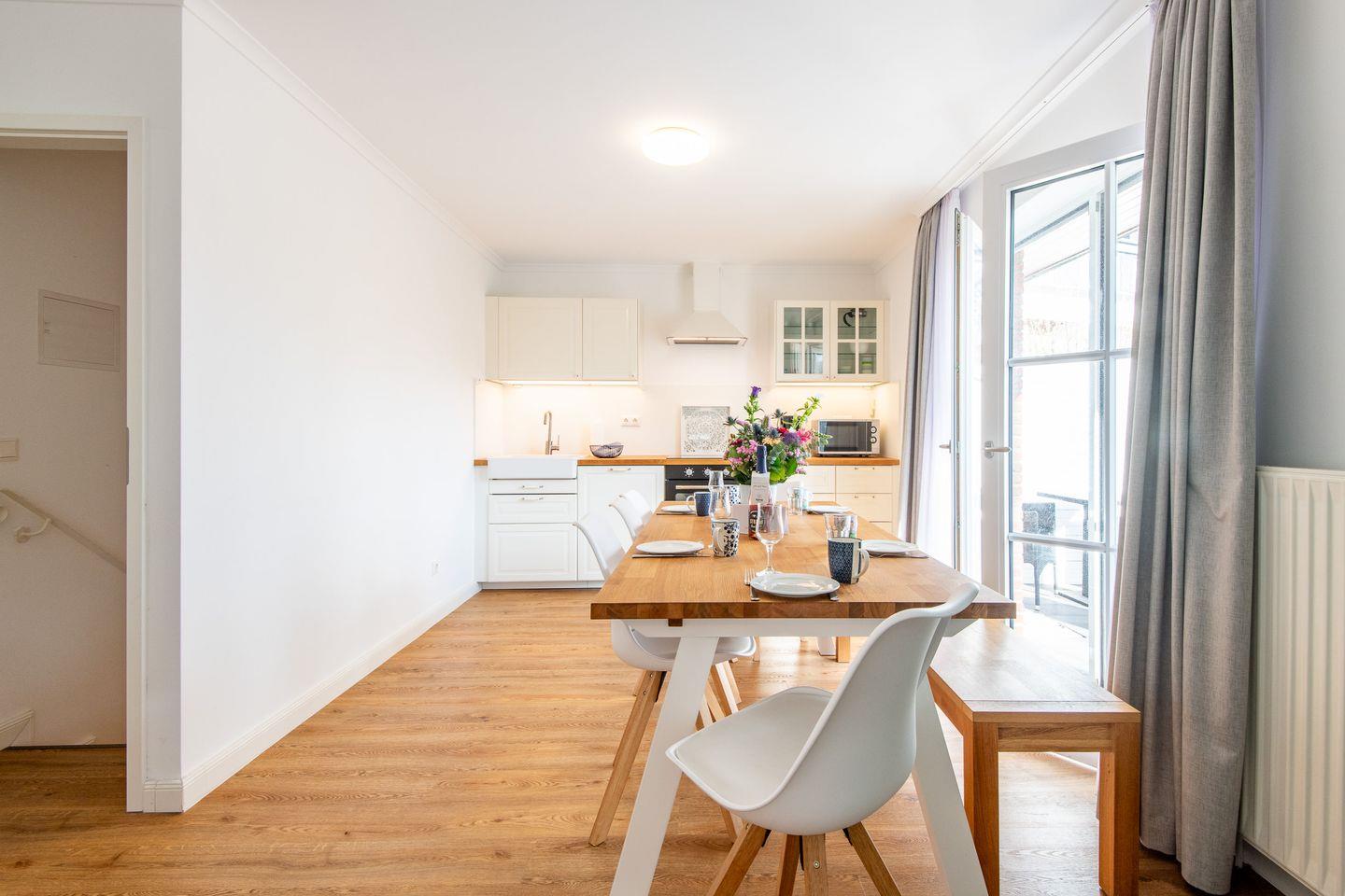 Die offene Küche ist vollständig ausgestattet und verfügt über einen Geschirrspüler sowie eine große Kühl-/Gefrierkombination, die für größere Gruppen ideal ist. Ein großer Esstisch bietet Platz für gemeinsame Mahlzeiten und gesellige Stunden.