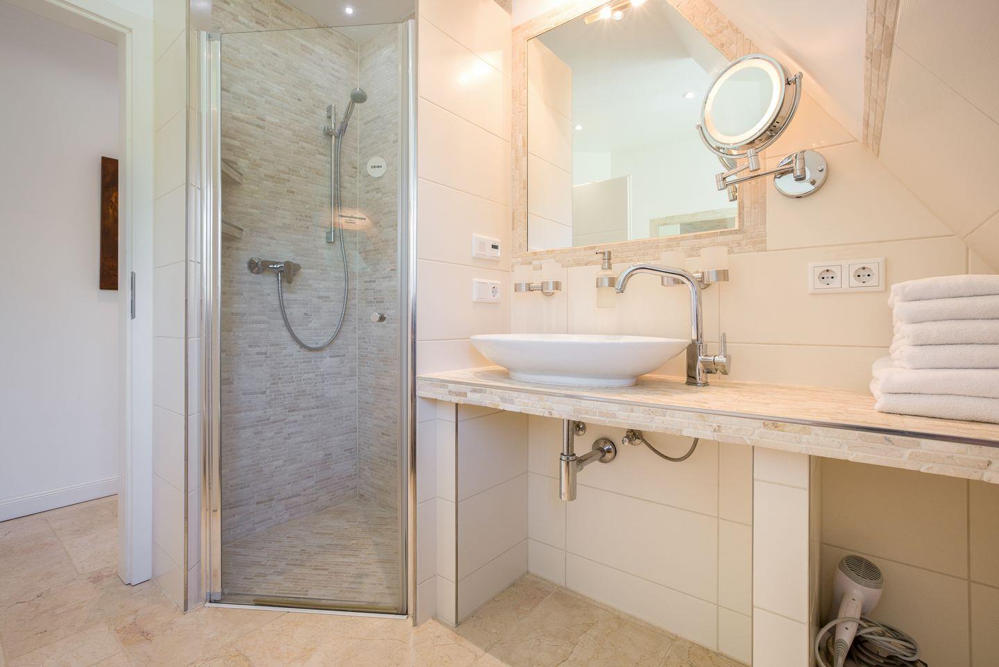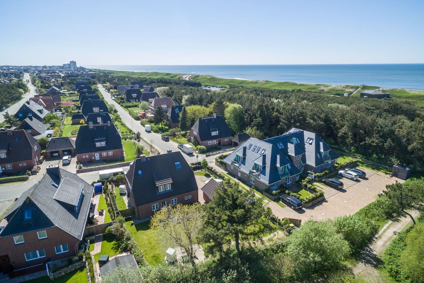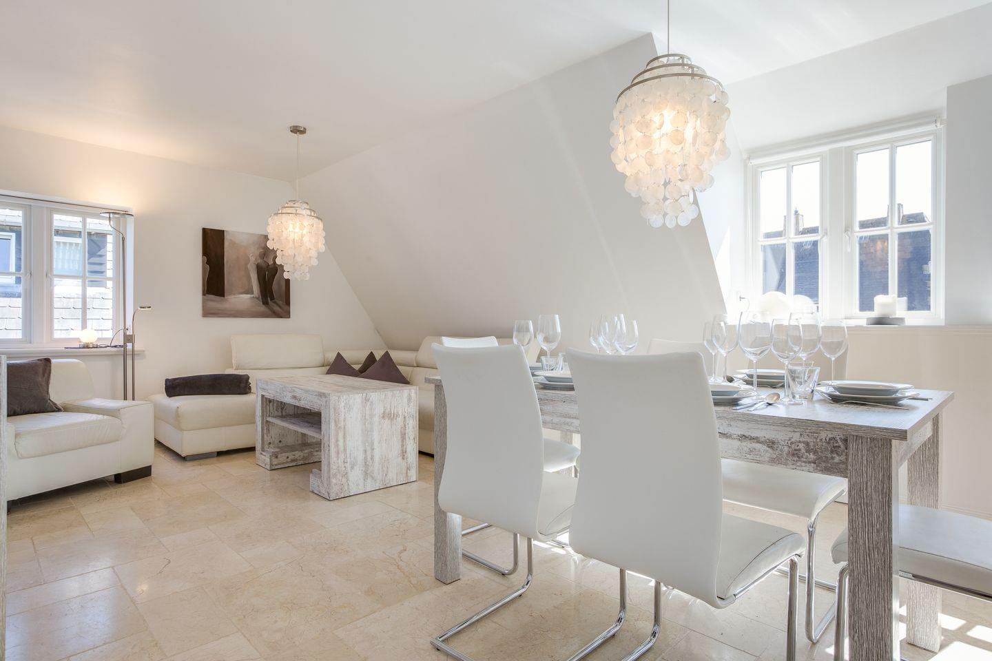 Diese familienfreundliche ca. 130 m² große Ferienwohnung für bis zu 6 Personen befindet sich in direkter Strandlage und verläuft über zwei Ebenen. "White Pearl OG" bietet Ihnen eine luxuriöse Ausstattung und absoluten Komfort. Die offene, moderne Küche samt Geschirrspüler ist voll ausgestattet und lädt zum gemeinsamen Kochen ein. Genießen Sie entspannte Urlaubstage im angrenzenden Wohn- und Essbereich. Das Obergeschoss verfügt über zwei Doppelschlafzimmer sowie ein großzügiges Duschbad. Im Dachgeschoss erwarten Sie ein weiteres Doppelschlafzimmer sowie ein Badezimmer samt Dusche und Badewanne. Die kleine Galerie bietet Ihnen die Möglichkeit eines Arbeitsplatzes. Alle Wohnräume sind durch Flat TVs ausgestattet. Nutzen Sie die schöne Terrasse und den angrenzenden Garten mit Gartenmöbeln und einem Strandkorb (in der Saison). Absolute Entspannung bietet Ihnen der gemeinschaftliche Wellnessbereich (2 Parteien), ausgestattet mit einer großzügigen Sauna, Saunadusche und TV. Das Ferienhaus verfügt über WLAN, eine zugehörigen PKW-Stellplatz vor dem Haus, eine Waschmaschine sowie einen Wäschetrockner. Haustiere sind erlaubt. Genießen Sie tagsüber den schönen Ort Westerland sowie die Insel Sylt und lassen Sie den Abend mit der Familie gemütlich am Kamin ausklingen.