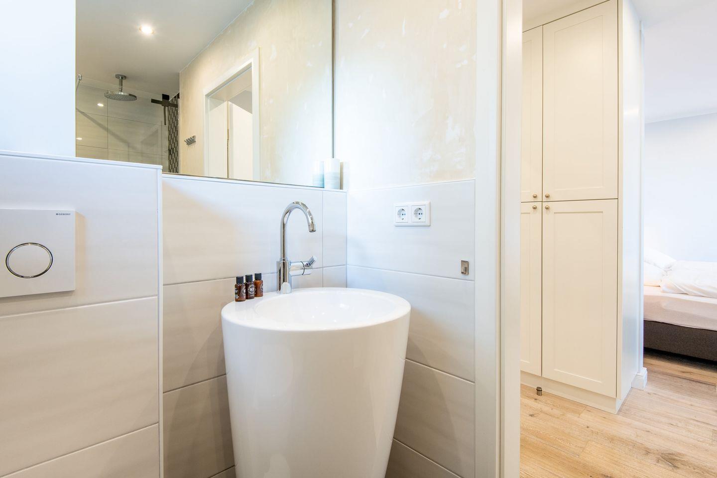 Das großzügige Badezimmer verfügt über eine große Walk-In-Dusche und ein Fenster, das viel Tageslicht hereinlässt – ideal für einen frischen Start in den Tag.