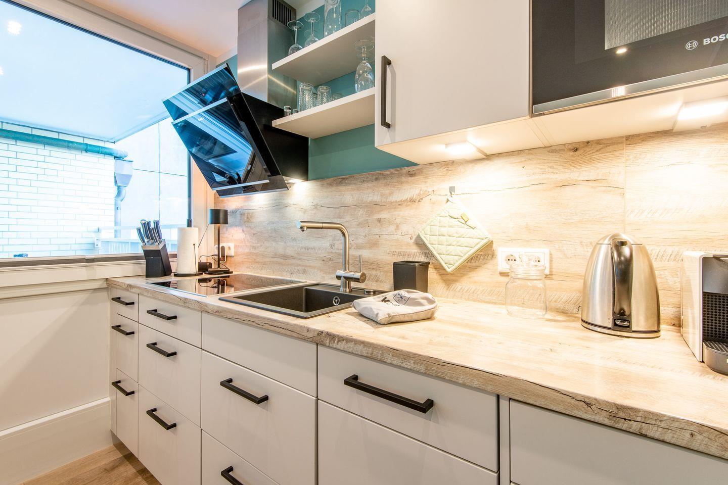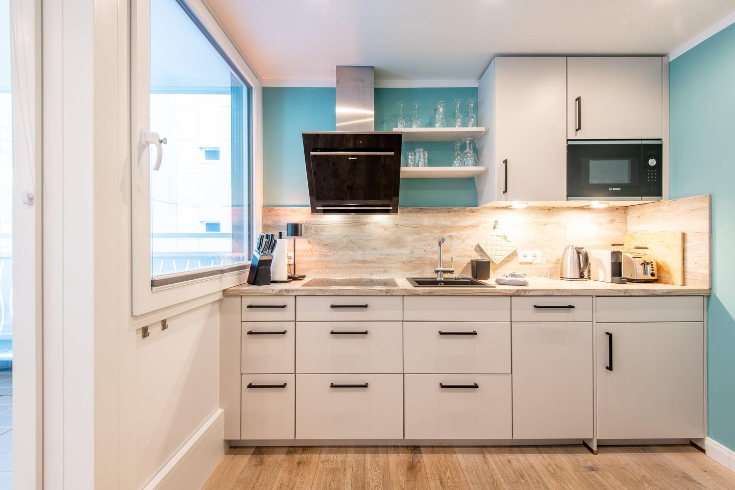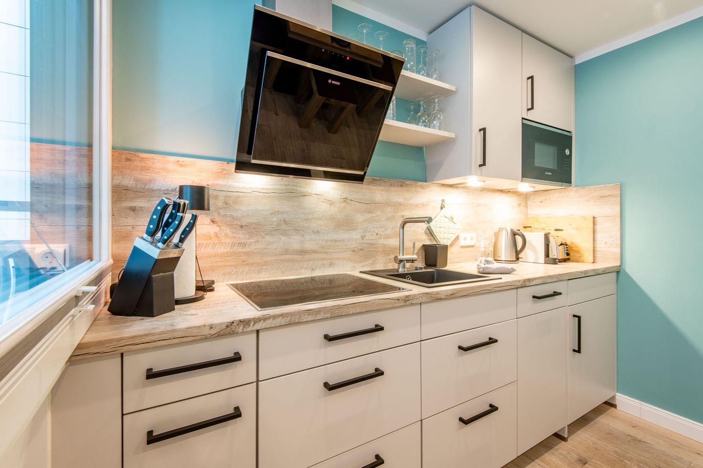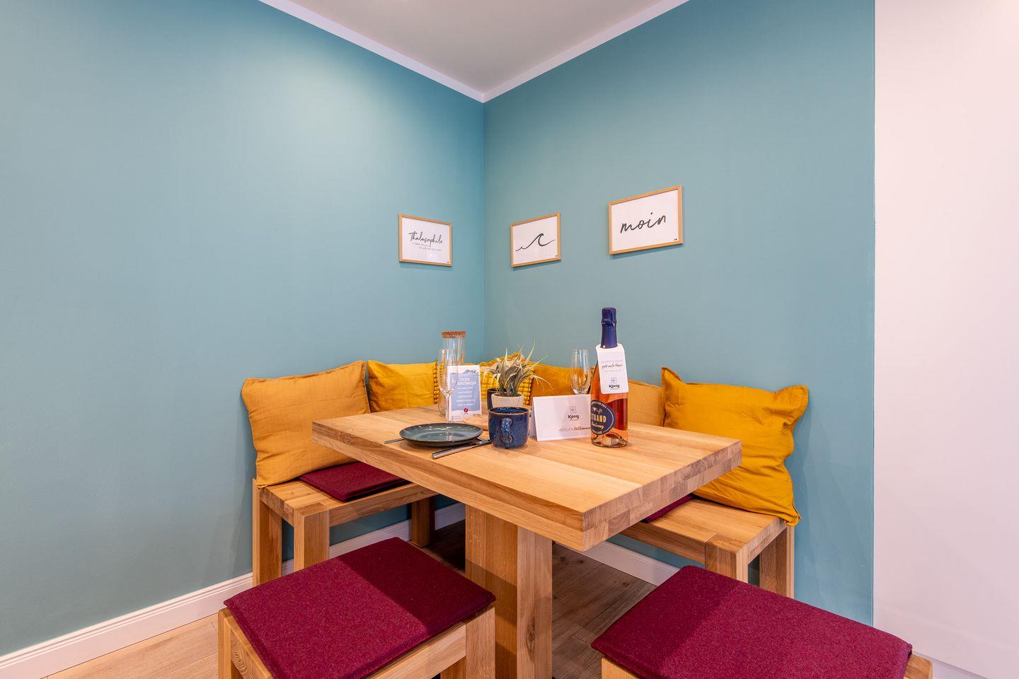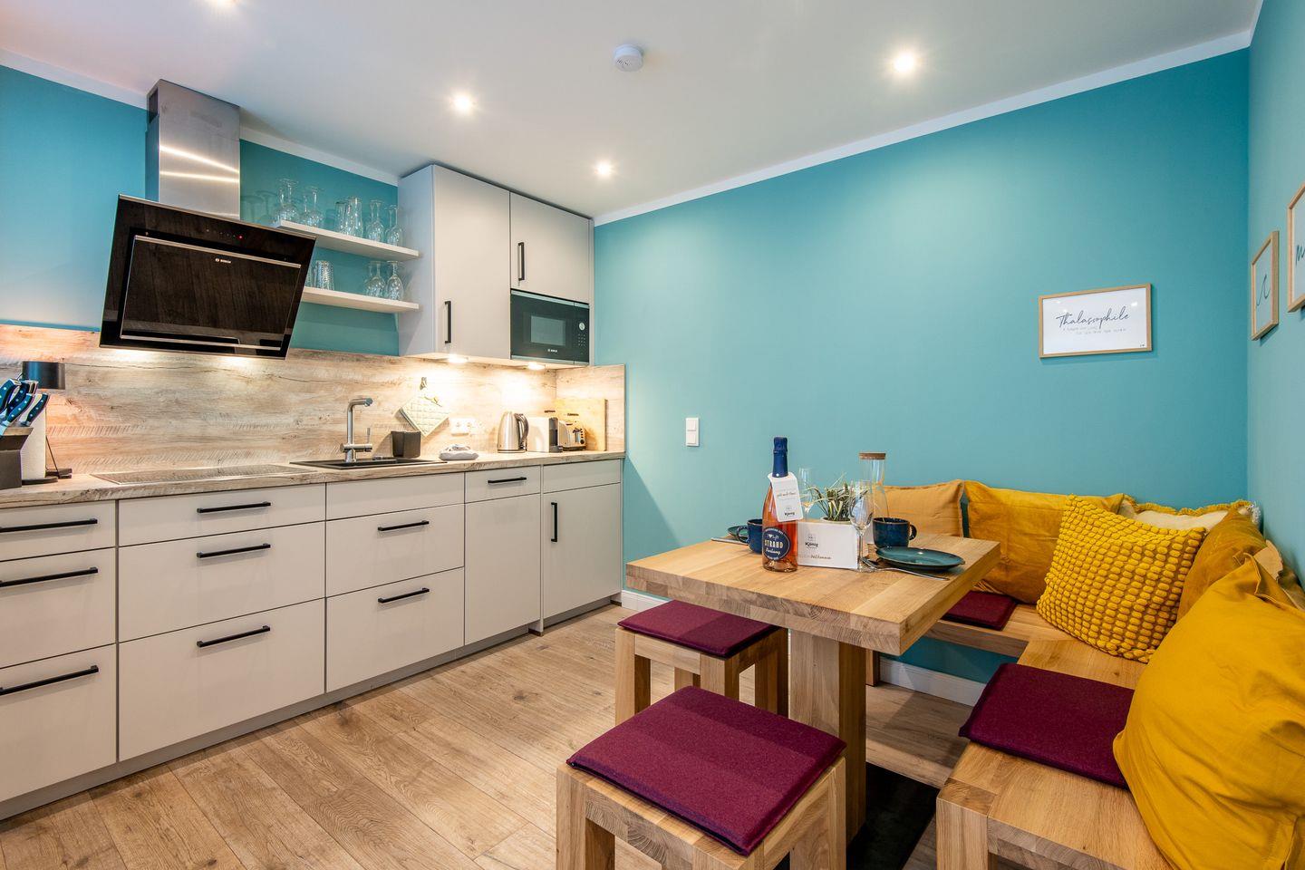 Die Küche ist modern eingerichtet und verfügt über eine gemütliche Sitzecke. Mit einer voll ausgestatteten Einbauküche, inklusive Geschirrspüler, bietet sie allen Komfort, um Ihre Mahlzeiten zuzubereiten.