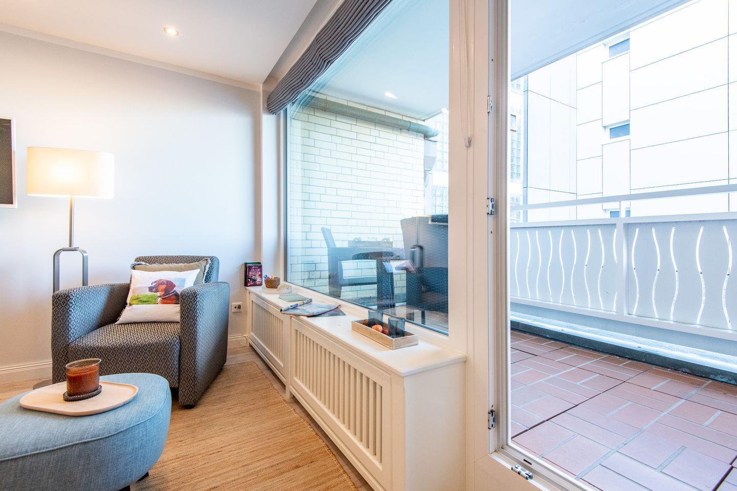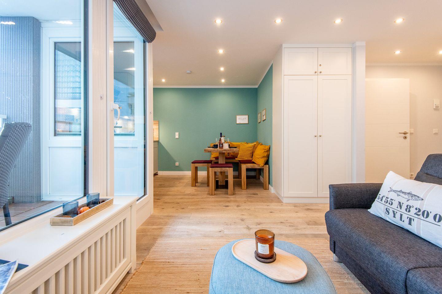 Moderne und gut ausgestattete 1-Zi.-Whg. mit ca. 38 qm (1. OG) fu¨r bis zu 2 Personen (auf Anfrage mit Kind/Zusatzperson) in Mitten von Westerland, Balkon zur „Neuen Mitte“, barreierearm gestaltet durch den Fahrstuhl im Haus, Waschmaschine und Trockner zur gemeinschaftlichen Nutzung vorhanden, Tiefgaragen-Stellplatz (Einfahrtsbeschränkung Höhe max. 2,10 m) sowie Fahrradabstellplätze, WLAN (ohne Gewähr) vorhanden.