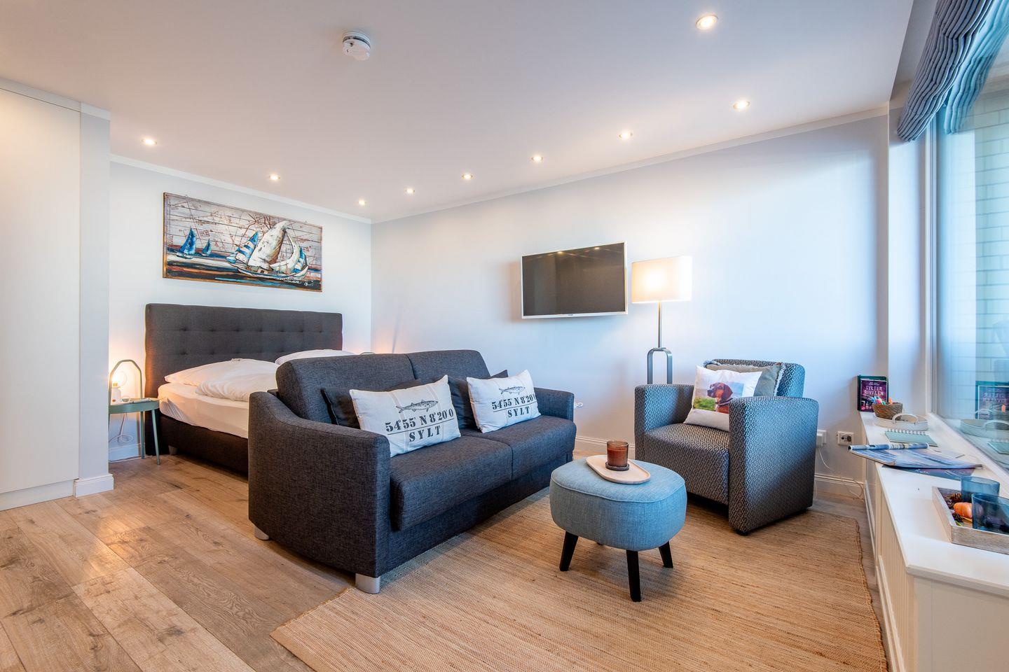 Der helle Wohn- und Schlafbereich ist mit einem bequemen Sofa und einem großen Boxspringbett ausgestattet. Von hier aus haben Sie direkten Zugang zum ruhigen Balkon, der perfekt ist, um Ihr Frühstück am Morgen oder ein Glas Wein am Abend zu genießen.