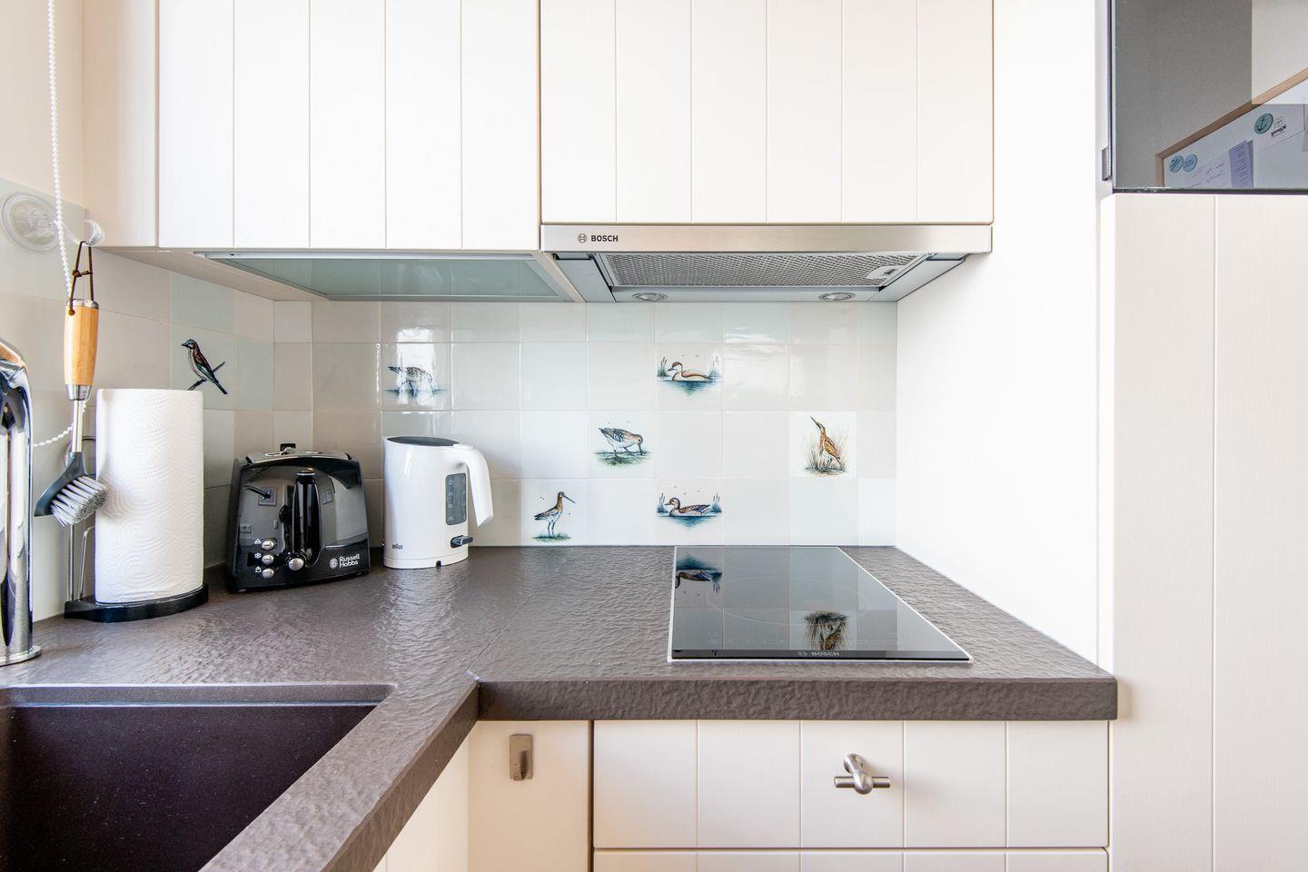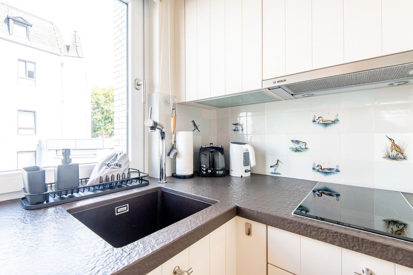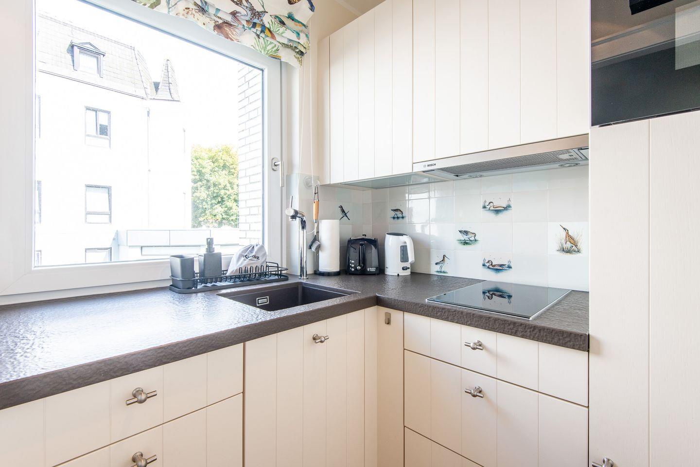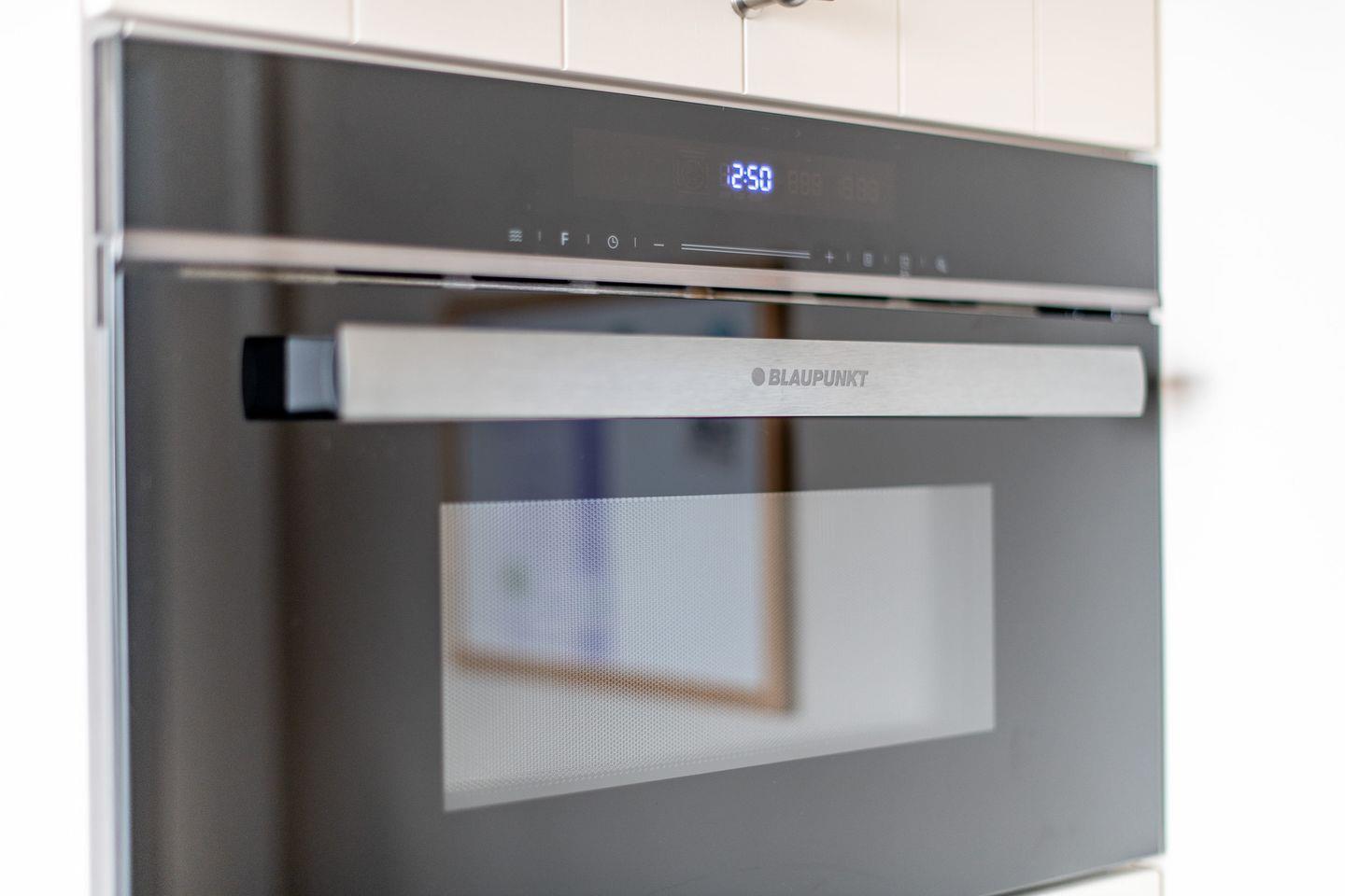 Die offene Küche ist modern ausgestattet und bietet alles Nötige für die Zubereitung Ihrer Lieblingsgerichte – inklusive einer Mikrowelle mit Backofenfunktion, die zusätzlichen Komfort bietet.