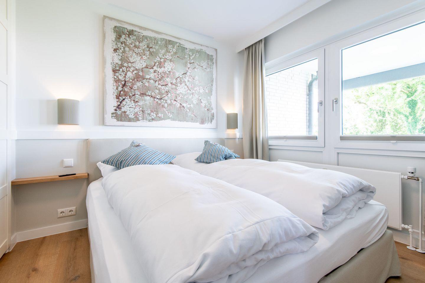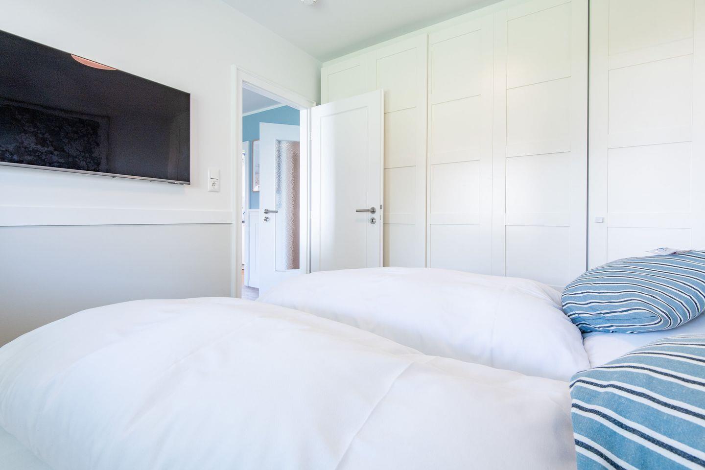 Das Schlafzimmer verfügt über ein komfortables Doppelbett (180x200 cm) und einen geräumigen Kleiderschrank, der ausreichend Stauraum bietet. Hier können Sie nach einem aktiven Inseltag Ruhe und Erholung finden.