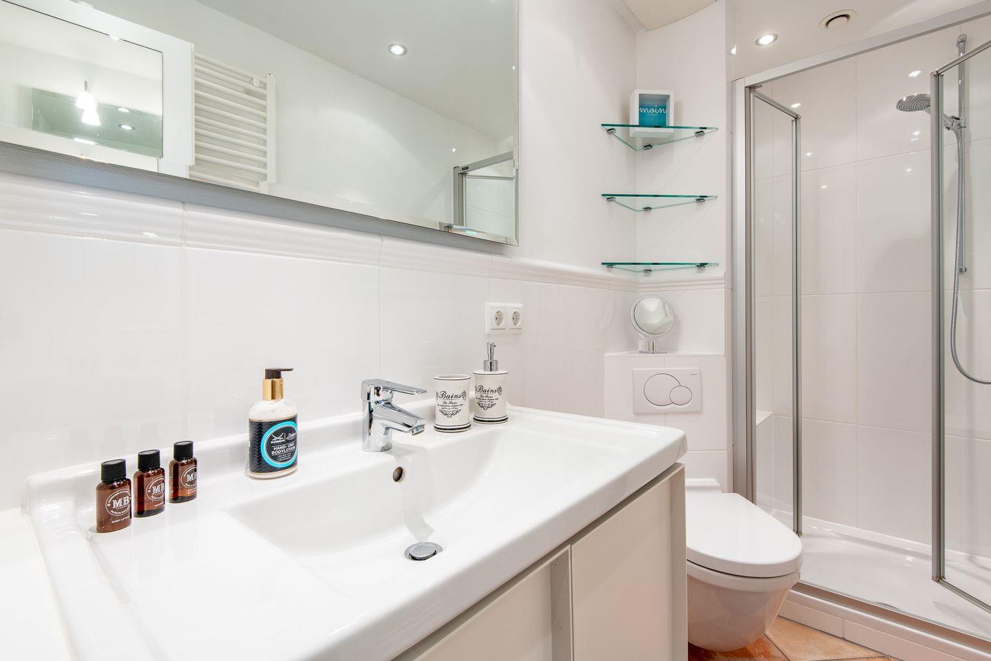 Das Badezimmer ist mit einer Dusche und WC ausgestattet und ergänzt den modernen Komfort der Wohnung.